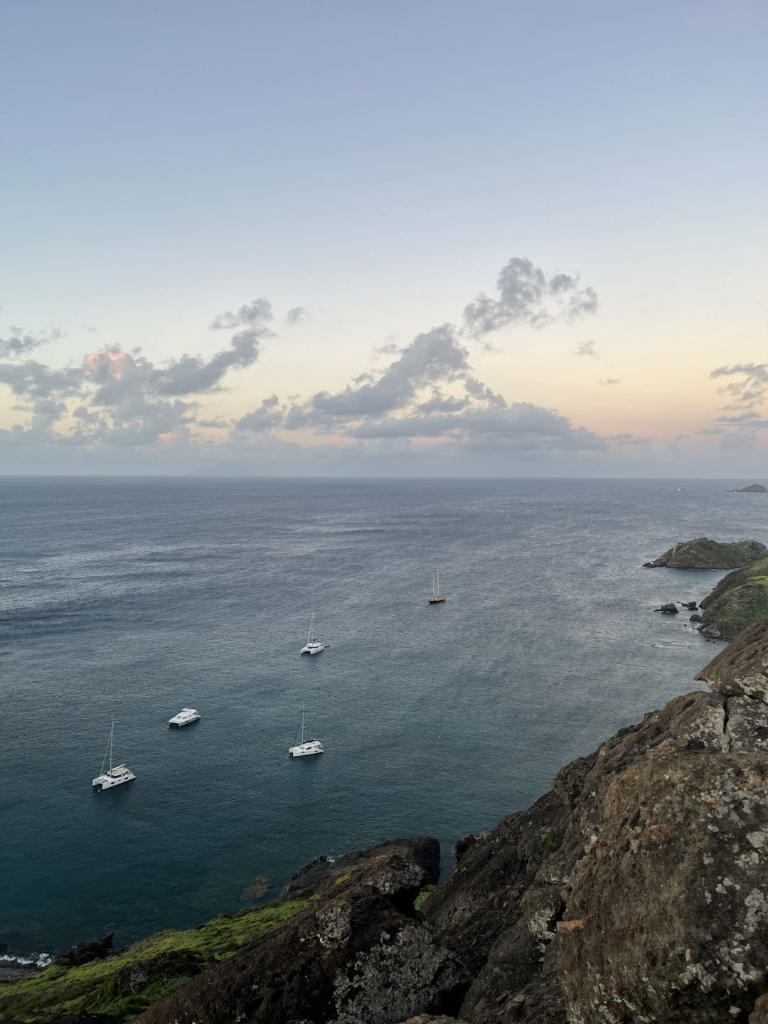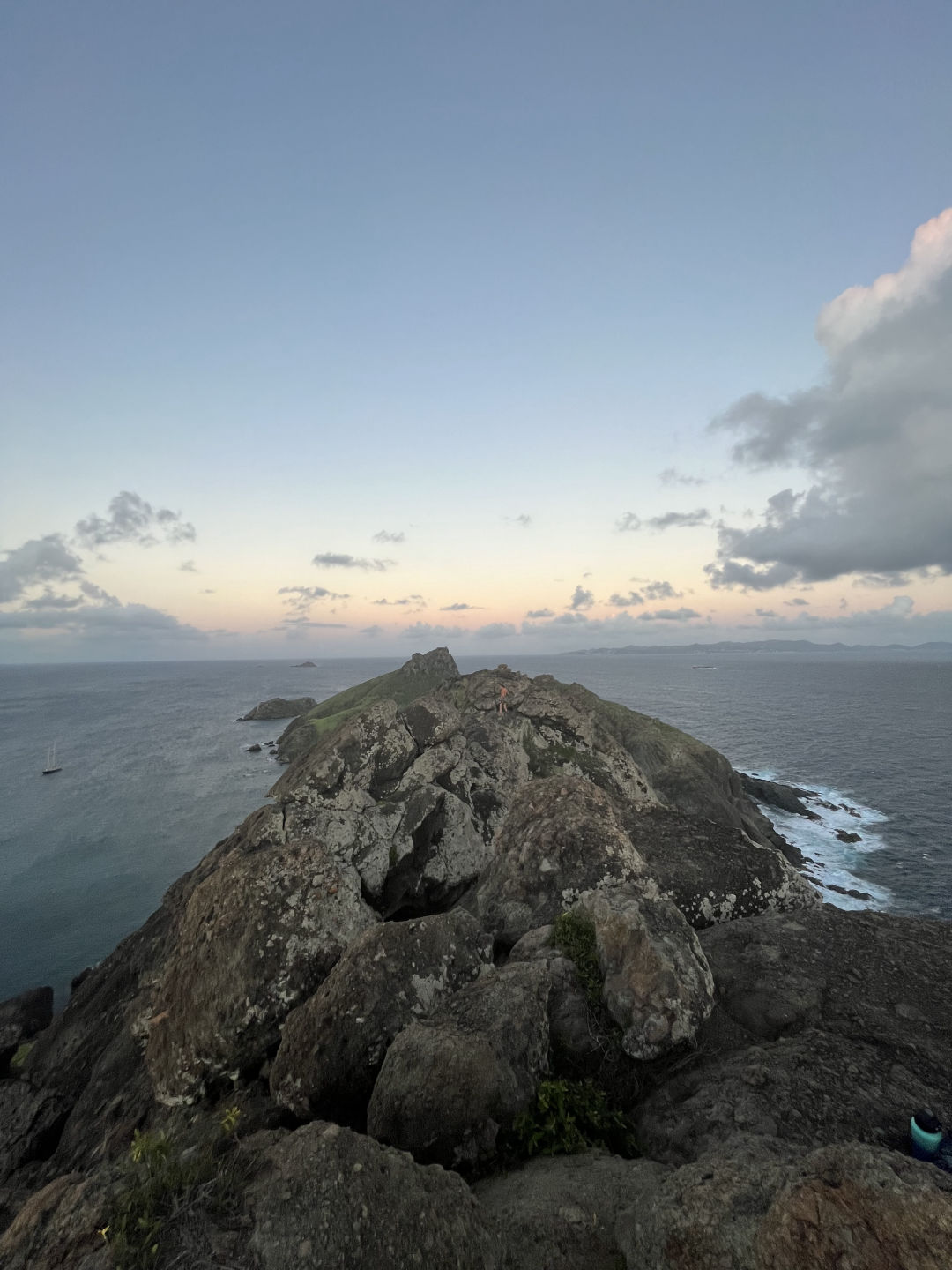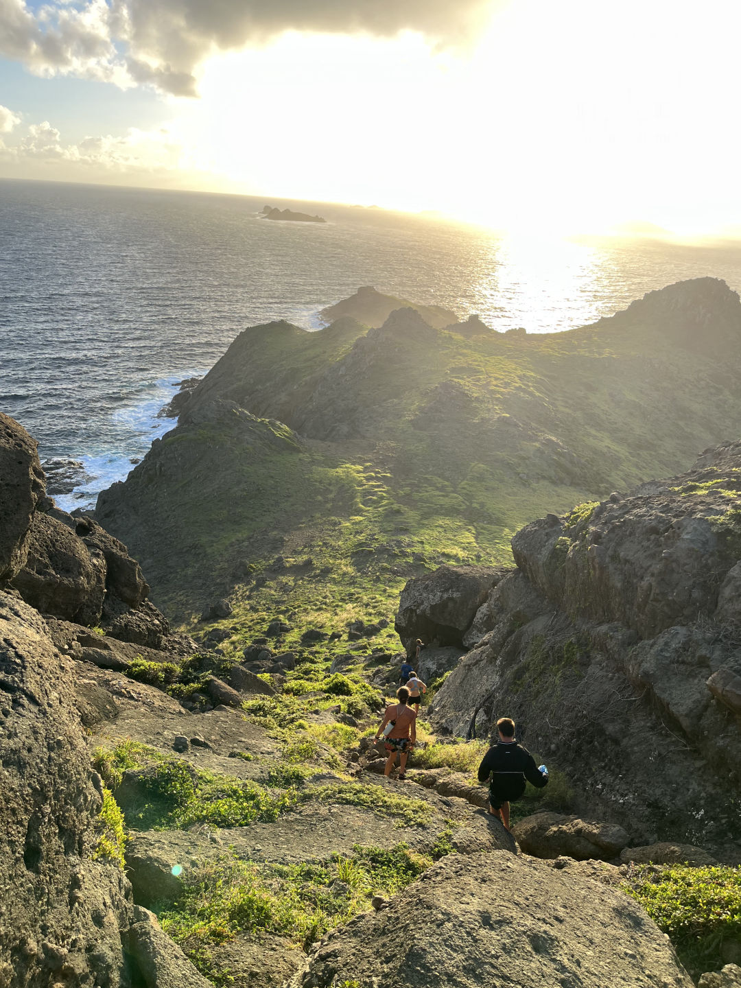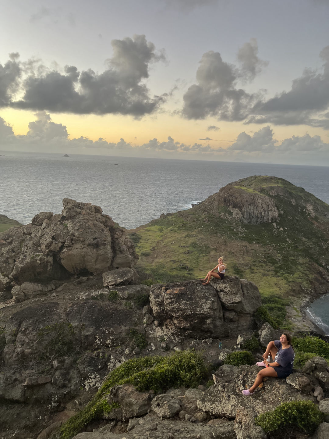 The day started for me at 5 am for another amazing sunrise hike in lle Fourchue. I filled my thermos with a hefty pour of instant coffee and grabbed my favorite hat with the hope of catching an amazing sunrise. I will definitely say the wet entry onto the beach took us all by surprise and definitely woke us up. The hike itself was stunning, and I really felt like I was in the Hobbit. The rolling green hills and fun rocky crevices made for great views, but I didn’t expect the path to be half rock climbing. This rock-climbing part most definitely contributed to a coffee-stained shirt, but it didn’t matter because, at the very top, KT, Carli, and I found the most perfect cave there ever was to enjoy the sunrise. We all agreed the cave would be a core memory for years onward– it was THAT special. I really appreciate Heather, who saved my new hat (bought in Les Saints) from flying off the top of the rocky peak and into the abyss. I almost had a heart attack as I watched my hat roll away from me in what felt like slow motion. When I lose a hat, a part of me goes with it. Anyways, the views were gorgeous, and I highly recommend the hike to anyone who has the opportunity to do it, especially during sunrise. After an amazing breakfast of egg sandwiches, we got started on our rescue diving course.