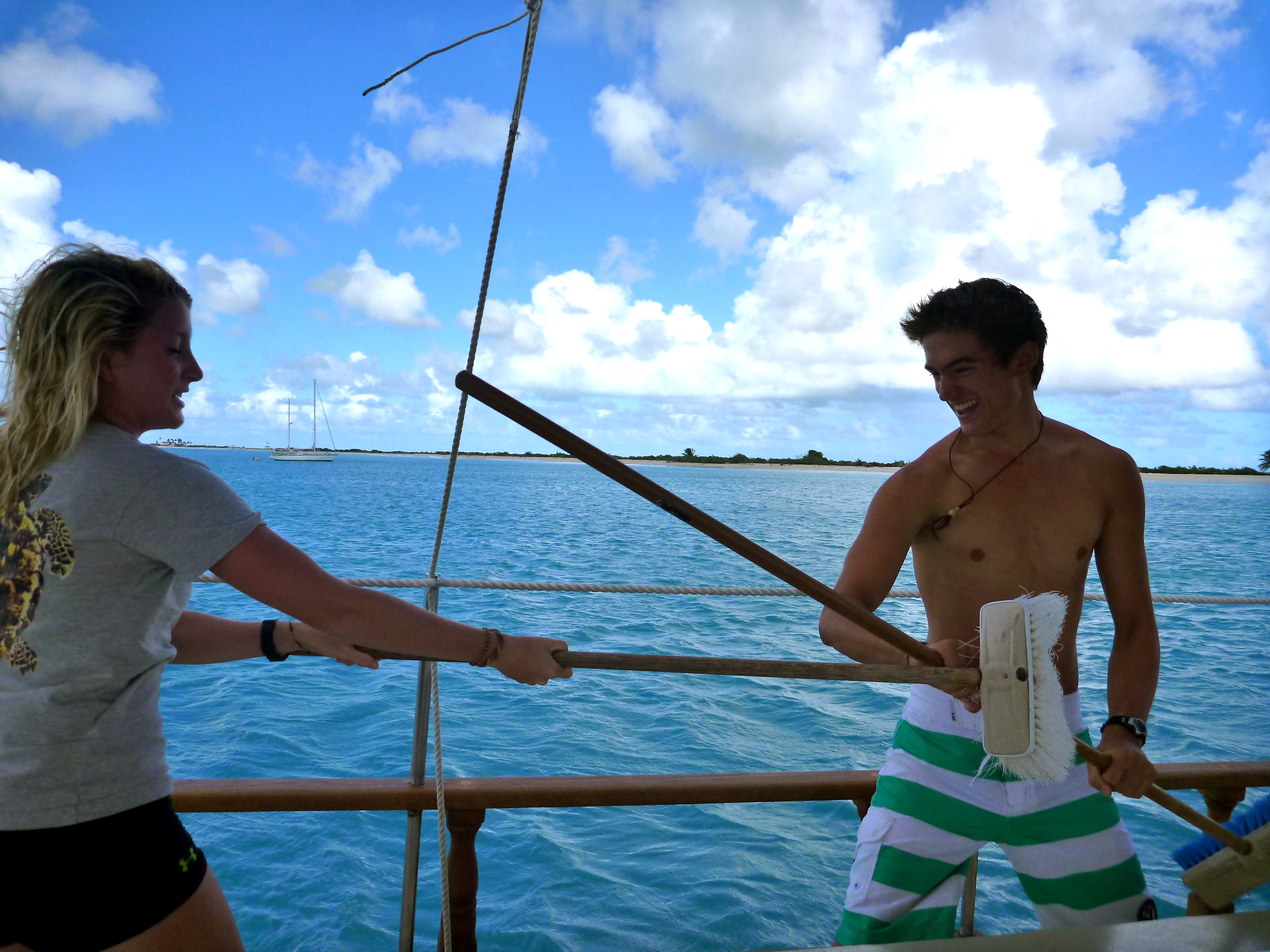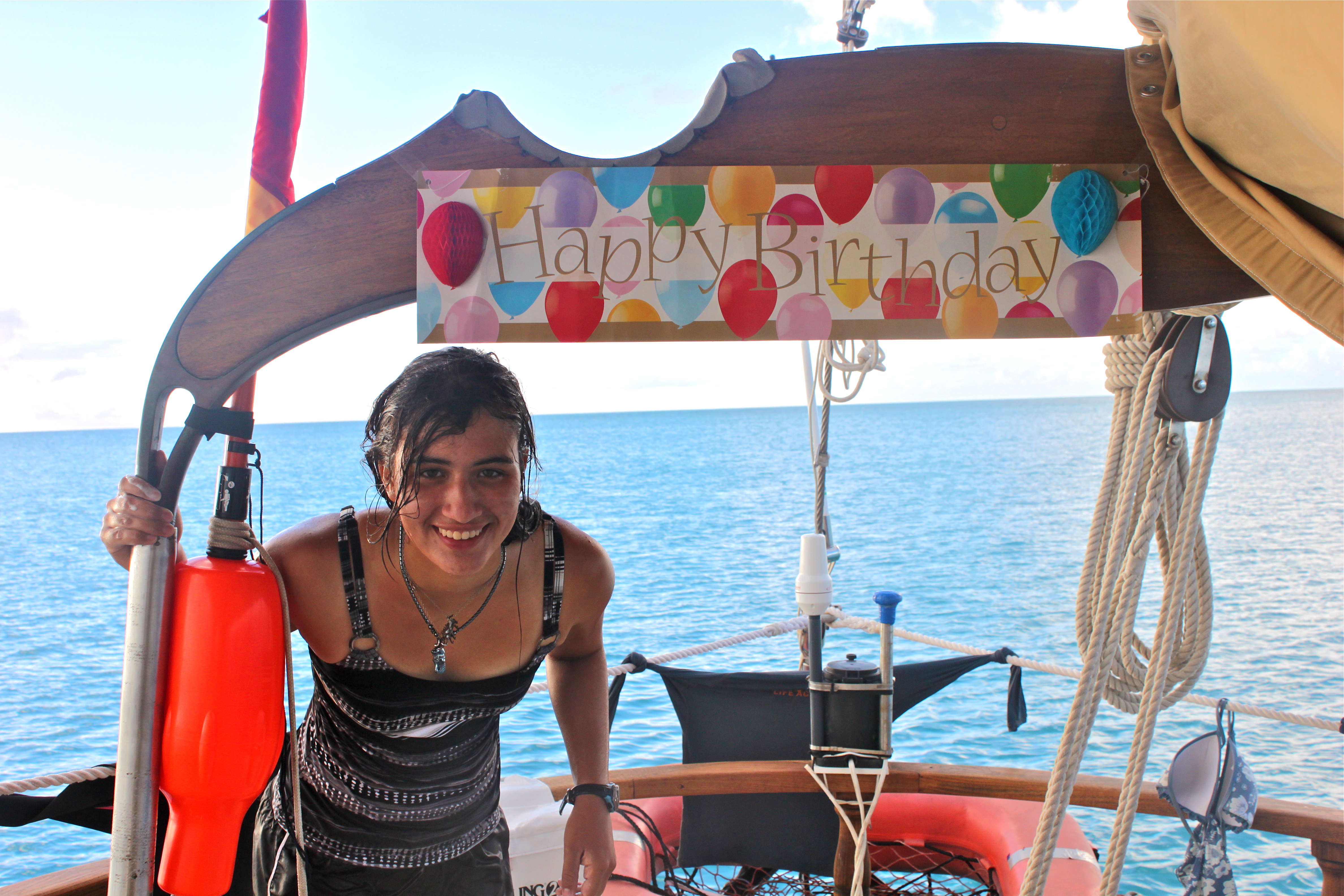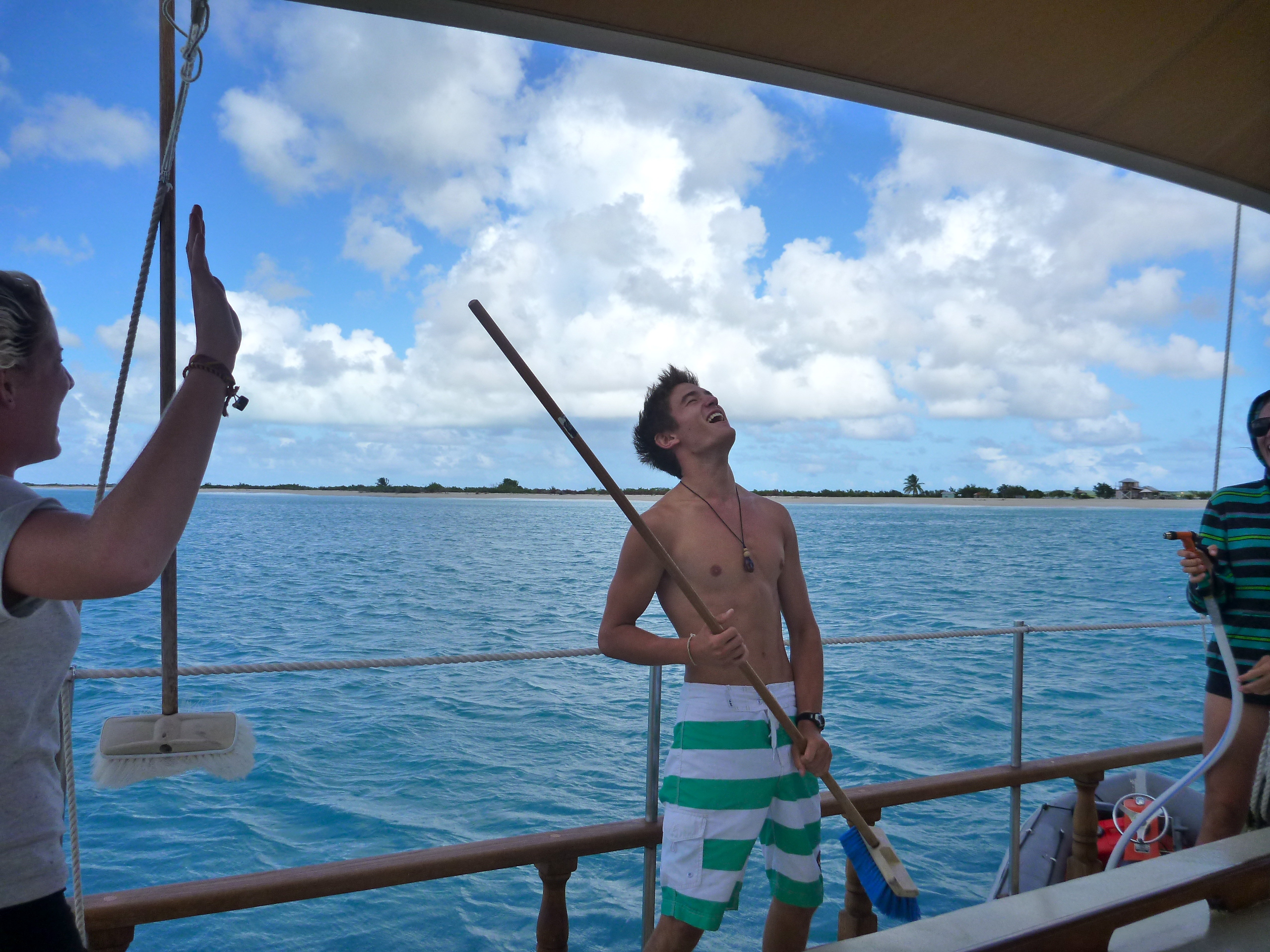 “SHENANIGANS!!” was one of the most used words today aboard Ocean Star. As rescue classes began in earnest, our three new candidates, Ryn, Ed, and Matt, found themselves tossing life rings, towing tired divers, and tackling panicked divers. But, as always, I’m getting ahead of myself. First of all, a huge happy birthday to Ryn, who is 19 today! (Her best present was a peanut butter-infused pancake- if you know Ryn, you’ll know how much she liked it!). This morning, as the shipmates rose up through the companionway, wiping the sleep from their eyes, their faces turned to wonder at the sight that greeted them. After arriving in the dark last night, none of the students knew what our destination looked like. Paradise would pretty much sum it up.