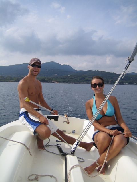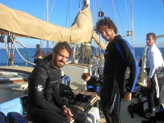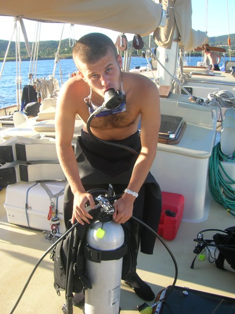 Well, today was an action-packed, fun-filled day. The crew split up today into two groups, which alternated between open water diving and sailing dinghies. So we managed to finally get into the water for our first confined water dives. I think everyone enjoyed it, although I think a few were spluttering about for a while before swimming like fish. We also rented some small dinghies for the crew to try out their small boat skills! The wind was light, but I am sure I saw a few heeled over nicely. This evening a small squall came in, some thunder and lightning, but it was all over before we settled down to a PSCT quiz and class.