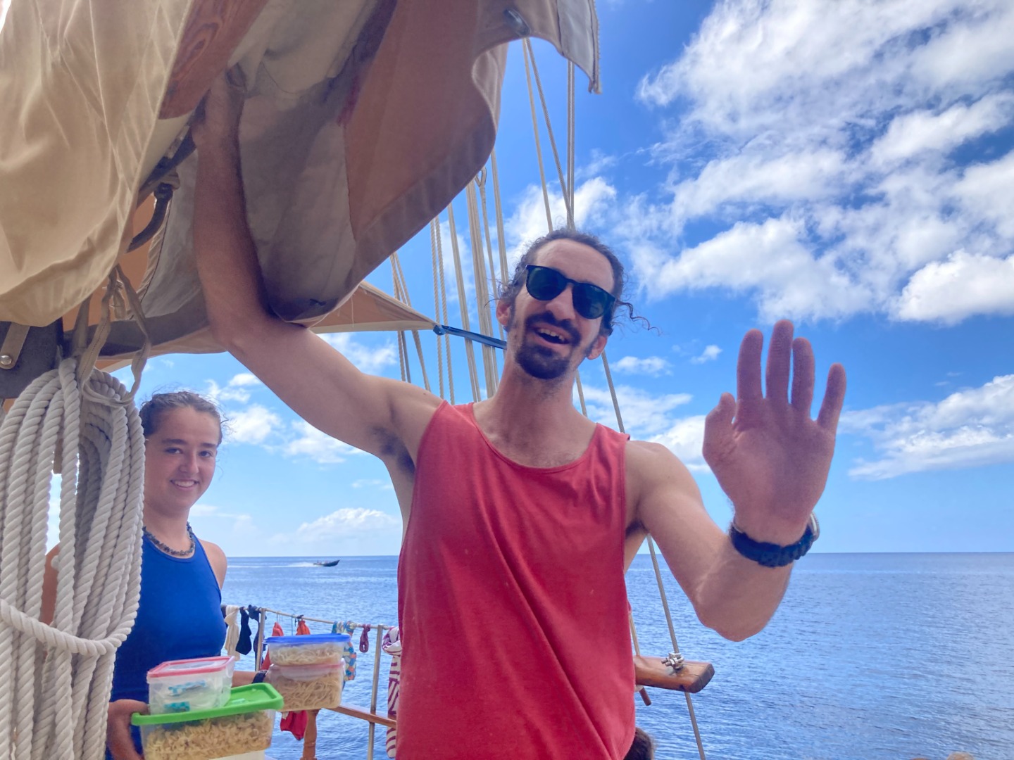 For lunch, we all convened back on the deck of Ocean Star for delicious fried tofu bowls made by Staff Steph, Soph, and Quinn. Following lunch, we had seamanship in the salon for our navmaster course. Today we pulled out charts, learned about their different features, and practiced switching between a true course and compass course while accounting for magnetic deviation and variation. The class wrapped up around 3:15 pm, and we were released to enjoy the rest of the afternoon. To our surprise, O Star was visited by a smoothie boat – basically a small skiff full of fruit, a blender, and a hilarious smoothie-making man. As he was making up the twenty-some smoothies we ordered, he handed up various fruits to eat, including coconuts, soursop, and my favorite, avocado. I have not eaten an avocado since Antigua, 40 days ago, so it was an unexpected wonderful treat. The afternoon continued on as the shipmates took ocean showers, read their books, studied, and enjoyed the sunset. In the wake of dinner at 6, we had our nightly squeeze, which was especially wonderful tonight as the group raved about the diving from today and shared goals they are looking forward to accomplishing after the trip is over, from earning a yoga certification, learning a new language, becoming a yacht master, learning finance-related life skills, to crossing an ocean.