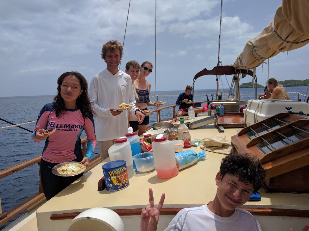 The reef was nothing short of gorgeous, teeming with life (including a sea turtle that some lucky divers got to swim with). After dinner, we quickly made sure the ship was ready for passage, raised anchor, and set our sails at around 8:00 for the 9-hour trip to Antigua. From what little we’ve heard of the place, it sounds like an area rich in Caribbean history, which will certainly be interesting for everyone to experience. The passage began in pitch dark, with a moonrise expected later in the night. The deep darkness made getting out of Guadeloupe a little challenging due to the fact that there were multitudes of lobster pots that we had to dodge. After heading into deeper waters and the threat of fishing pots diminished, we raised our sails and set a course to round the northern shore of Guadeloupe. The wind on the leeward side of the island was light and variable, but once we reached the north coast, the wind filled in from the east, and we were able to trim sail to a close reach and to set course for English Harbor, Antigua. At one point, we managed to hit nine point nine knots! At that speed, we expect to be there a little sooner than planned. It’s a calm, clear, starry night, and Ocean Star is carrying us well. Next stop, Antigua!
