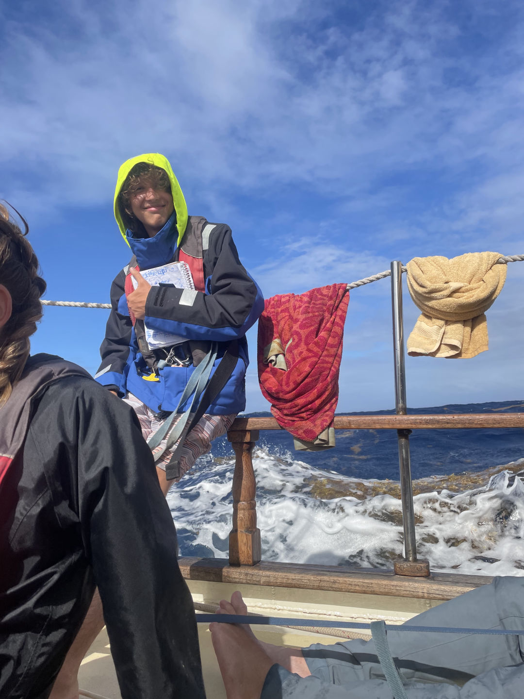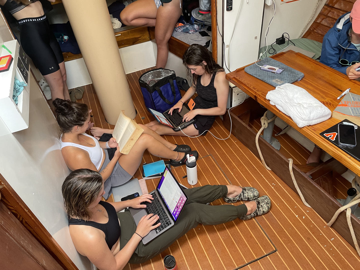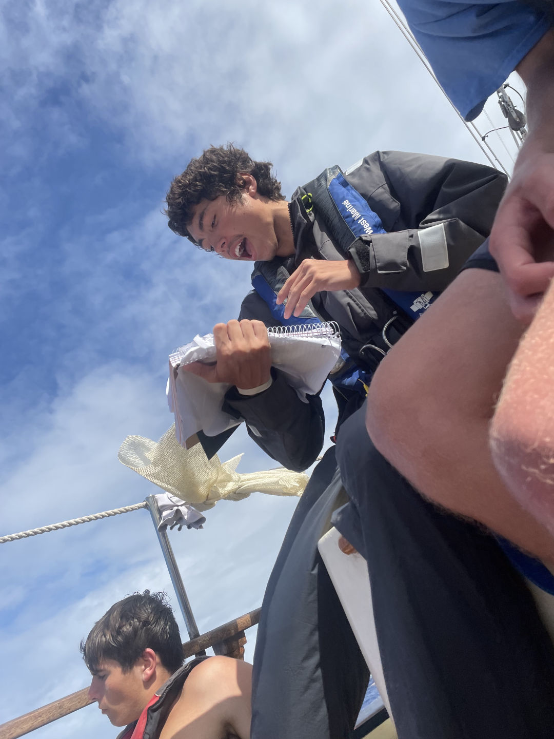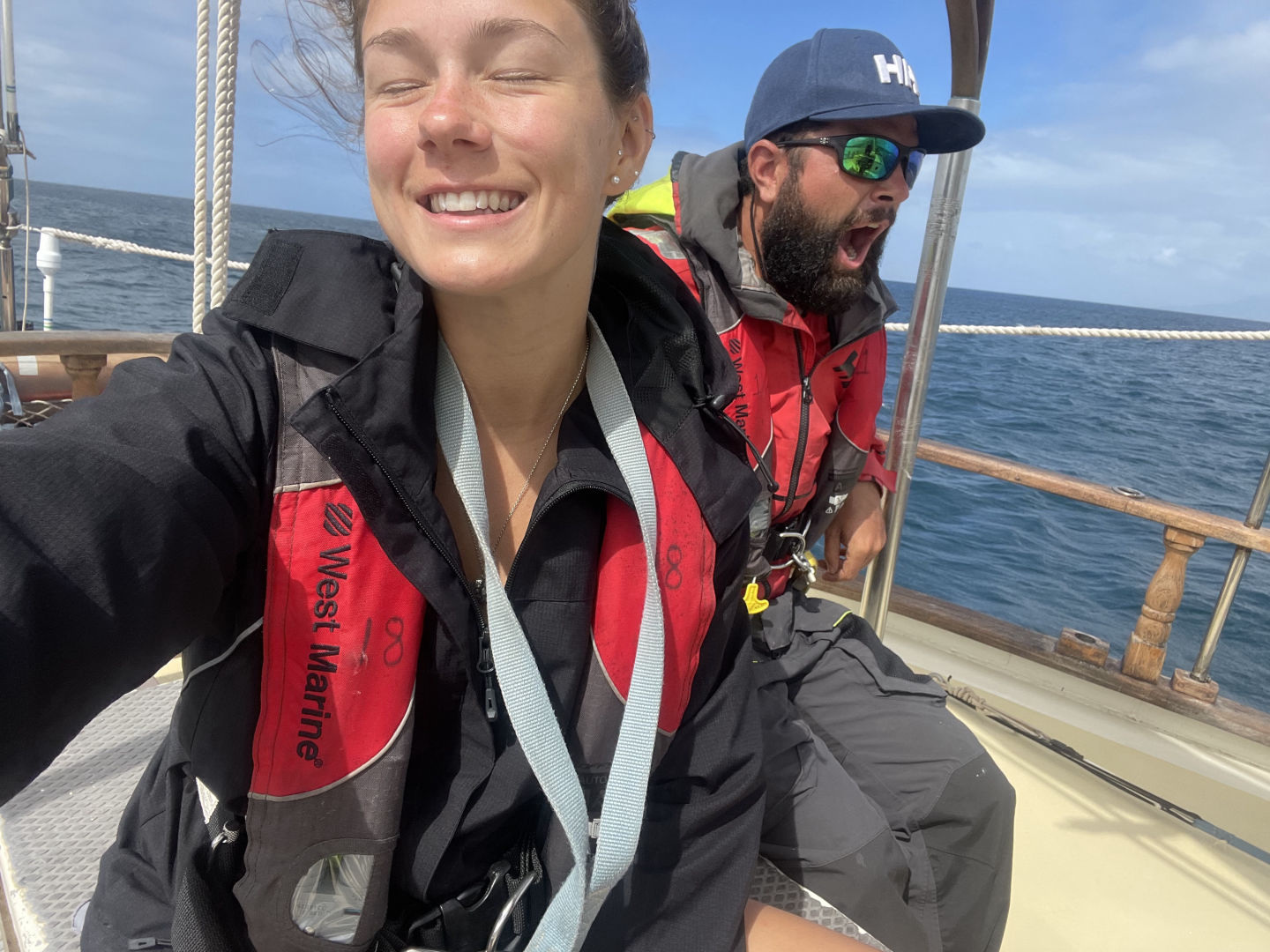 You can’t even walk to two feet without being slammed into the nearest person or thing. We actually attempted to have class while we were underway, which surprisingly worked out a lot better than I thought it was going to. Thankfully Heather and Ash let us have class on deck rather than being down in the salon. However, the only bad thing about having class on the deck while underway is that you are going to get splashed. KK (Casey) and David were the first students to present their chapter for the leadership class, and while they were reading through their notes, this huge wave crashed into the boat and got their notes soaking wet. Now you may be thinking that that would be horrible, but honestly, we couldn’t stop laughing! During Heather’s class, we actually ran into a squall, which is basically this big rain cloud, but that didn’t stop us from learning. There is never going to be another point in time where we will get the opportunity to be able to say that yes, we had a class on a sailboat in the middle of the storm. We truly are one spectacular bunch of people, that I can say for certain. This crew is great, and it is so amazing to watch how well everyone is interacting with one another and how we are all using our strengths and weaknesses to build one another up. Oh, and one more thing that was super funny that I forgot to mention is that during our lunch and dinner times, it was super fun watching people trying to eat their food with the wind speeds being so high. Every time that they tried to take a bite, the food would just fly right off of their fork! We also started our first watch, which is basically when a group of people is sitting up on deck while everyone else is resting. We are looking out for anything that could be of danger to us, such as another squall, another boat, etc. My favorite thing about watch, though, especially during the 12-3 watch, is how peaceful it is while looking up at the hundreds of stars and how clear they are. And just to top it off, the bioluminescence makes it one thousand times better! This trip is so breathtakingly beautiful! P.s. To anyone back at home reading this, I love and miss you so much <3