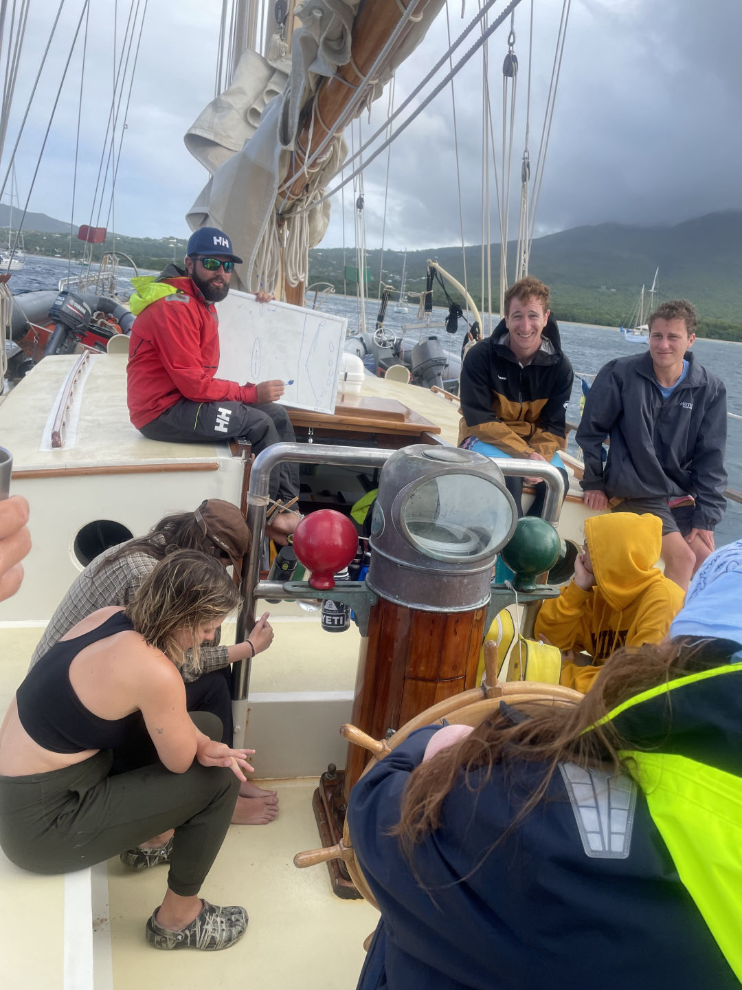 Yet again, another beautiful day here on Ocean Star, except the only difference about today is that rather than being anchored, we have been underway! It has definitely been an adventure getting through the day today, but let me take you through it little by little. To begin the day, I woke everyone up with coffee and tea, and then we all met for breakfast, where we had yogurt, strawberries, blueberries, granola, etc. After breakfast, we did our usual cleanup, and then we quickly took our last ocean shower since, while we were underway, we were not going to be able to shower at all. Our passage will be about 2-3 days, by the way… yeah… we’re all going to STINK so bad, but it’ll be worth it. After being anchored in Nevis for about four nights, we were finally able to set sail, and I was able to drive the boat for a little while at the beginning of the passage, which was so awesome! The waves were pretty high once we finally made it further out past the anchoring site in Nevis. While we were sailing, there were actually these swells that were so high that the starboard (right) side of the deck was hitting the water, causing a bunch of water to wash onto the boat on one side and out through the other side. It was honestly the coolest thing ever. Being in conditions like this while underway is like being on a constant rollercoaster, it’s great, and we truly are being challenged past our comfort zones! Everyone is staying so strong, though, despite how hard it is to get literally anything done.