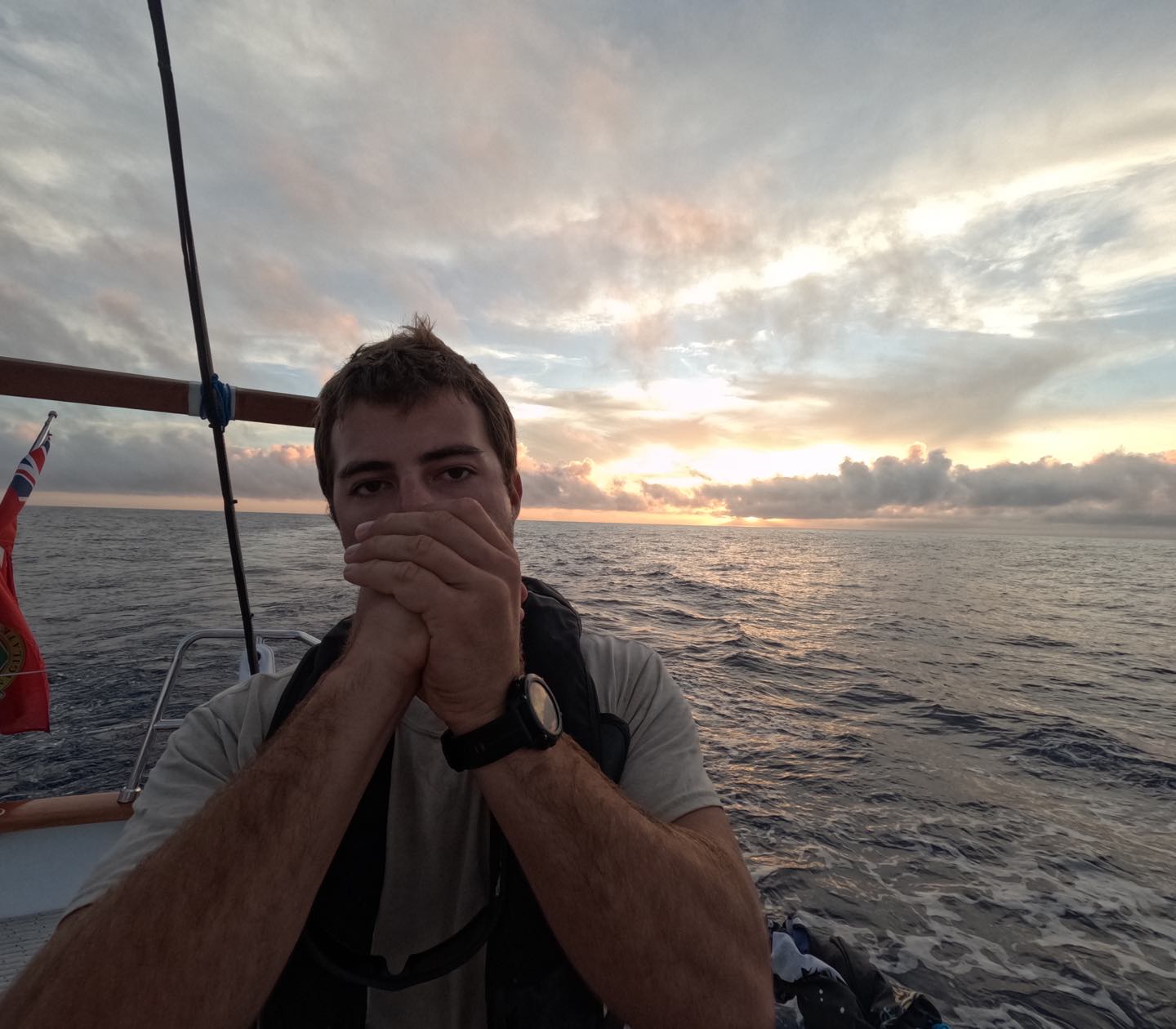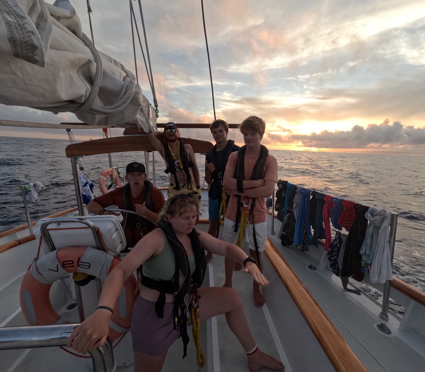 All throughout last night, our watch teams experienced the fun of playing in the rain. Each watch team got some use out of their Fowlie gear while enjoying the wonderful atmosphere a storm can provide. Watch team three (Runyon, Nate, Arabella, Lucie) also saw something pretty incredible. Instead of the typical staggered and sleepy wake-up Vela usually sees on passage, our crew woke up to Runyon yelling, “Dolphin!’. We had crossed paths with a pod of Pan-Tropical spotted dolphins swimming around Vela. Luckily for those not on watch, a second dolphin pod came around to say hi to Vela two hours after the first. Following this encounter, students began to go on with their day-to-day lives. Today, there was a lot of studying going on below deck. The closer we get to the Azores, the closer deadlines get to us. Instead of bringing stress onto Vela like papers and tests sometimes do, these challenges have brought students and staff together. The saloon was filled to the brim with sounds of studying students and background music for much of the day, along with, as always, the sounds of the galley crew making some lovely food. Today, our head chef was Nate, who was helped by Dan and Anda. They cooked a great pesto pasta lunch with olives and sun-dried tomatoes. This amazing lunch would come with great timing because oceanography students had their first exam after cleaning up. The exam was on the geological and chemical composition of the ocean, with a little bit of nautical history sprinkled in. Following cleanup, a study group was formed, and many unique acronyms were made to help with the test. The daunting nature of an exam looming was also eased by the wonders of candy when Shelby brought Skittles to class. The sweetness of the skittles and the kindness of Shelby went a long way. Following a little bit of downtime, we began our leadership class. Nate, Arabella, and Anda were presenting about leadership in group and team settings. Their presentation was motivating and exciting, and we finished our class with a fun, friendly competition. The Silly Willy’s (Will, Charley, Joey, Nora, and me) and the Mojo Dojo Casa House (Lucie, Runyon, Garrett, Zoe, and Flo). For every four-letter word found in a pile of Banana Gram letter tiles, a group would have an option of extending their time or unleashing a Danquake on the other team. The Danquake consisted of Dan going to a table and messing up all the pieces to throw a team off. The game had a leadership twist, though. Each group elected a leader (Will for Silly Willy’s and Lucie for Mojo Dojo Casa House) who could not communicate with their team about decision-making, leaving them alone in strategizing. The game turned into a balance of teamwork between the word finders and the thinking skills of the leaders. The competition ended up going into a hotly contested third round, where the Silly Willys would end up taking home the first-place prize: A second lollypop. After class, the day started winding down for many, but not for the galley crew. Chicken Tikki Masala was on the menu for dinner, and now Joey was baking some naan. After two hours of work, the galley would produce a world of art so fine that Tom would claim it to be one of the best curries he had tasted on board. The galley and saloon were filled with sounds of music and celebration after this remark. As a final farewell to the day, our crew got to watch another fantastic sunset while reflecting on our wonderful time at sea.