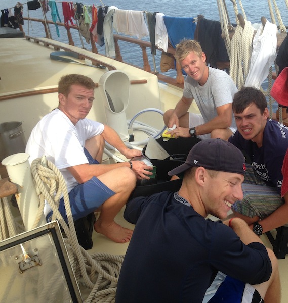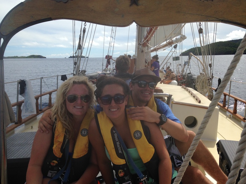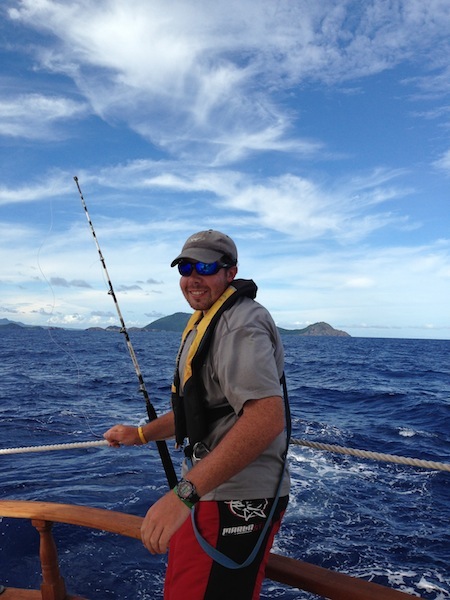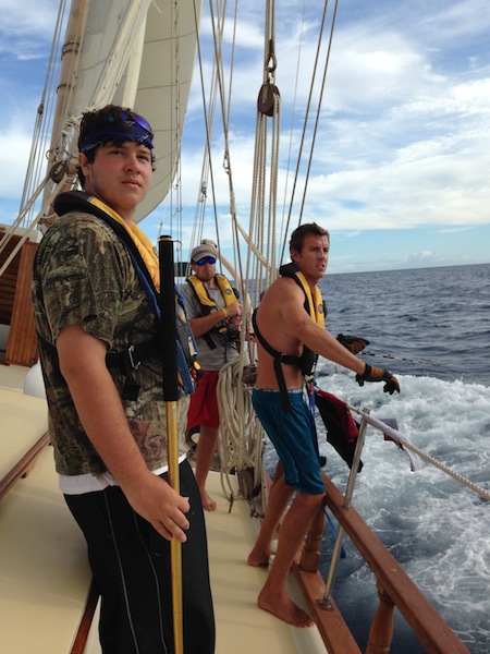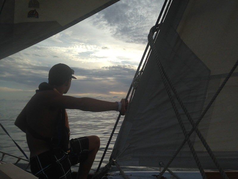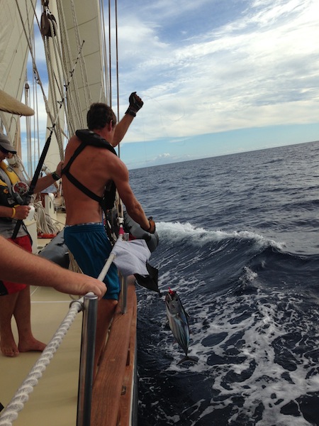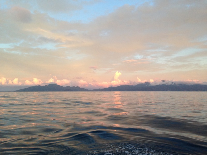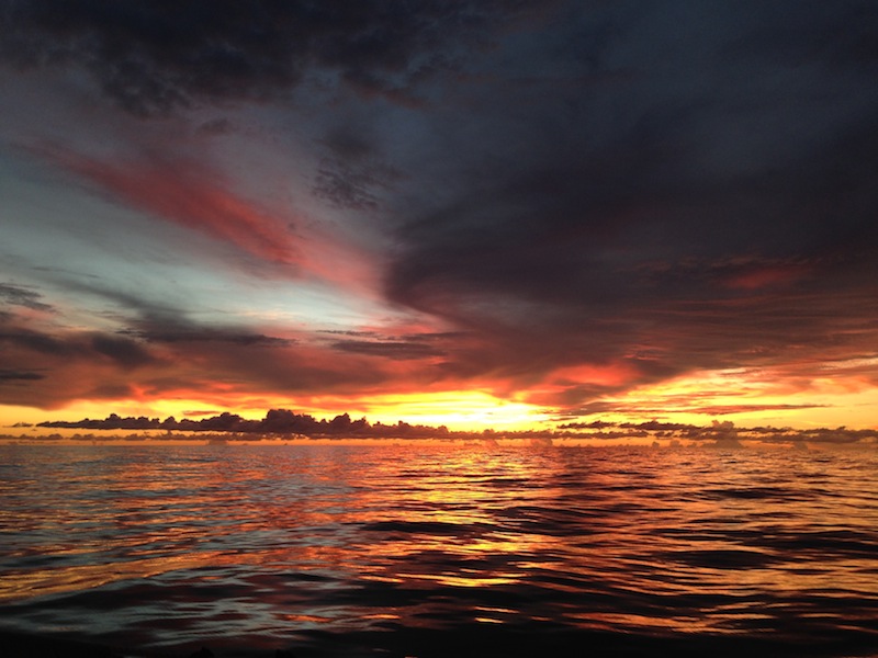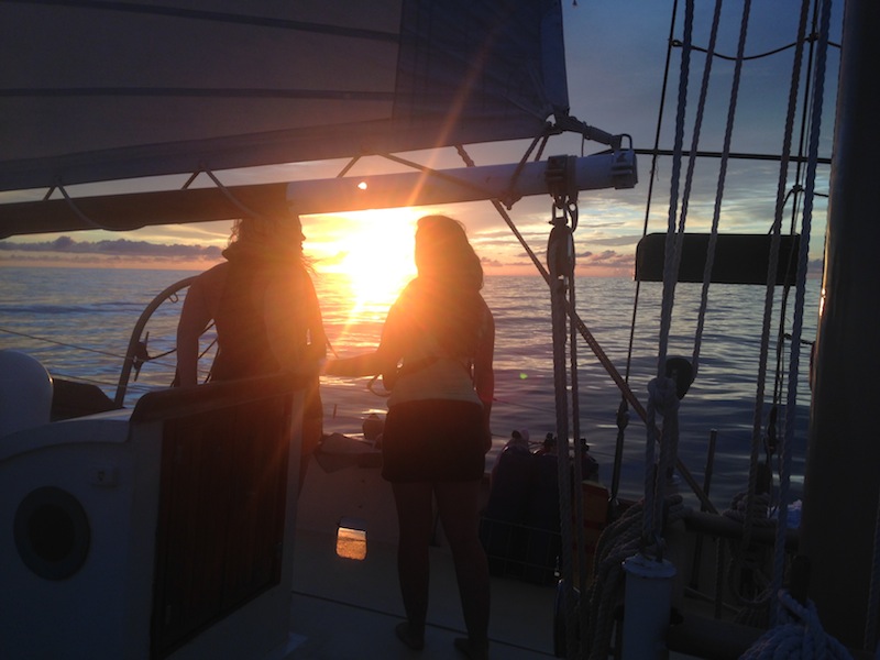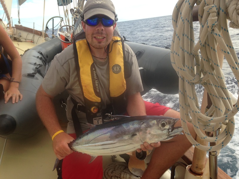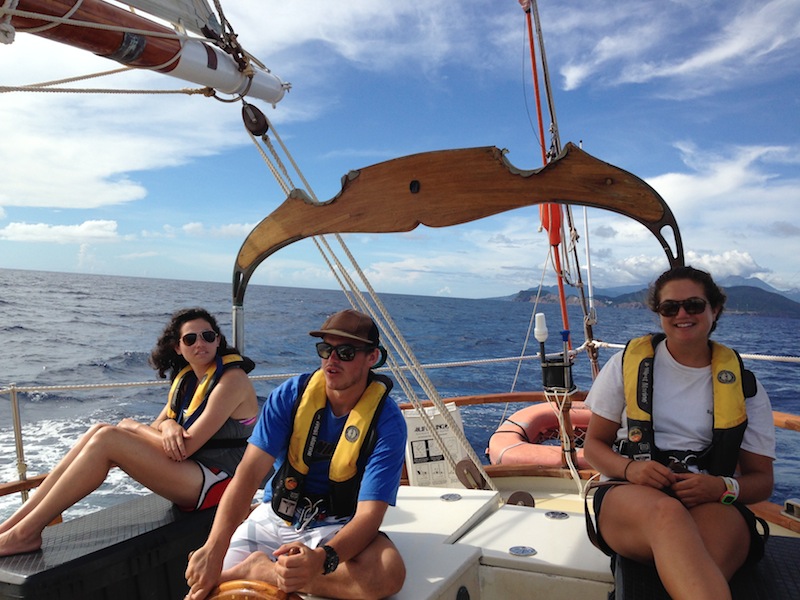 Today, we woke up and had a relaxed morning to get ourselves ready for our two-day passage to Grenada. Shortly after we set sail, James, our boat fisherman, caught us a skipjack, which is, in essence, a small tuna. Having heard of people eating their catches eye, Will and Bret decided to try to eat the tunas eyes, which made for an interesting time. As soon as the fish was filleted for dinner, Will, out on bow-watch, pointed out a pod of Atlantic Spotted dolphins, 40 or more, who also spotted us. The dolphins then joined Ocean Star on our passage, briefly skipping across the water right on the bow of the boat. As the sunset on our passage, the water was like glass and the calmest it had been, making for a perfect sunset. Dominica lay to our east, bathed in pastel colors like a magical land. To end the day, we ate the fresh tuna steaks seared to perfection.