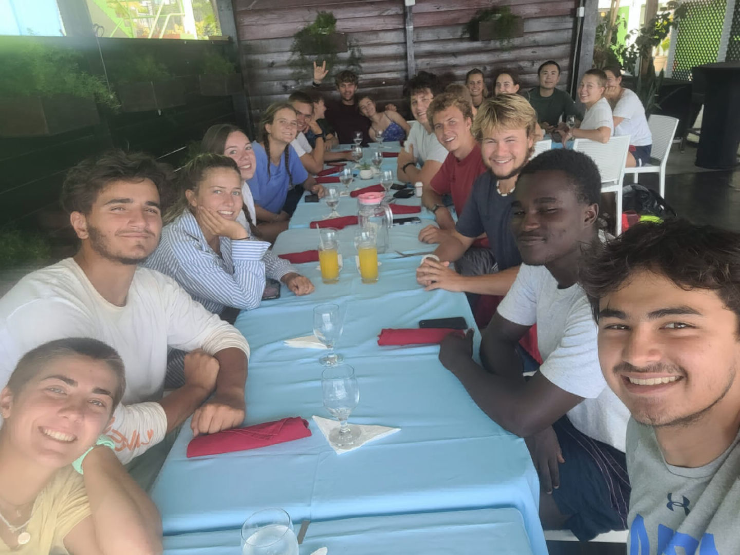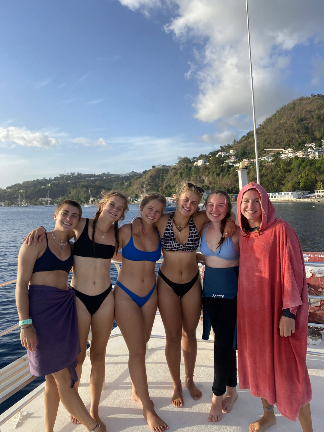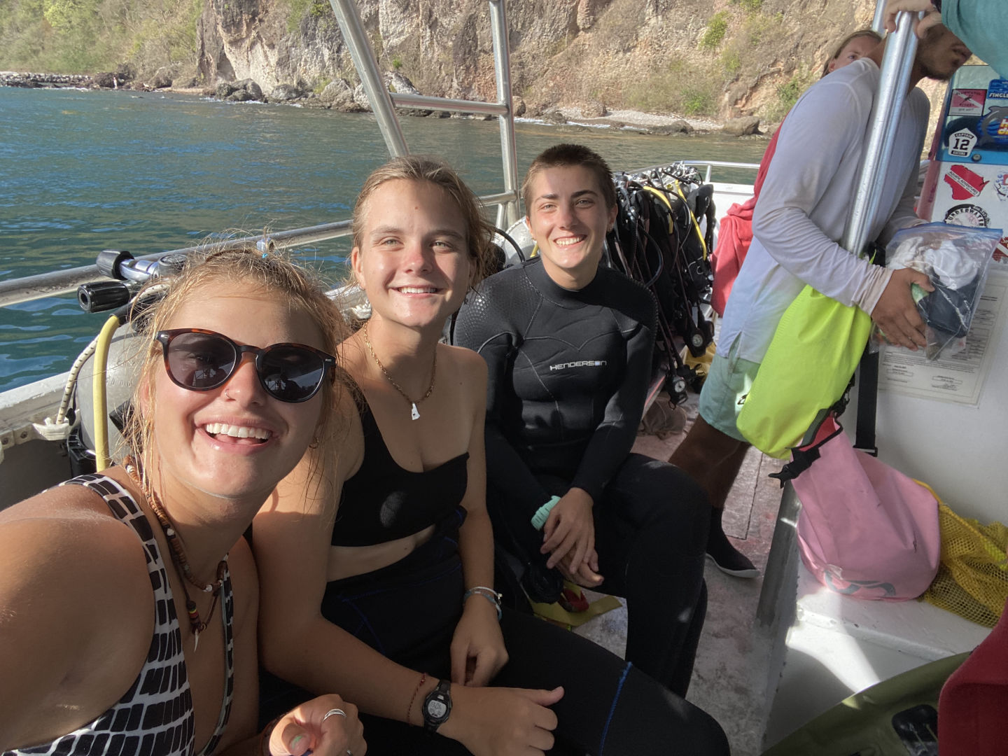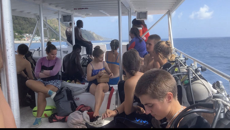 Today began with a bang, an exam. That’s right, our last marine bio exam ever on Argo was today. As I turned in my work for the first time in my life, turning in a test felt bittersweet. After breakfast and the exam, everyone packed all their gear for diving. We dinghied over to a cute local restaurant that was very clear on island time, as our food took a lot longer than anticipated. Once everyone got their food, it was time to GO GO GO!!! We hopped onto the dive boat, and I scrambled to get into my wet suit while trying to eat jerk bbq chicken wings…quite an experience. Once at first sight, we dropped down to around 80 feet, where we swam along a giant wall full of coral, fish, and even a school of rays swam by… it was like I was watching Blue Planet or some kind of Nat Geo documentary…but real. Following that and the spotting of so many cool creatures, we traveled to our next dive site. This one was a bit shallower, closer to 50 feet in depth. Here we saw rock beauties, juvenile cowfish, and so many other incredible animals including an 8-foot shark! WOW. Also, due to the volcanic activity of the island, the second dive site had methane bubbles. The guide told us the site, Champagne Reef, was named for the bubbles. So cool! Once done with the second dive, everyone was pumped and exhausted at the same time. We got back to the boat and relaxed until dinner. We then wrapped up our day with a lovely dinner cooked by Freddie, Elisabeth, and her sous chefs. Overall another incredible day aboard Argo.