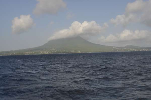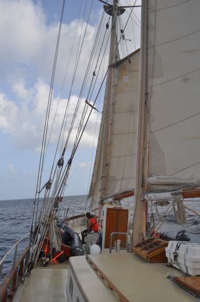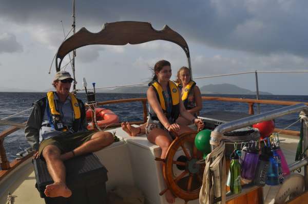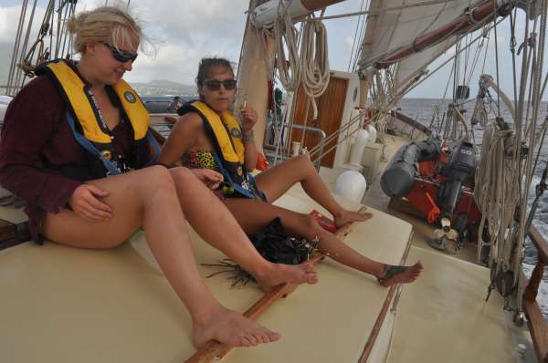 Everyone woke up the morning of our much-anticipated passage from St. Kitts to Dominica feeling more than a little sleepy, but just before lunch, nine eager divers hopped into the water for my favorite dive of the trip so far. River Taw was a tugboat wreck that was split into a few different pieces about 40 feet below the surface of the ocean. The wreck was covered in coral and teeming with more fish than I could possibly count. Seemingly unafraid, these fish of all shapes, sizes, and colors swarmed around us. I don’t think I’ve ever seen so many fish at once. We could feel them swimming around us, and more than once, I had to get out of the way of a school of teeny, multi-colored fish as they bustled about. We all surfaced next to Ocean Star, excitedly chattering and unanimously agreeing that, no matter how tired we might have been before the dive, we were most definitely wide awake now and ready to embark upon our 24-hour passage to what some have stated to be one of the most exciting islands thus far.