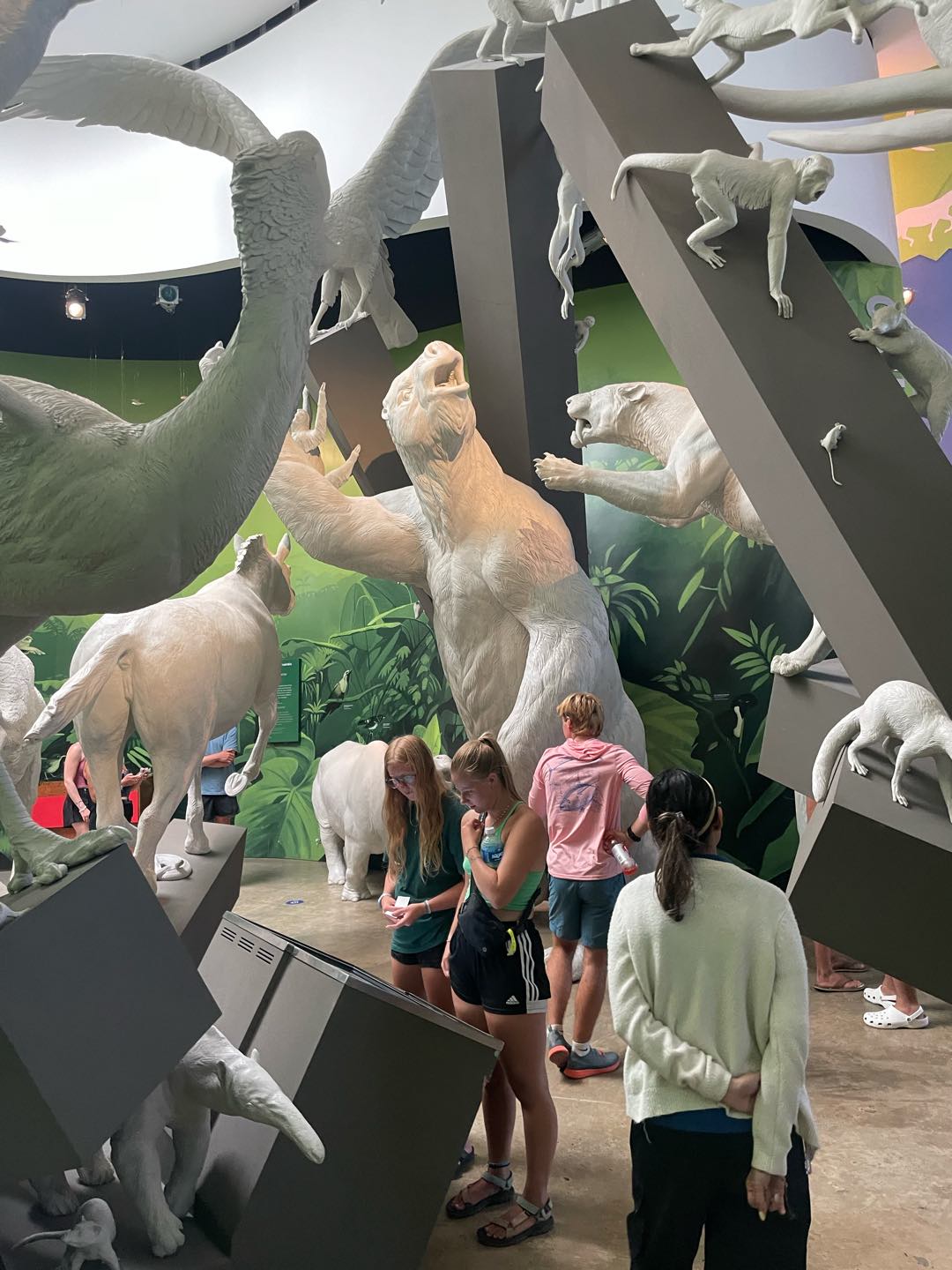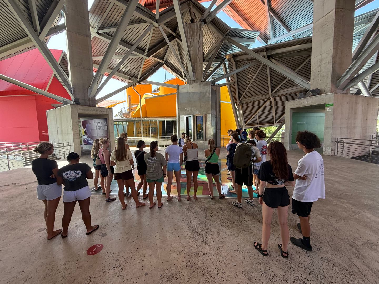 HI! Colbie again to write about the bio museum (Big Meg didn’t attend with us ),:). After approximately a forty-minute walk to the museum from our dock, we arrived at an insane looking building with roofs going in all directions. Big Rach and Doctor (soon to be) Captain Nacho got us all tickets while we listened to a brief introduction about the museum and its architect from one of the employees. After the intro, he walked us through the first portion of the museum, showing us the endangered species and the national bird of Panama, the Harpy Eagle. The next portion was a video about the animals and vast biodiversity of Panama, displayed on 6 screens across three walls, two screens on the ceiling, and another screen underneath the floor. Most of us chose to lie down while inside to enjoy the majority of the screens, although we probably missed some cool things happening underneath us. After the video, we walked into a room showing the old rocks and ancient creatures that inhabited Panama, including some sick fossils (part of my specialty in archaeology).