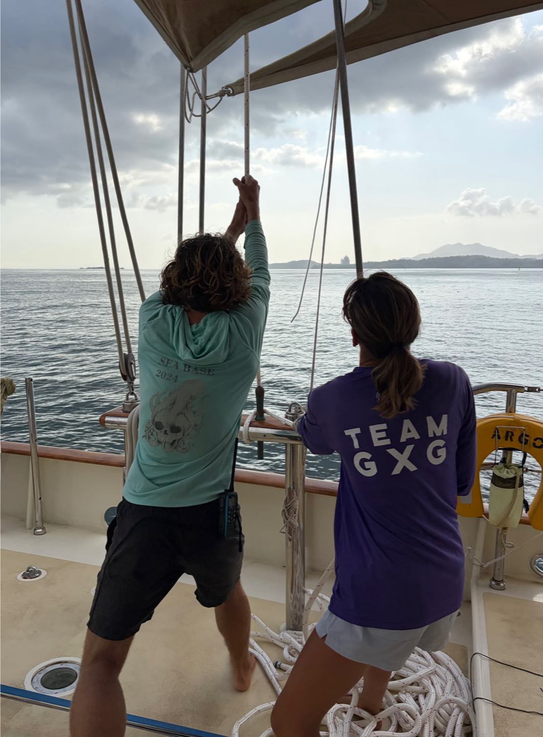 Returning from the final time ashore for the next week, the crew was met with a hot soup for a hot day. Once fuelled up again, it was time to get Argo ready to depart. This passage prep was a bit more intense than usual, with the ‘Panama lines’ having to get stowed away back into the depths of Argo, never to emerge again until two years from now. The daring team of Ani, Katie, and Helena took on this feat. Meanwhile, Colbie, Grace, (little) Meg, Gavi, and Skylar all got to work taking off the sail covers and putting on halyards. Finally, with the sails ready to go, it was time to send Nick up the mast to check the rigging. This fell to the team of Cason, Avery, Jazmyn, Stella, and Emma. While most of the crew were on board prepping Argo, Mars, and I went on one final food run to try and find some extra rice and gluten-free bread (a very hard thing to come by out here). Once the deck was put together and ready to go, everyone went to tidy up their bunks and secure all their snacks so nothing flies out into the hallway and gets eaten by another crewmate. As the evening wraps up, we are raising anchor and setting off for the next destination: the Galapagos.