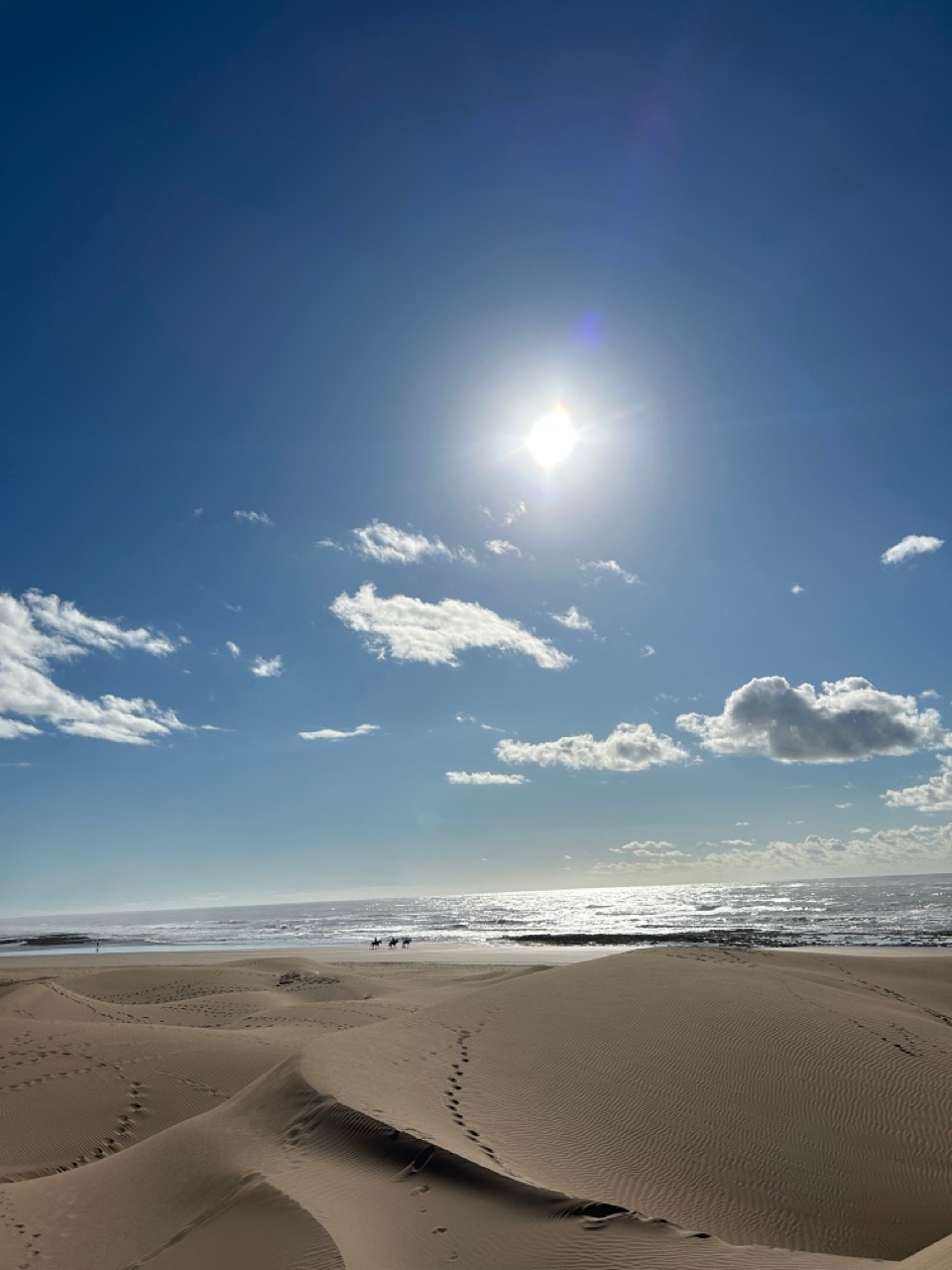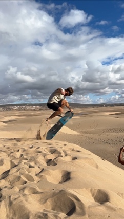 AN hour on the road later, and we had arrived at the sand dunes. A sight to behold, the landscape was dotted by beached fishing boats, with a beautiful rainbow as the backdrop. We shredded the slopes for hours. Luke and Theo hit flips, Jesse and Ruby did handstands, and Sensei went for some wild drop-ins. We ended up competing to be on the cover of the (imaginary) World Sandboarding Magazine 2024.