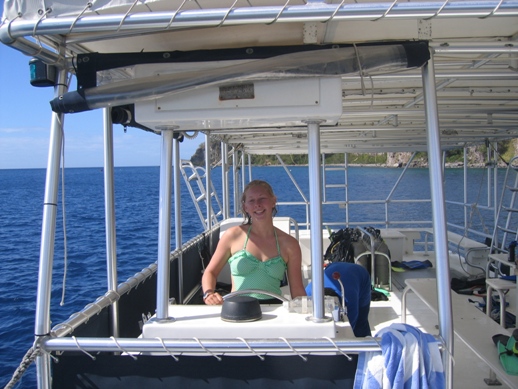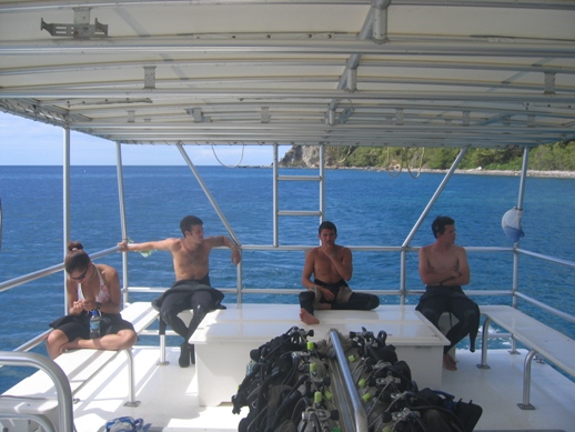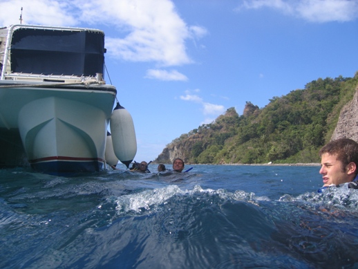 After a nice breakfast, we all got split up into our BA and provisioning groups. This BA was a thorough cleaning, scrubbing the fridge, cleaning the hull, and scrubbing the cap rails. After Ocean Star was looking like a true shining star, we had an hour or so of free time till lunch, which turned out to be great BLTs. After lunch, we had a double dive planned with Dominica Diving. Around 1:30, we headed over to motor out to the diving locations. Our first dive was spectacular, and there was a reef wall that dropped into the abyss. Our next dive was further in, which was called Champagne, because of the sulfur coming up through the ground, which was extremely warm. On this dive, we got to see a lot of new species that none of us had seen yet on this trip. When all was said and done, we de-kitted and headed back to shore, where Simon came to pick us up. With not much time left to cook dinner, Mike started slaving over a well-deserved dinner, which was pork chops and a nice array of veggies.