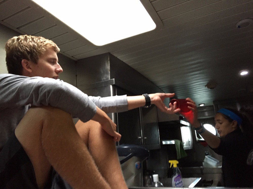 This morning started at 6 am with Argo swinging abruptly around, 180 degrees from how we had been sitting the previous two days. The anchorage that had been our safe haven during this nasty storm was no longer secure due to the storm swinging around to this new angle. Anchor watch immediately woke up the staff, and Kevin decided that it was best to move Argo to a safer location. An hour later, and after more wind and rain, we were finally anchored in our new safe anchorage, and it was time to enjoy blueberry and chocolate muffins made by Parker, Matt, and Chloe. Since the day was set to have more wind and rain, we filled our day with three classes, napping, studying, and playing Farkel (a dice game). After marine biology and sailing class, the storm had ceased, and saltwater showers were enjoyed by everyone. With the storm finally moving onward tonight, we are setting sail on the two-and-a-half-day voyage to Tarragona, Spain. Let the sailing begin.
