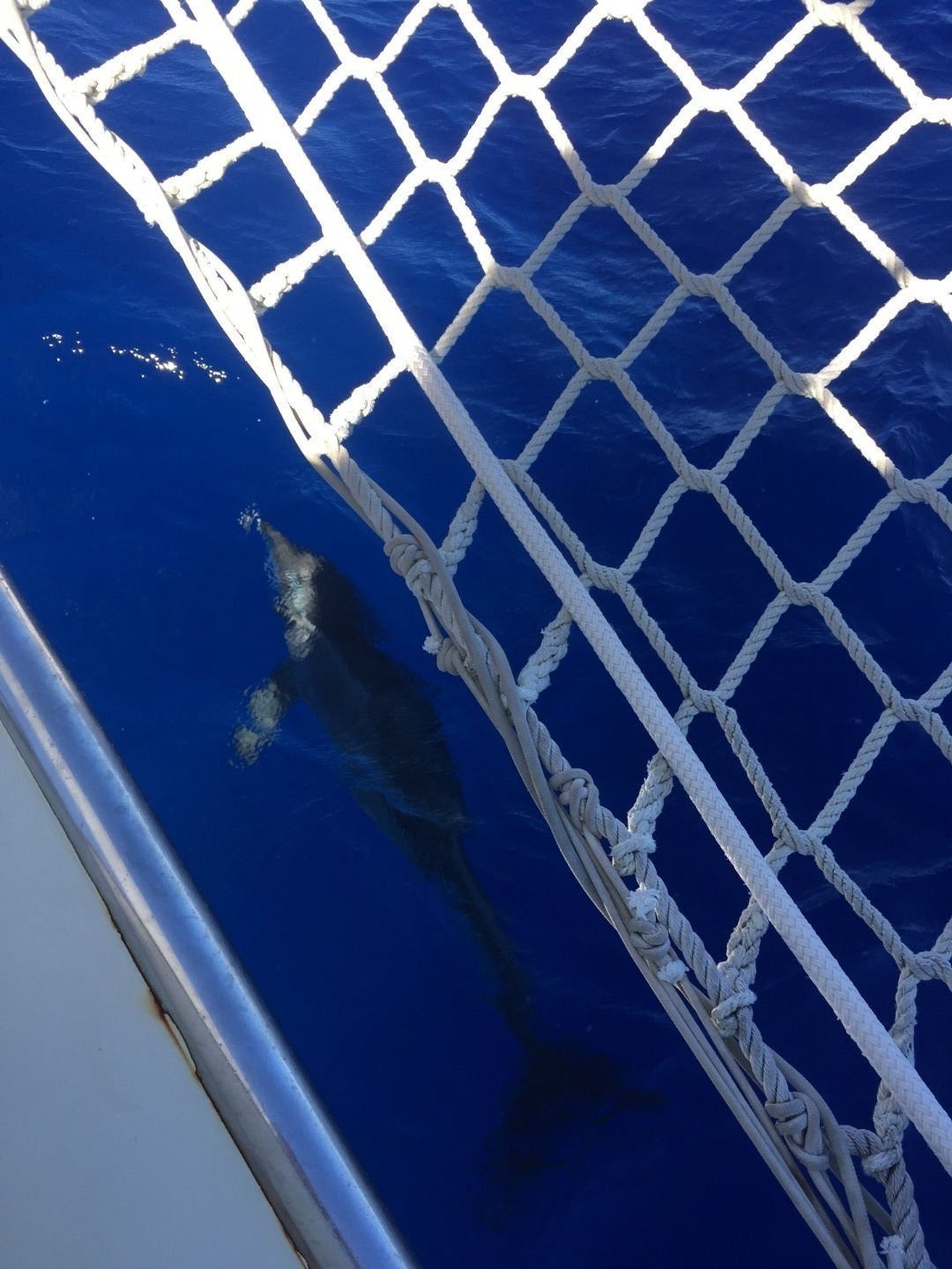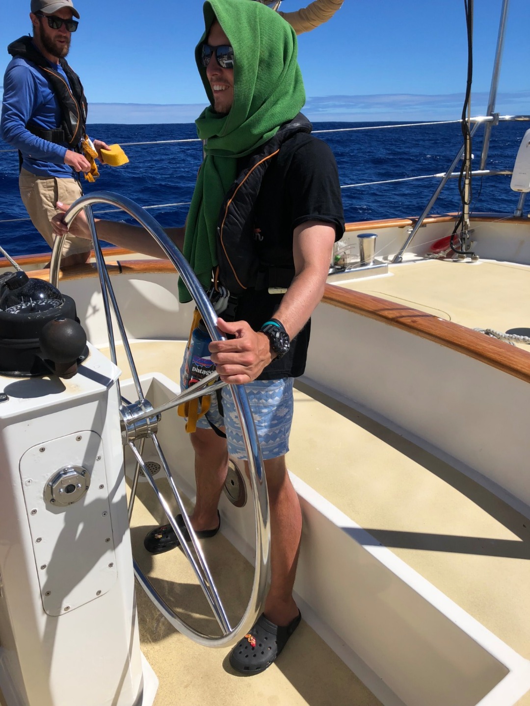Pictured: rough-toothed dolphins enjoying a swim under the bow and Ben hiding from the sun while helming during late-morning watch.