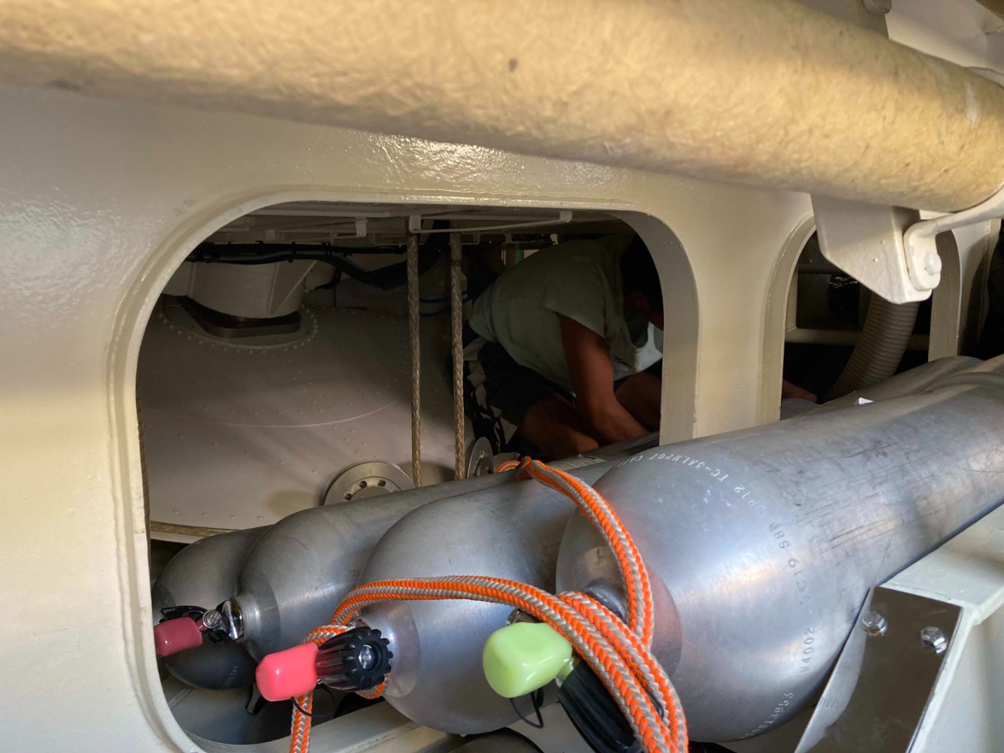 Photo 1: Rocco in the Laz, combatting the task of tying down the dive tanks