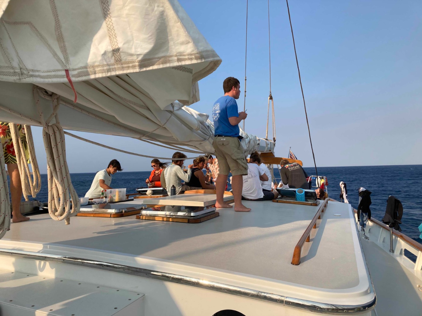 Today was just like any other day aboard Vela, with our wake-up around 7:00 am breakfast starting at 7:30. We had pancakes, which were really fluffy, soft, and tasty, so credit goes to the chefs James, Savanna, and Brianne. After we finished breakfast and cleanup, those who remained took their Navmaster exams, while those who had already taken it was graciously granted either free time or a chance to go on a dive if they had missed out yesterday, and a second one if they hadn’t. Those who dove all seemed to enjoy it, some of us going before lunch, and the rest of us going after lunch, which was burrito bowls, another home run by our chefs. During our dives, we saw plenty of wildlife, mostly small fish in large schools and the occasional Morays, similar to eels. I, unfortunately, lost my watch while wrestling out of my BCD, and it has been claimed by the Mediterranean ( 🙁 ), but there were no other negatives. The water was so clear, and the rock formations were absolutely stunning, with large outcroppings and steep drop-offs. Josh referred to them as “underwater highways,” and I couldn’t think of a better way to describe them. Once we got back from our dive, Vela was already in “passage prep” mode, getting all the dive gear secured and stowed, getting our dinghies ratchet-strapped to the deck, and removing sail covers, among other things. Rocco, Anna, and myself, as some of the smaller folks aboard, were assigned to the Laz, stowing the dive gear and scuba tanks, performing checks on our steering column, and just tidying up all the loose items that are to be stored below the deck. With two of our shipmates leaving the trip early, we had to restore the duffel bags and suitcases in a somewhat organized fashion since they were packed like Nesting Dolls, and they also went into the Laz. Then we sat down for dinner, a Vela staple, Pasta and Tomato Sauce. But again, our chefs nailed it and made an original so uniquevegetables in the sauce, leftover beef from lunch, even sliced gouda cheese. So many things that I wouldn’t personally put in there, but after a long dive and an even longer day, it hit the spot.