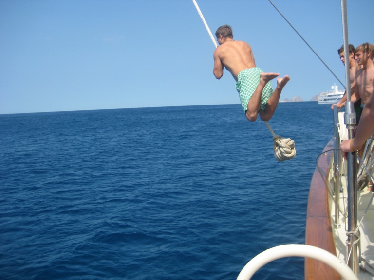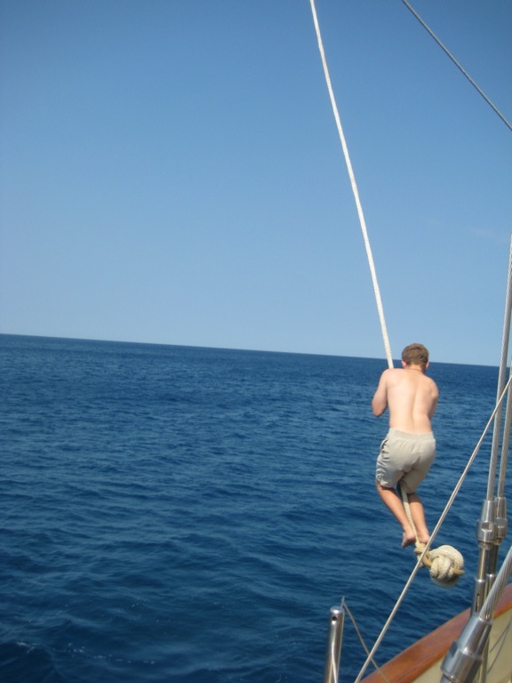 Today was a great day of adventure. After a delicious breakfast of eggs and coffee cake, we moved the rigging around to create a boom swing. We all swung on the boom swing, and some of us had some pretty epic moves while others had epic fails. A great lunch of pizza on French Bread and more water sports/cave exploring/beach time. We set sail this evening for Civitavecchia and should arrive before dinner tomorrow. Beautiful weather tonight as we embark on our last passage. As the days get fewer, we run a mix of emotions from sadness at leaving, missing each other, having a great time, excitement to set sail, and eagerness to see family and friends at home.