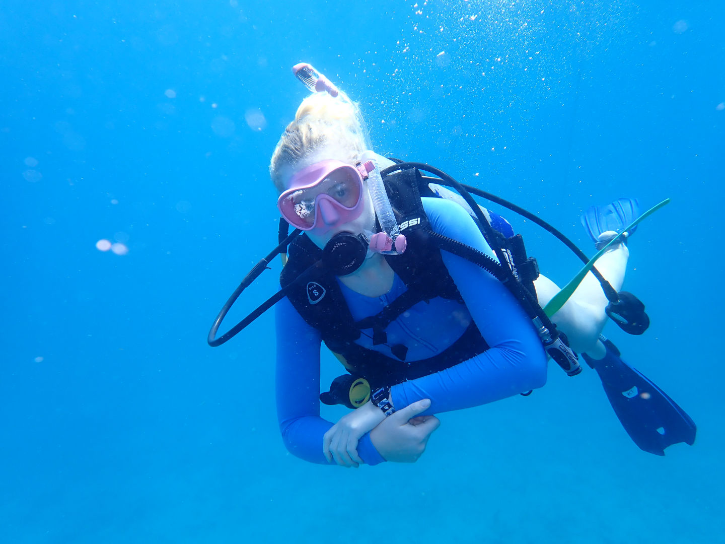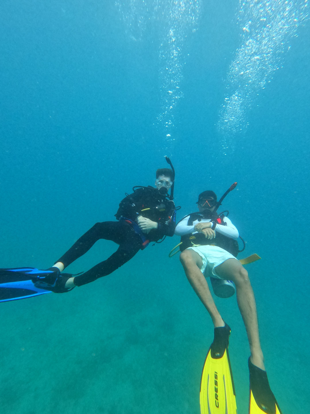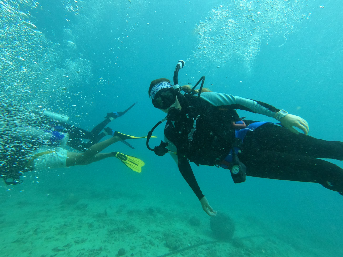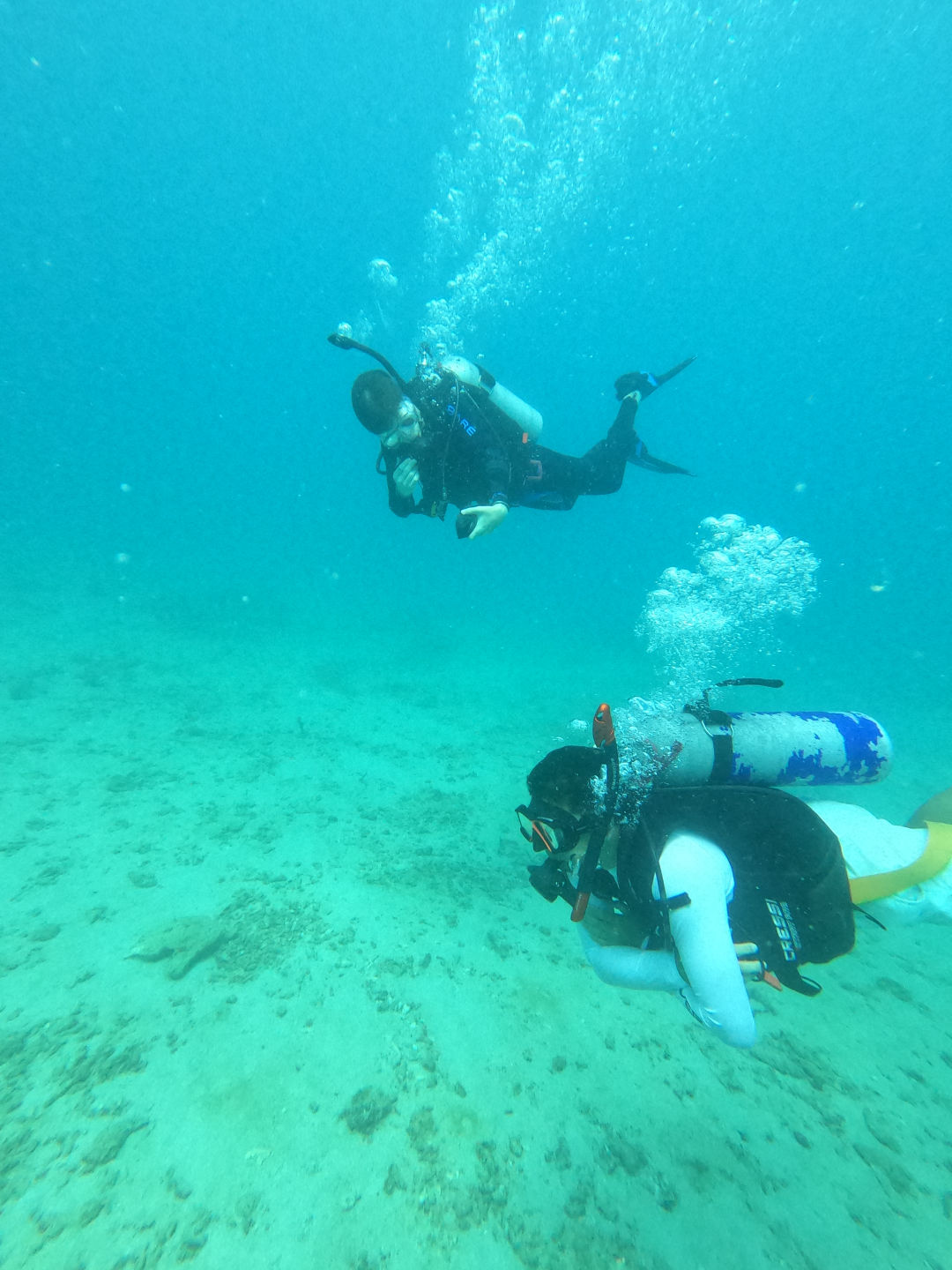 After a long day of excursions yesterday, the urge to stay in bed was quite tempting this morning. My “good mornings” were met mainly with groans for all except Rocco, our head chef today, who sprung into breakfast action. This morning, we were served the most top-tier version of the Seamester brekkie go-to: yogurt and granola. After breakfast and cleanup, the students broke into dive groups for our first “fun dive,”- meaning the dive was not meant to test skills but rather just for fun. This means students were able to bring GoPros and get some awesome underwater shots. While the first group went diving, Zoe, Ben, Sammy, and Hannah caught up on school work and did their best to manage to get the mud off their hiking shoes from yesterday’s very muddy adventure. Rocco, Evan, Jack, Alev, and Ella did the same when they came up from their dive before getting lunch underway. Today, the divers saw lots of fish and an eel!