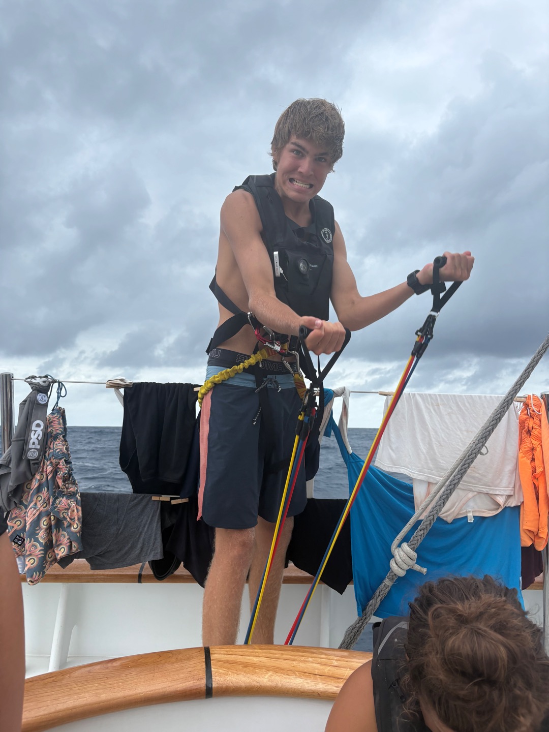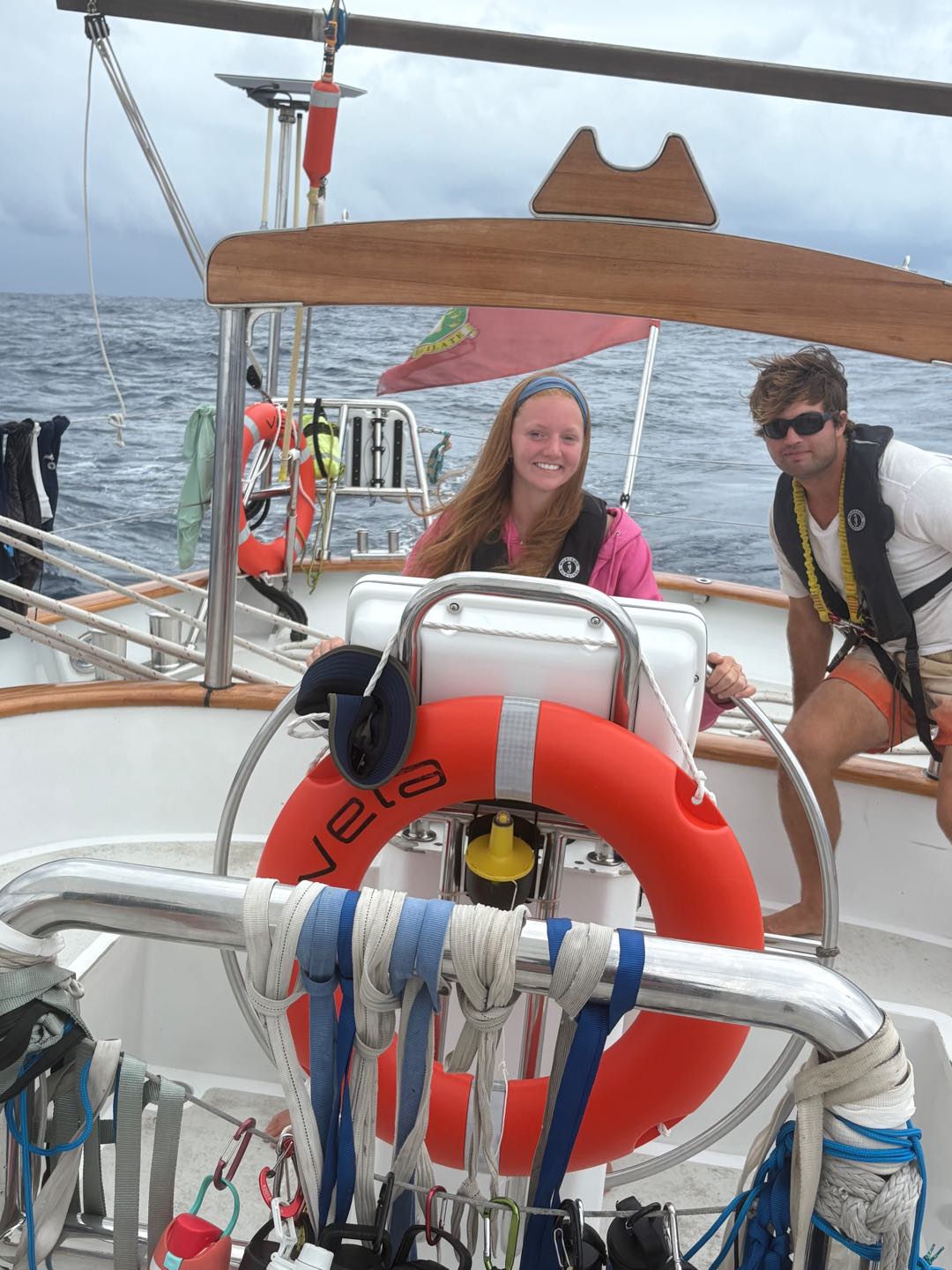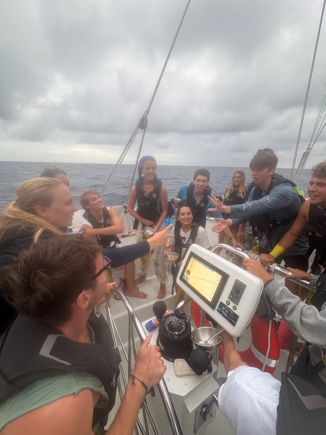 Hello everyone, back on land! Today is day 4? of our passage to Nuka Hiva. The last couple of days have been full of on and off rain and motoring, BUT TODAY the wind decided to be our bestie, and we got to throw the main and flying jib up! As Im writing this, we currently have four sails up and were going over 9 knots! Pop of Vela. Anywho, this morning my watch team and I had the 4-8 am watch (my favorite of the three night watches). We started our watch playing some games such as contact (a game where you try and guess the word that someone is thinking by only knowing one letter at a time) its honestly a really hard game to describe, you kind of just have to play it lol. We also played this game that we created on our passage to Galapagos called Enough is Enough. Its a game where you go around in a circle and everyone adds to the story that the first person starts, but the first word of the sentence you add has to be in order of the alphabet. The trick is that whoever sends up with the letter e has to say enough is enough, followed by a complete subject change. Weve been laughing hysterically at the stories weve been coming up with for weeks now.