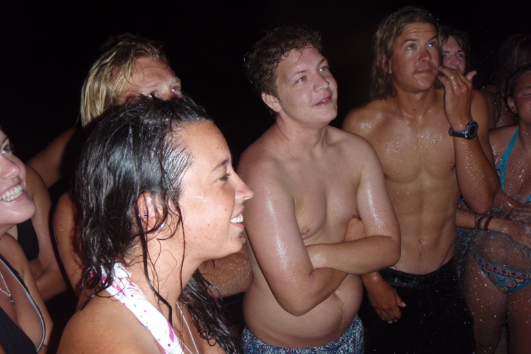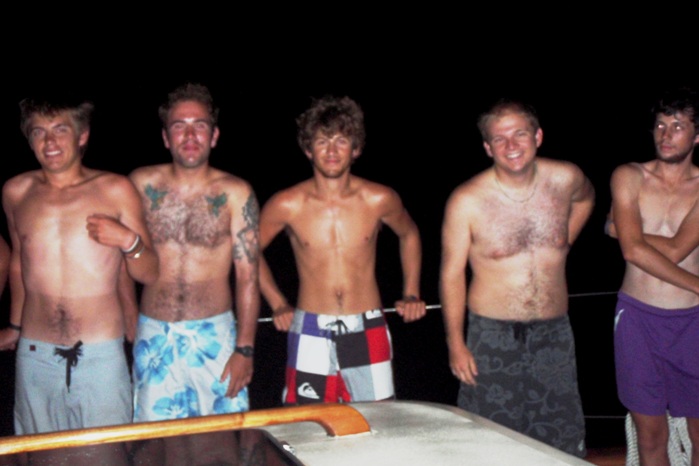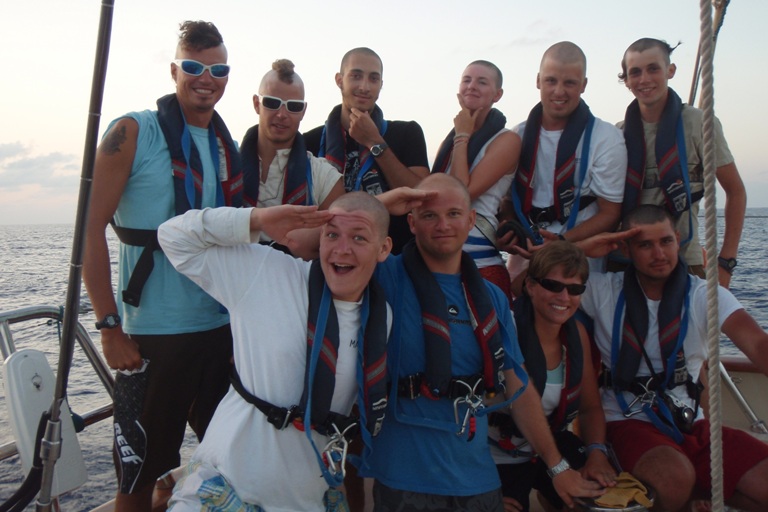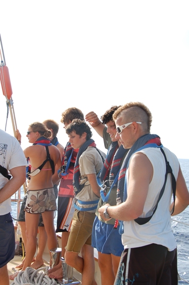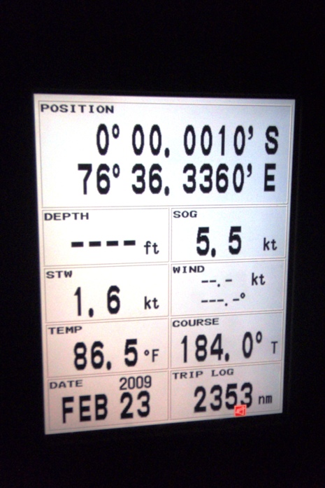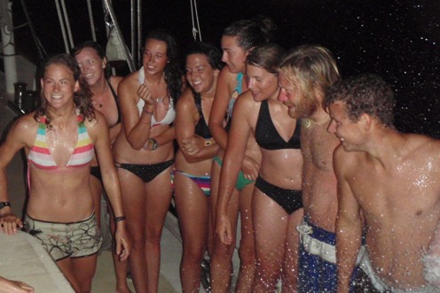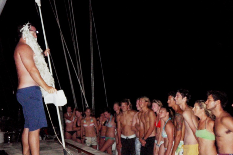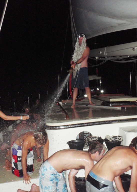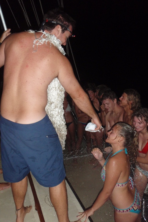 Our day began at 3 am when the “equator alarm” went off. We all scrambled up on deck in our swimwear, ready for the equator crossing ceremony. Once on deck, we were greeted by King Neptune (Boomer with a long beard and trident) and were told to crawl around the chart house, which symbolized crossing the equator. While “crossing the equator,” we were sprayed by the fire hose and sprinkled with flour, which was quite amusing. After, we had to kiss King Neptune’s ring and please the sea gods. Everyone on board is now officially a shellback. Later in the day, the equator-crossing ceremony continued with brave shipmates shaving their heads. Hopefully, the strong sun at the equator won’t result in a bunch of burnt scalps. When we finished our classes, we were able to heave to and go swimming in the middle of the Indian Ocean, which had approximately 15,000 feet of water under us! Everyone is adjusting well to being back on the watch schedule, and we are looking forward to more smooth sailing!
