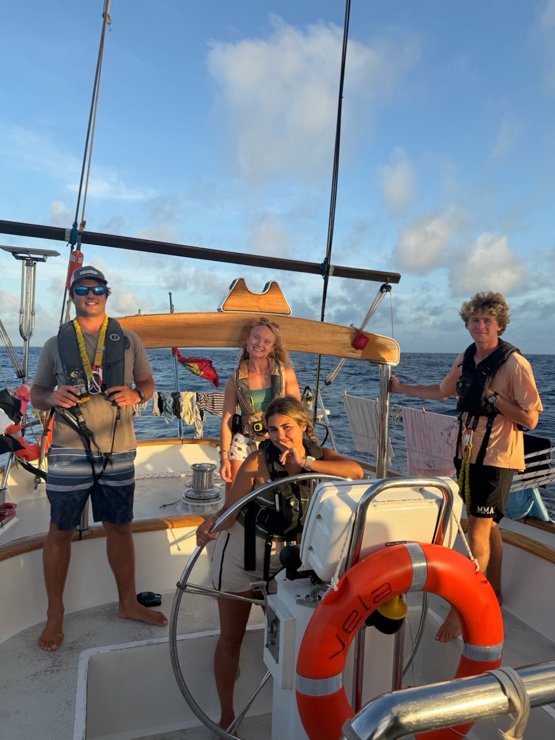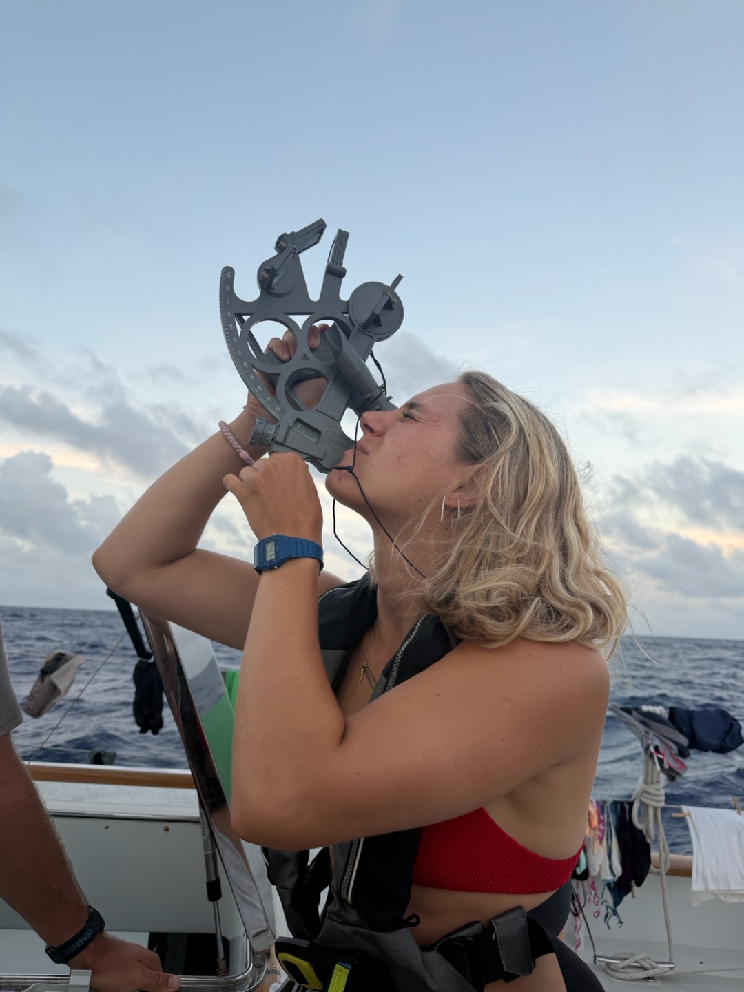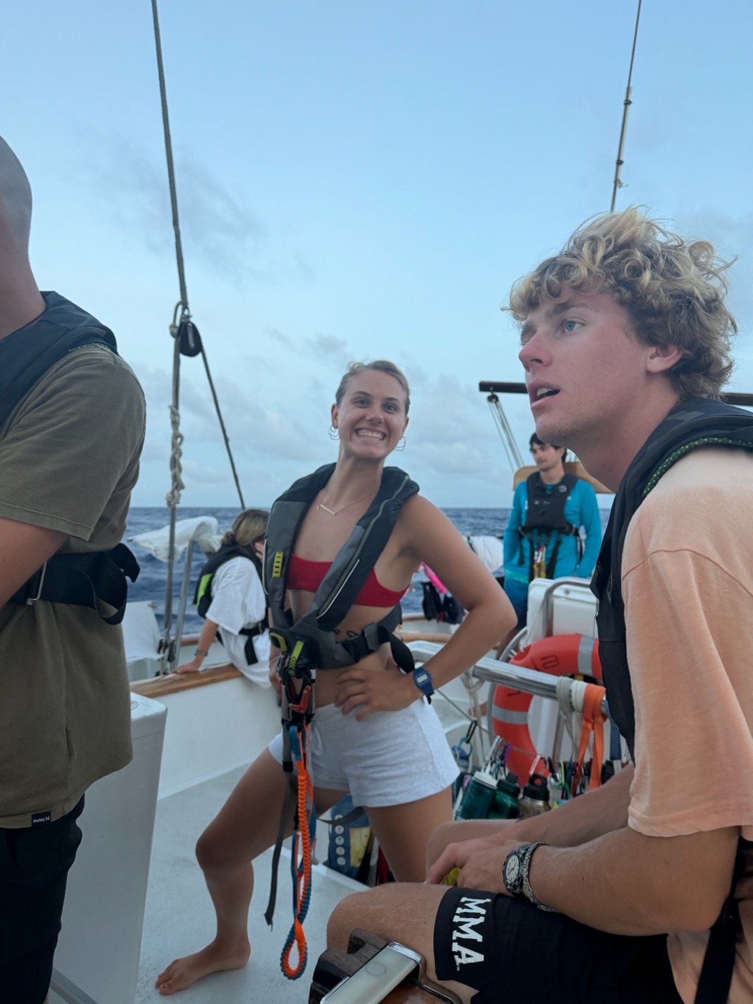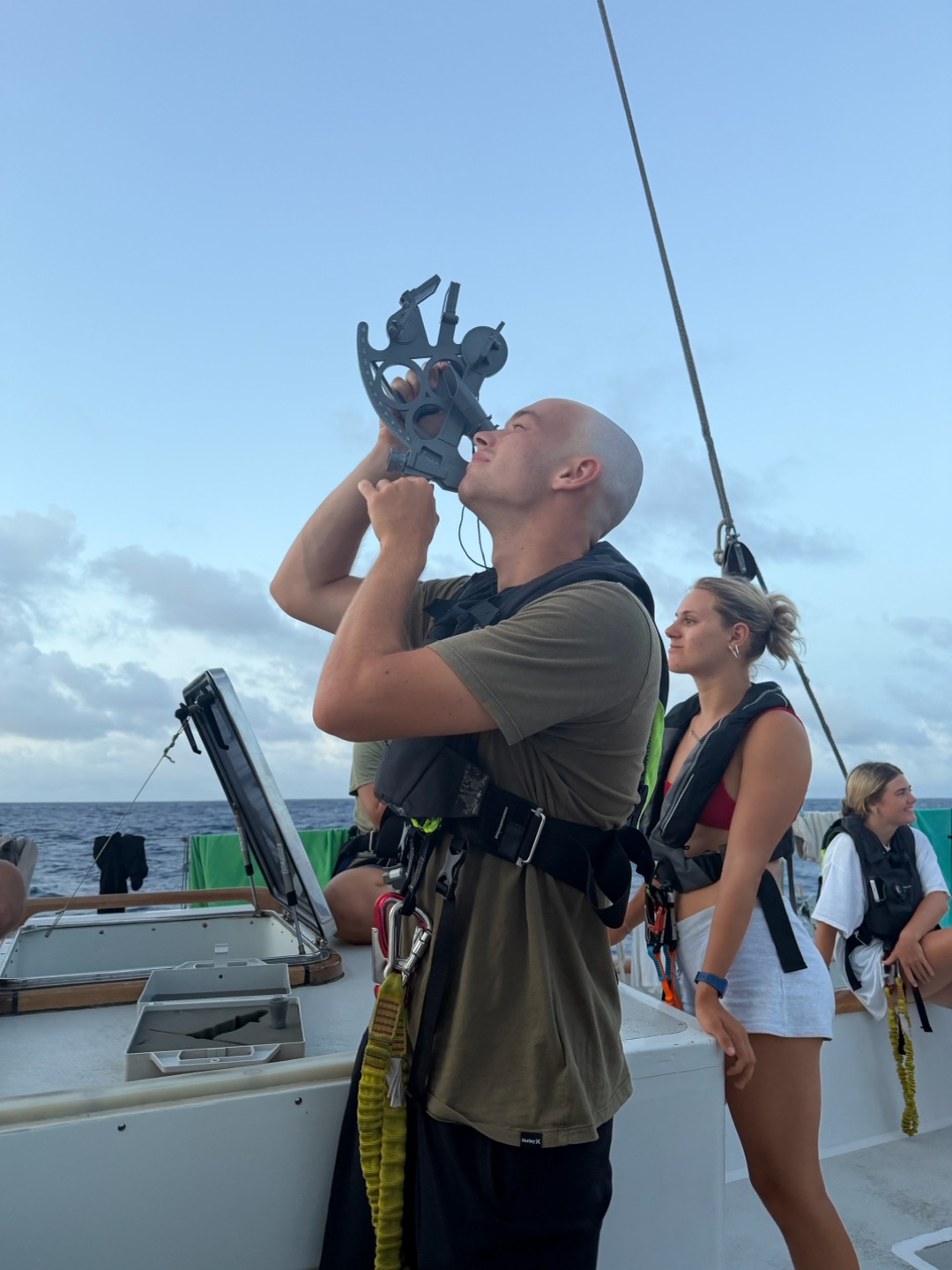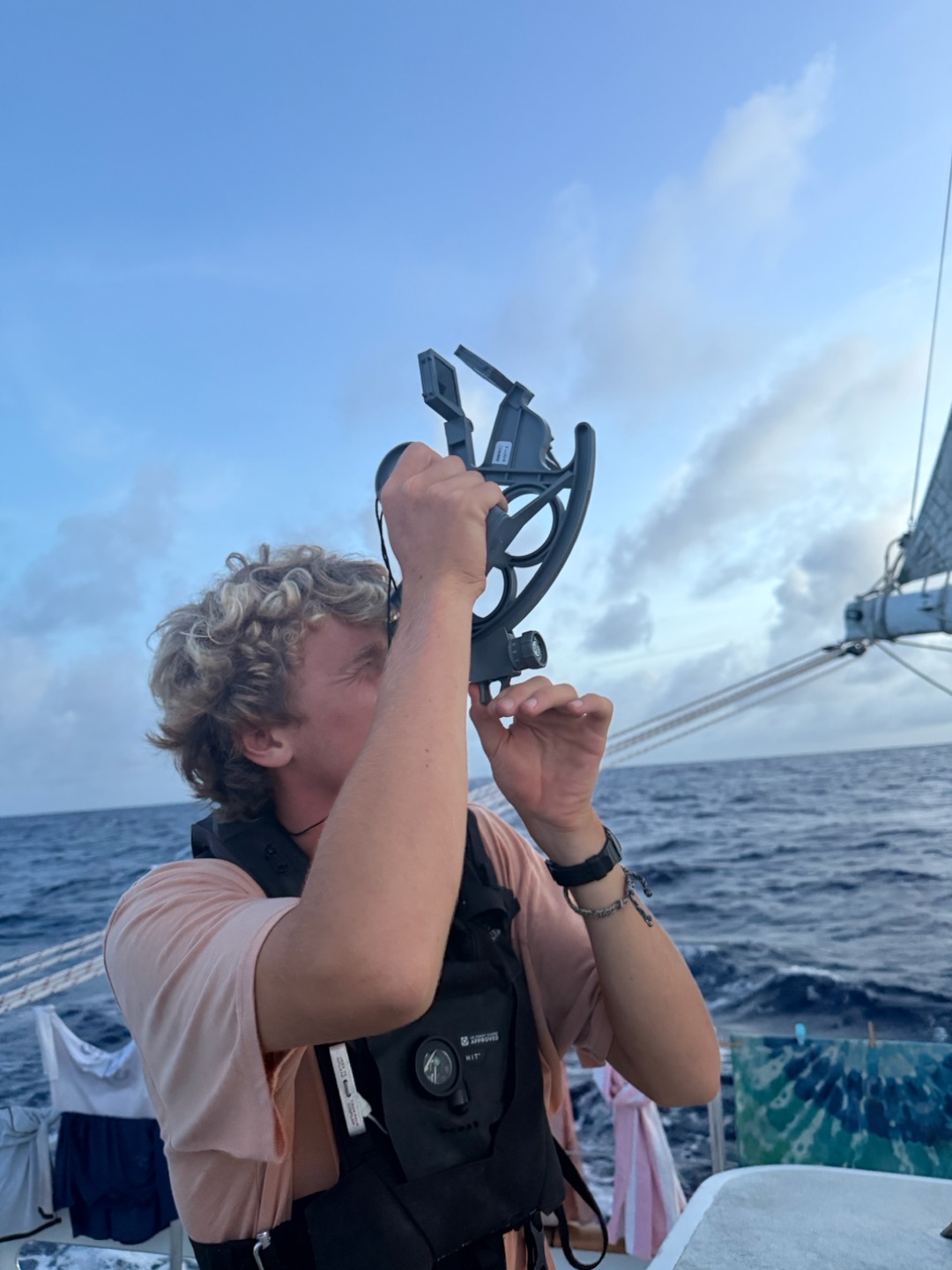 Were backkkk in the northern hemisphere! We crossed the equator at 3:58 after some evasive maneuvers to not cross before everyone who wanted to be up was up. Once everyone was up, we crossed, and it was pretty eventful. Lots of confetti and sprinkles and a giant camo line marking the spot. Mostly everyone woke up as we crossed and then immediately went to bed because we love sleep here. Watch team three then spent the 8-12 hours vacuuming the head bilges because we had a little faucet situation in the heads. Then we got everyone up, and on deck, because there was a fishing vessel that was coming to say hi, just jokes, they just passed by pretty close. After we had lunch, which was chicken with coleslaw made by Henry and Hannah K., we had leadership and oceanography. In Leadership, Hannah Y. and Henry did their chapter presentations, and in oceanography, we learned about winds and ocean circulation. Then we all had time to study for our marine bio test tomorrow, and Reed got his haircut by Vittoria and Erin. Dinner was more beautiful chicken and rice, thank you, Henry. After clean-up, Mac showed us the basics of the sextant, which was super cool. Its this fancy navigation tool that lets you measure celestial objects in line with the horizon, and now its back to watch. Bye bye