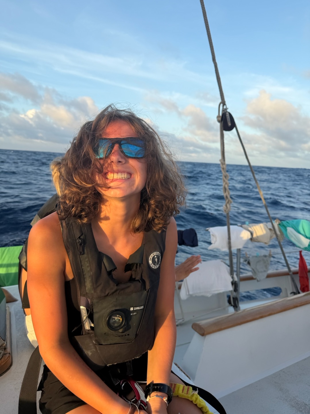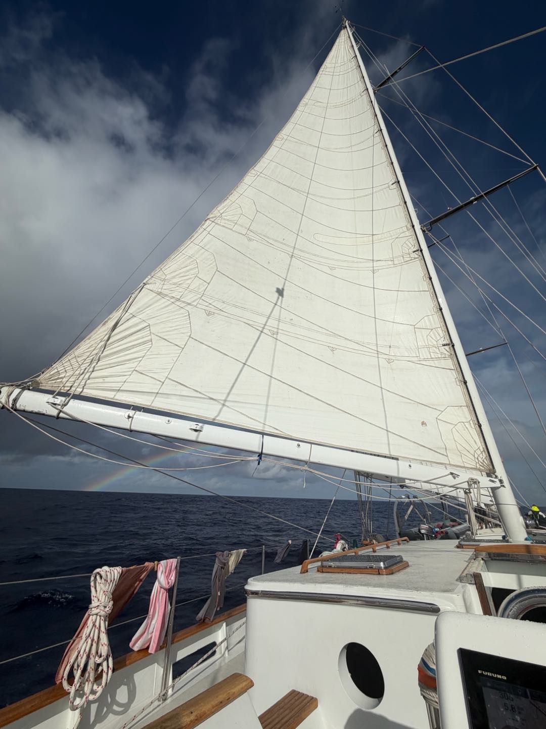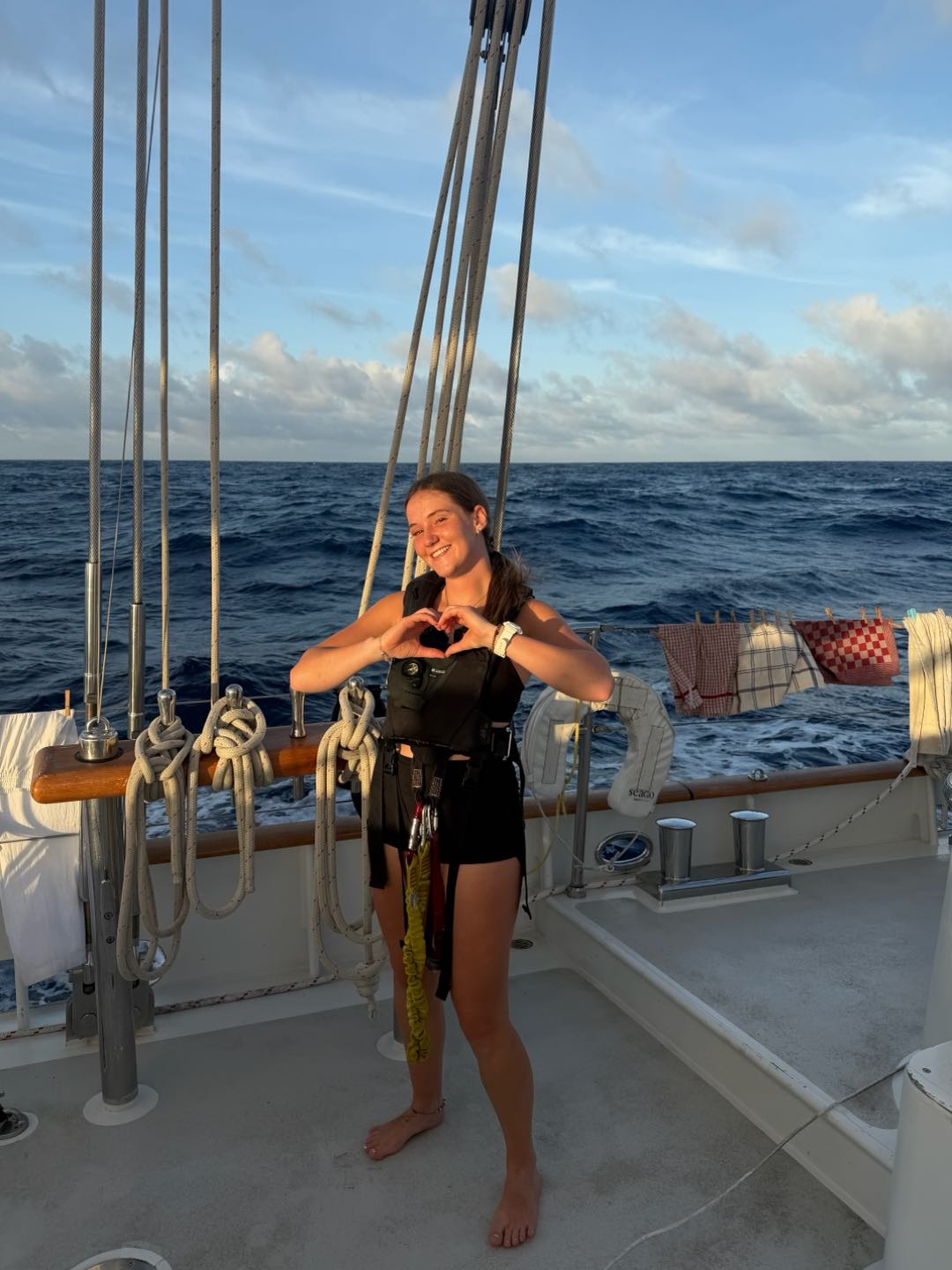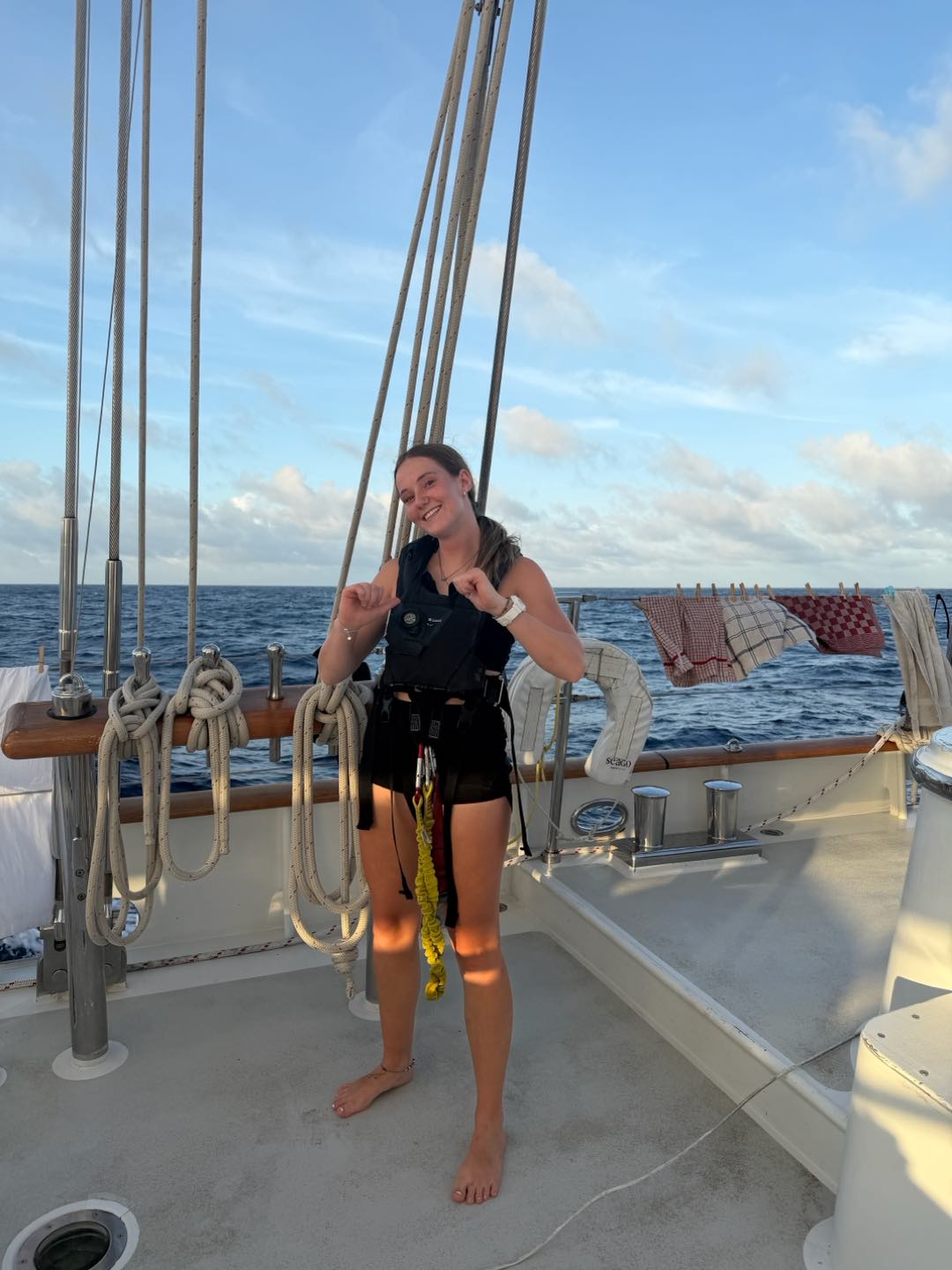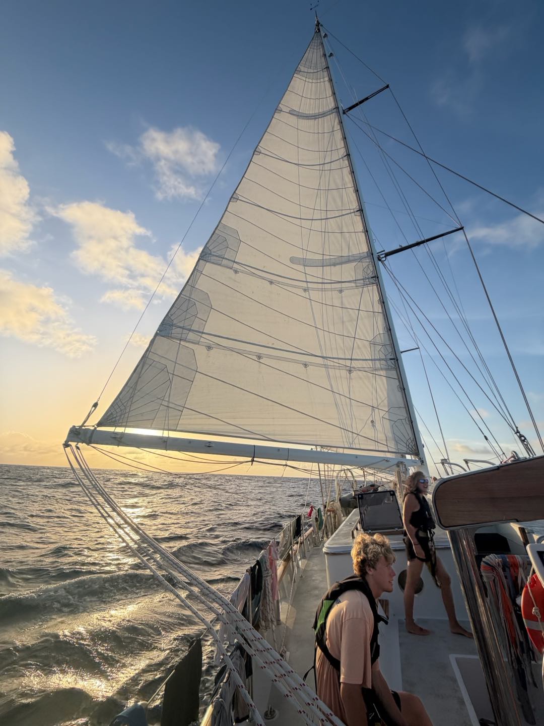 Were backkkk in the northern hemisphere! We crossed the equator at 3:58 after some evasive maneuvers to not cross before everyone who wanted to be up was up. Once everyone was up, we crossed, and it was pretty eventful. Lots of confetti and sprinkles and a giant camo line marking the spot. Mostly everyone woke up as we crossed and then immediately went to bed because we love sleep here. Watch team three then spent the 8-12 hours vacuuming the head bilges because we had a little faucet situation in the heads. Then we got everyone up, and on deck, because there was a fishing vessel that was coming to say hi, just jokes, they just passed by pretty close. After we had lunch, which was chicken with coleslaw made by Henry and Hannah K., we had leadership and oceanography. In Leadership, Hannah Y. and Henry did their chapter presentations, and in oceanography, we learned about winds and ocean circulation. Then we all had time to study for our marine bio test tomorrow, and Reed got his haircut by Vittoria and Erin. Dinner was more beautiful chicken and rice, thank you, Henry. After clean-up, Mac showed us the basics of the sextant, which was super cool. Its this fancy navigation tool that lets you measure celestial objects in line with the horizon, and now its back to watch. Bye bye
