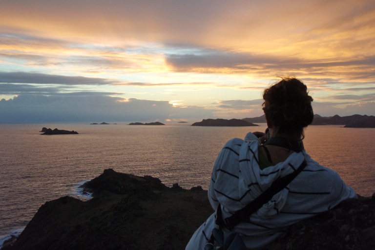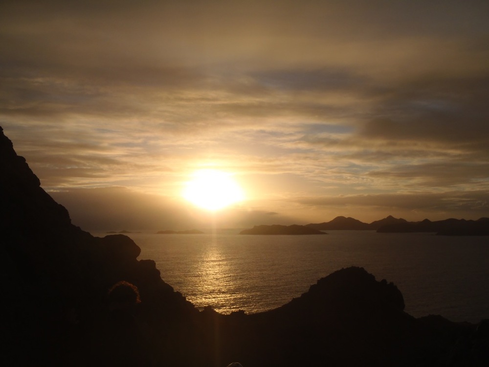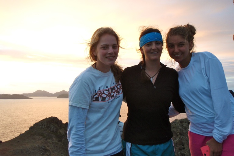 We kicked off the day at 4:30 AM to get to shore and hike to the peak of Ile Fourche for a magnificent view of the sunrise. It was dark and windy, yet nearly all of us chose to enjoy this rousing adventure. Headlamps and flashlights guided us up the rocky shoals, and despite the loose footing, we all made it to the precarious peak well before sunrise. It was a slow dawn with thick clouds on the horizon. Many killed the time by taking endless photos and blinding shipmates with their flashes. The sun inevitably came into view, and it was a spectacular sight, with Saint Barthelemy off to the right and nothing but sea standing between us and the dawn. As the sun rose, a voluptuous rainbow arched all the way across the southwestern sky, a heartfelt premonition of the good day to come. We spent the day anchored in the leeward cove of Ile Fourche. Everyone got to scuba dive in the morning. The non-certified divers were glad to be doing their fourth and final confined dive to reach certified status. After lunch, I spent a good two hours on the bowsprit with my guitar, making music and watching life as it bustled on and around Argo. It was an afternoon of peaceful relaxation, followed by super-science time with Casey and Kristine. We pulled all of the science gear up from below deck and explored the chemistry set, microscopes, and plankton net, among other things. This was to help spark inspiration for our group research projects, for which proposals will soon be due. The evening’s class was an oceanography lecture on the chemical properties of water, after which the very tired shipmates went off to bed. Now, one-ninth of the way through this program, students have already begun to buzz about never wanting it to end. From before sunrise to after sunset, we’ve had another good day aboard S/Y Argo.