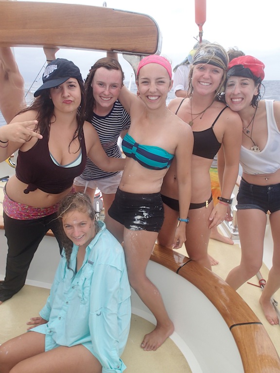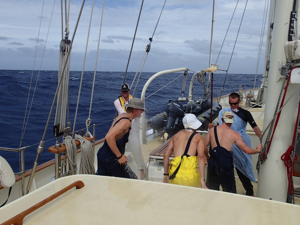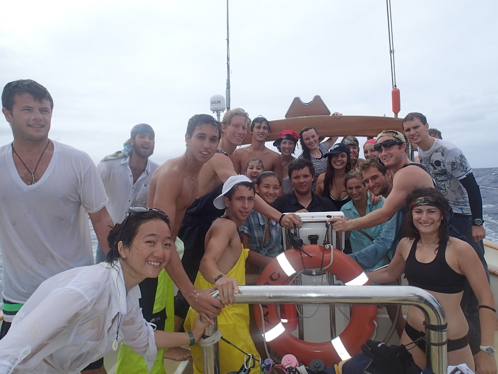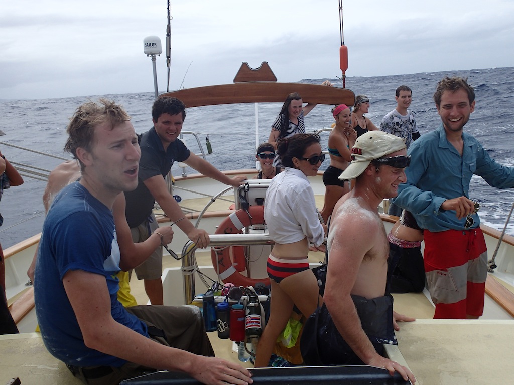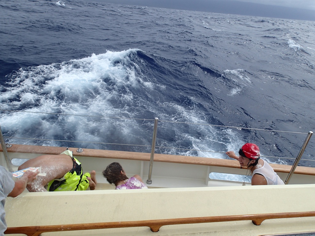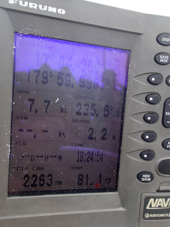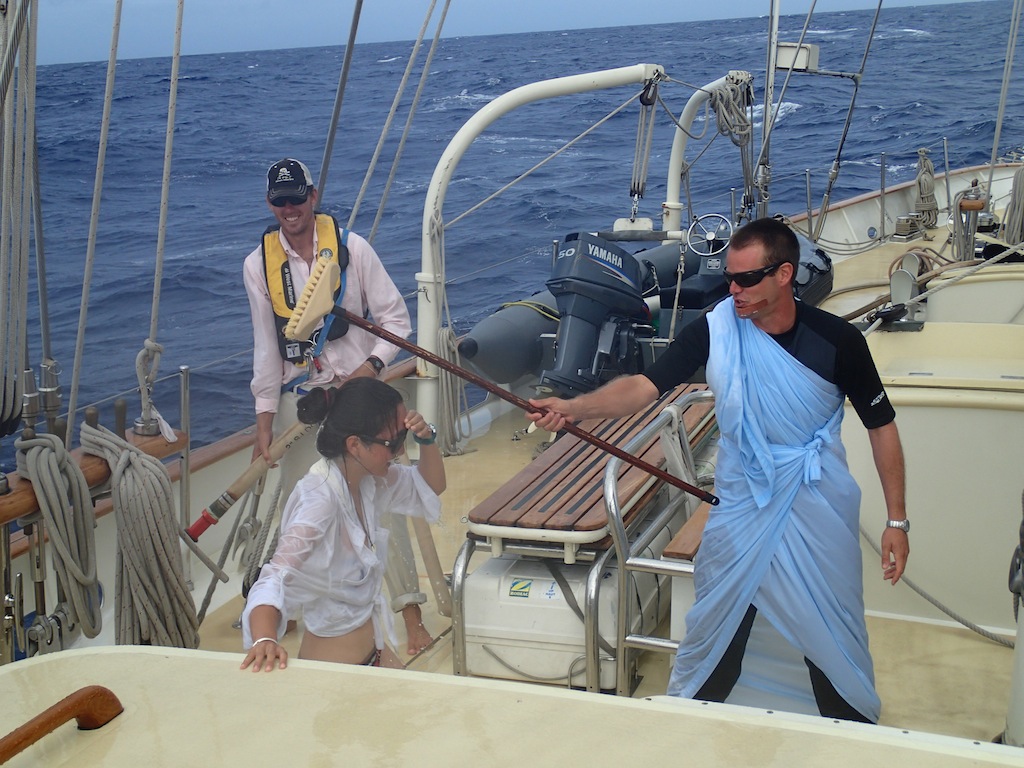Hello to all of you pollywogs out there. We had become shellbacks today when we crossed the 180-degree mark. For the crossing over the 180-degree mark, Poseidon summoned two whales to circle the boat while we went through the shellback ceremony to consume all those who were not worthy of crossing into the eastern hemisphere. The whales did not have a meal that day, for we all proved to Poseidon that we were worthy. Later in the day, we made it to our next port of call, Savusavu, Fiji. We were going fast enough that we got in eightish hours early.