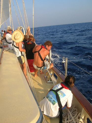 Today was an exciting day; we watched a really cool movie about Irving and Exy. Then, later, a large rusty tanker was coming towards us, and we tacked to avoid it. Also, we had banana bread for dinner, which was really sweet.