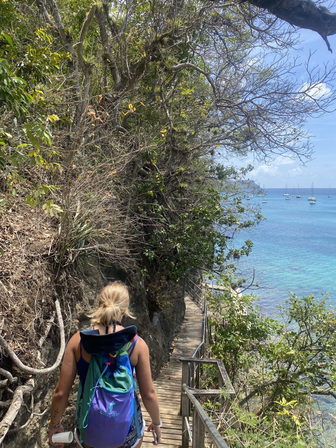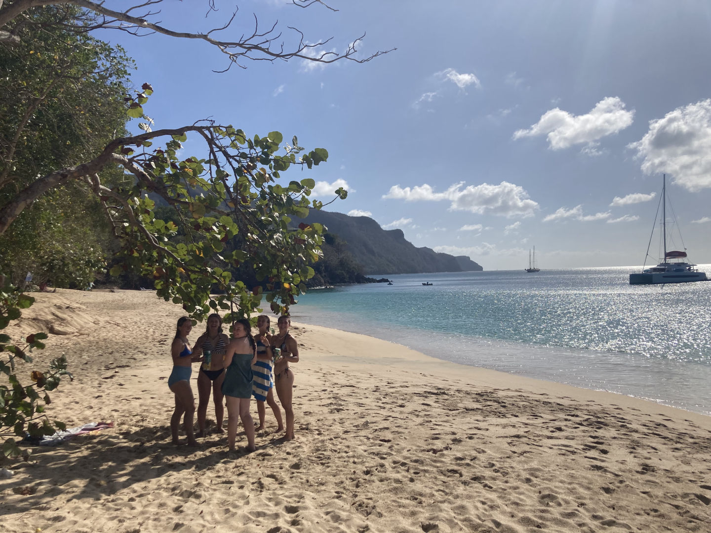 On land, I walked along this really gorgeous little boardwalk that bordered a few of the local beaches and rock faces. I met up with Brina in town, where we walked around for a little bit exploring the area. Earlier in the morning, she had walked to the far side of the island to explore all of the cute and colorful houses. She and some of the girls also walked around and did a bit of grocery shopping before I got there. And quite a few of us bought matching necklaces! Although many of them were lost to the ocean only a few hours later. Brina and I found a very cute and friendly little puppy, and there were dogs all over the place that would come up and say hi. We also got some ice cream from a local ice cream shop and ate some frozen mango chunks. And then we headed to the beach to meet up with everyone else! There was some very intense football playing, snorkeling, beach exploration, shell collecting, and questionable rock climbing (mid-form). Will, Zoe, Liz, Brina, and Katie explored the catamarans anchored nearby and dove to touch the anchors. There was a really pretty cave nearby that we went to check out, which was gorgeous. And then, the boys wandered away to go find food, and MG, Brina, Zoe, Liz, Katie, and I stayed back for a bit, playing music, swimming, and napping on the sand. And then 4 pm came around, and it was time to go back to Argo!