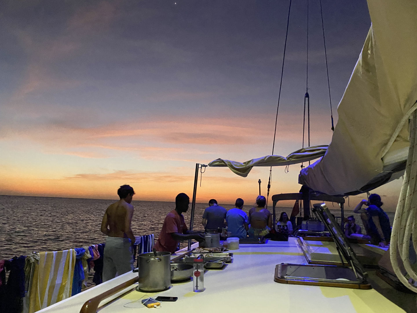 We took some quick ocean showers, did a bit of studying, and Brina and I danced for a while above deck. Beau has enjoyed singing off the martingale as of late and spent some time doing that. Nat cooked us empanadas tonight, which were amazing and worth the time delay for dinner. Her sous-chefs were Ben, Tim, Elene (who made corn salad) and Max (who made dough). There was a beautiful sunset, and a few people claimed to see a baby green flash. My squeeze question for the day was to tell two truths and a lie but don’t ever say what the lie was. It was fun to hear everyone’s crazy stories that may or may not have been true. And that was the day! We’re currently in the process of cleaning up the many dishes and dirty galley from dinner, and then we will have a late-night marine biology class. My research group (Nick, Audrey, and Golden) is planning on collecting some data for our fluorescent microalgae project after class. And then it will be time to catch up on journaling, maybe do a little NavMaster practice, and go to bed!