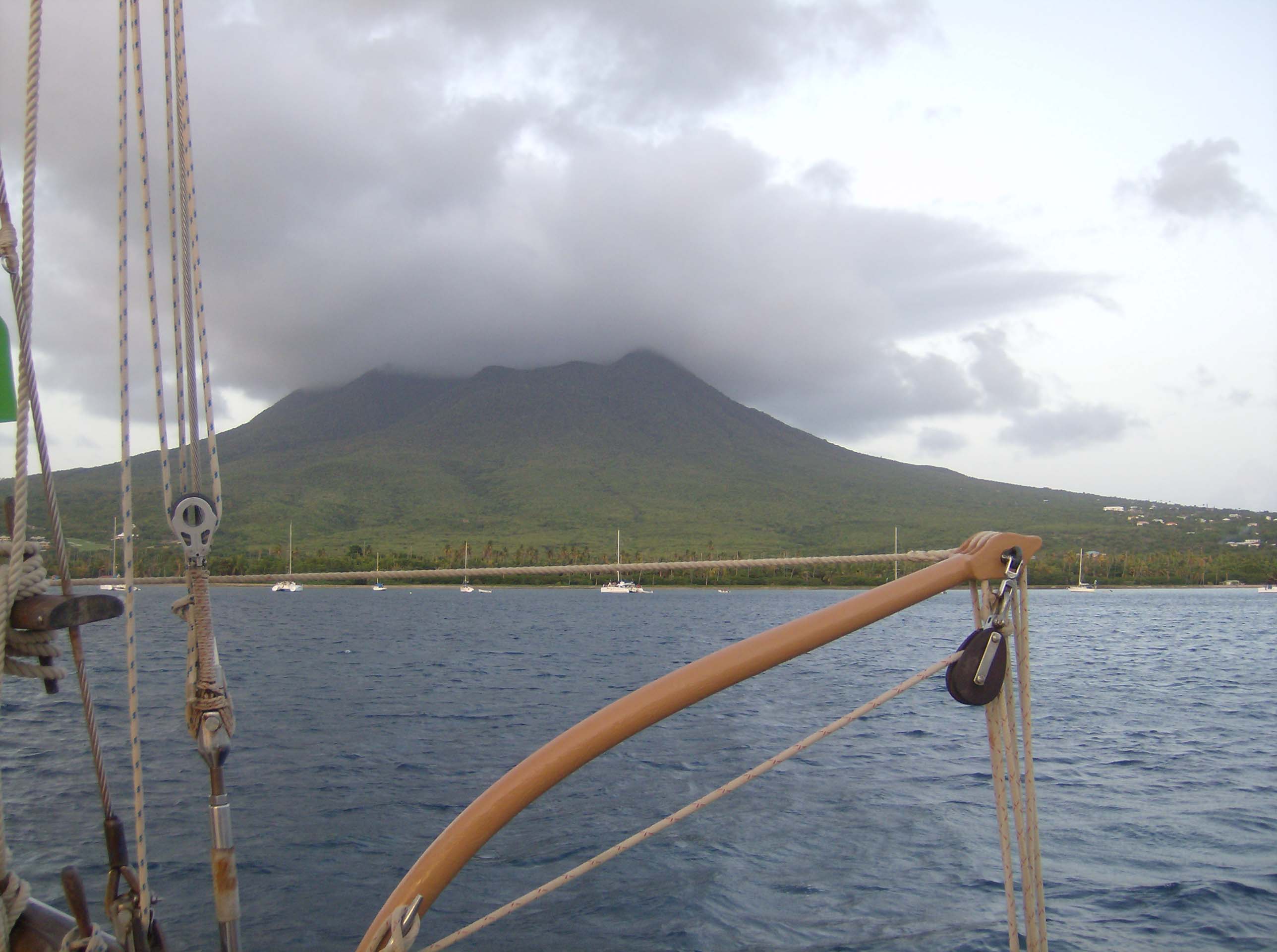 The boat was really moving around as soon as we passed Round Rock on our way to Nevis. It didn’t take me long to realize that I would rather be on deck than below and that the only thing I would be doing below would be sleeping. The pop-tart watch team, although shorthanded yet still amazing, is comprised of me, Caitlin, and Captain Dan. We make a good team, rotating between helm, boat check, and bow-watch. The helm was my favorite, specifically while we approached Saba at 0300 hours. The only things visible were the spray coming from the bow, faint boat lights in the distance, and the murky, looming presence of Saba on the horizon. What an experience.