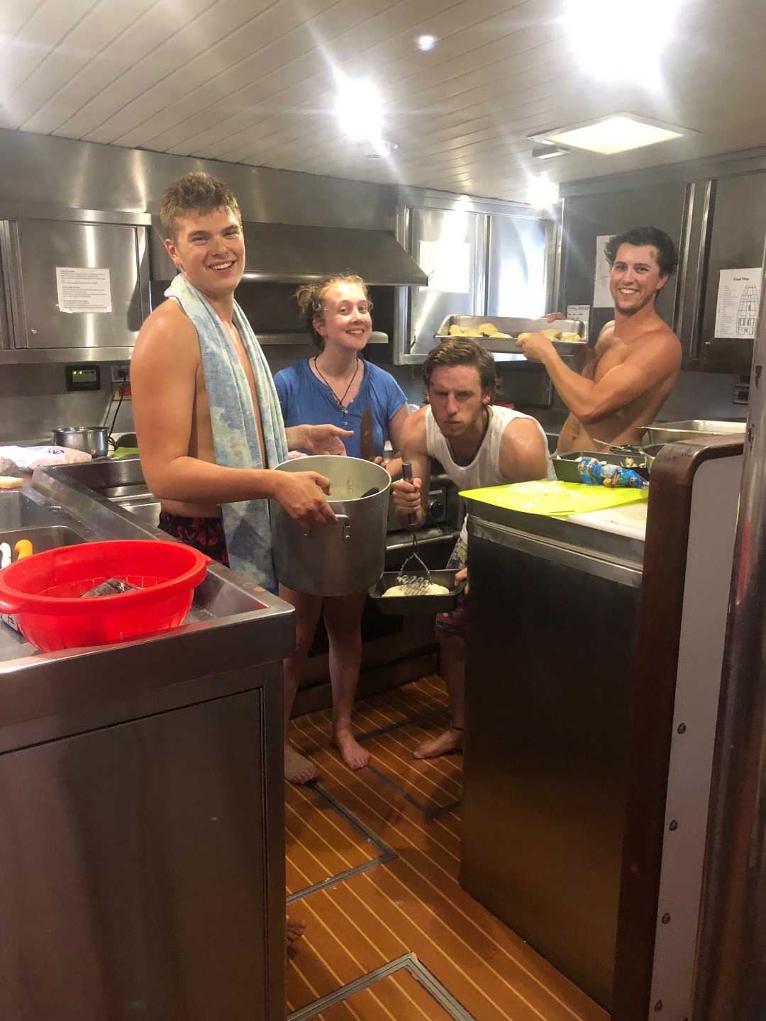 Pictured: Pic 1: Sam, Panos, Frank, Henry, James, Garrison, Margaux during knot-lympics; Pic 2: Danny, Coral, Rhea, Emily, and Anastacia; Pic 3: The rocking cooking team, Garrison, Anastacia, Henry, and head chef Sam.
