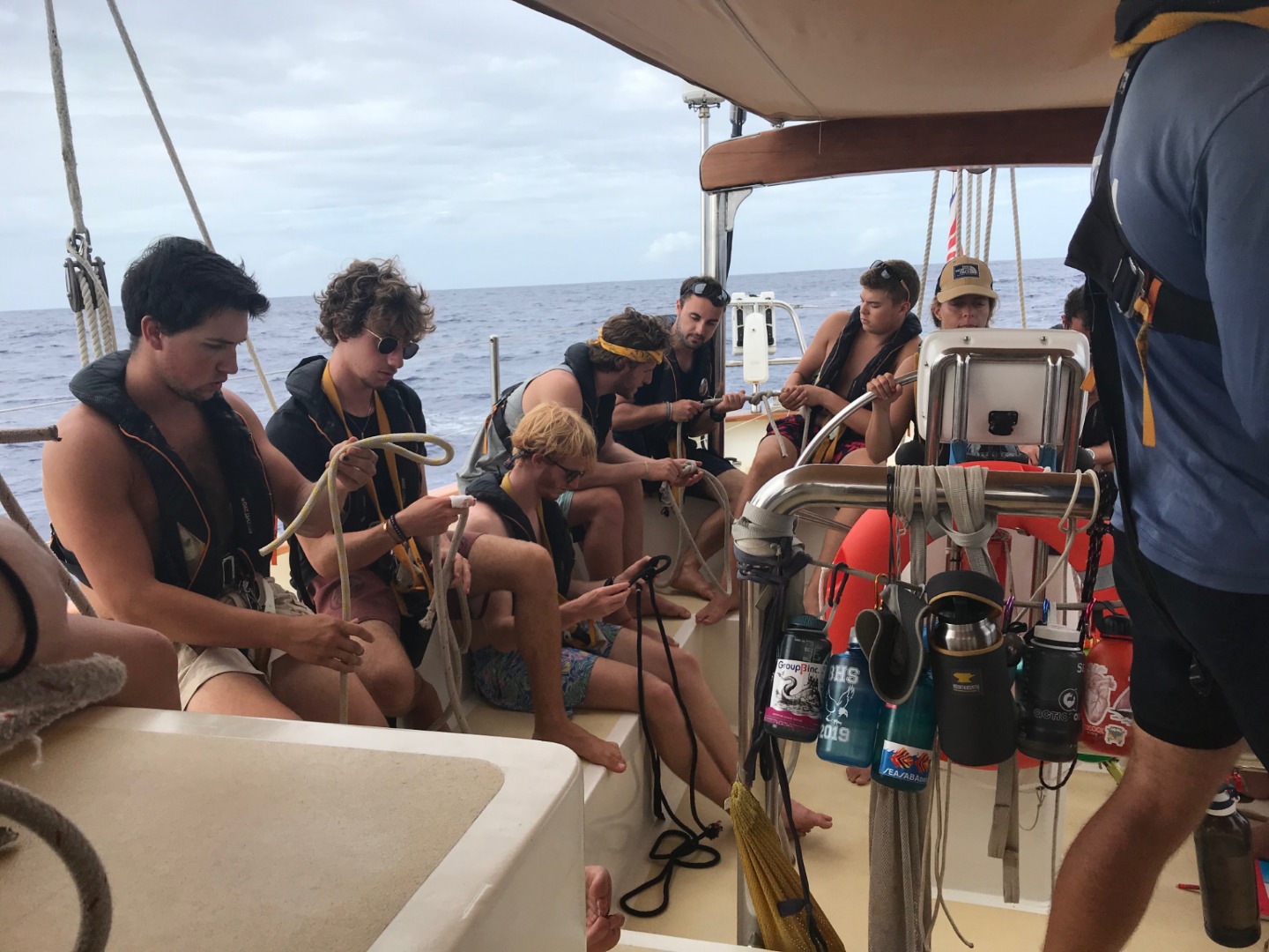 The rest of the day was also beautiful and warm. We enjoyed the good food prepared for us by the rocking cooking team, Sam, Garrison, and Anastacia. After lunch, students had an Oceanography lecture with Amanda about salinity and characteristics of seawater. It was followed by a seamanship class led by Tim. The class started in the cockpit with Knot-lympics, where students reviewed the bowline, sheet bend, clove hitch, and many other important sailing knots. I really enjoyed watching the knots progress while being at the helm. I am so proud of how eager they are to learn new things. The class kept going in the salon with a review of the ICC exam.