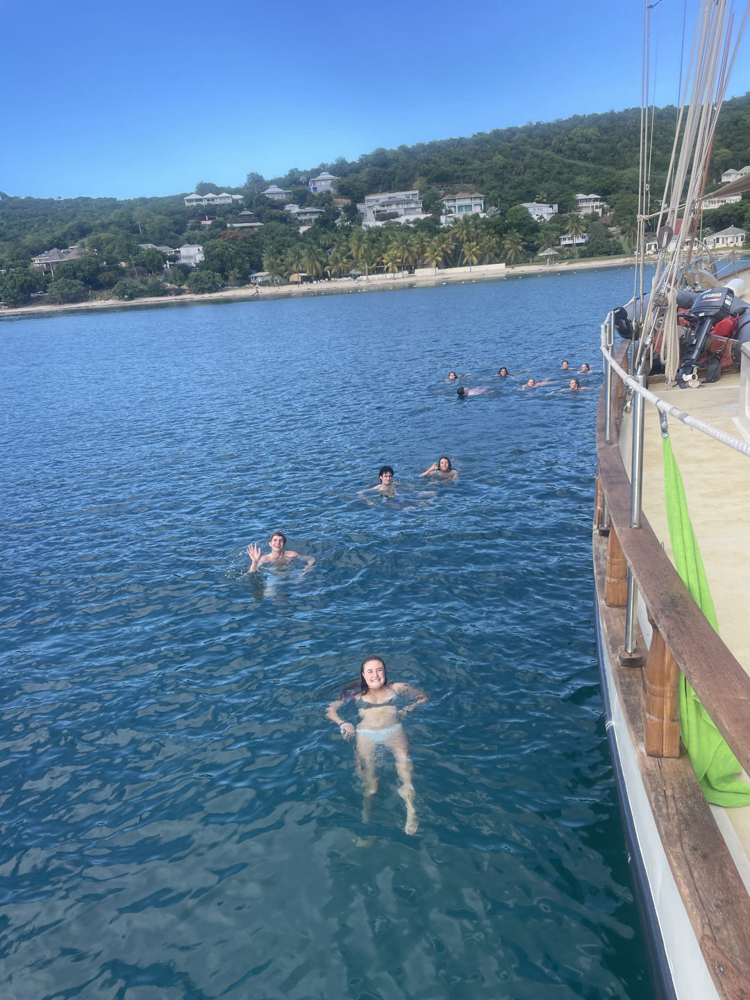 After a much-needed night of sleep, we woke up, had breakfast, and then got right to work. In the morning, we handled any loose ends by going over policies and what was to be expected of us during our time on Ocean Star. Then, we learned about different parts of the boat. After that, we ate some lunch and got ready to leave the Antigua Slipway in English Harbor. Unfortunately for us, our neighboring ship’s anchor had crossed with ours, and it took some extra work to get it back on board, but it gave us some extra time to get started on our open water diving course. We left English harbor and sailed around the corner to Galleon Beach and dropped anchor. With plenty of time left in the day, we continued working towards our scuba certifications by getting into to basics of scuba diving. We followed that up with our first ocean shower, a swim test, and then our first fire drill!