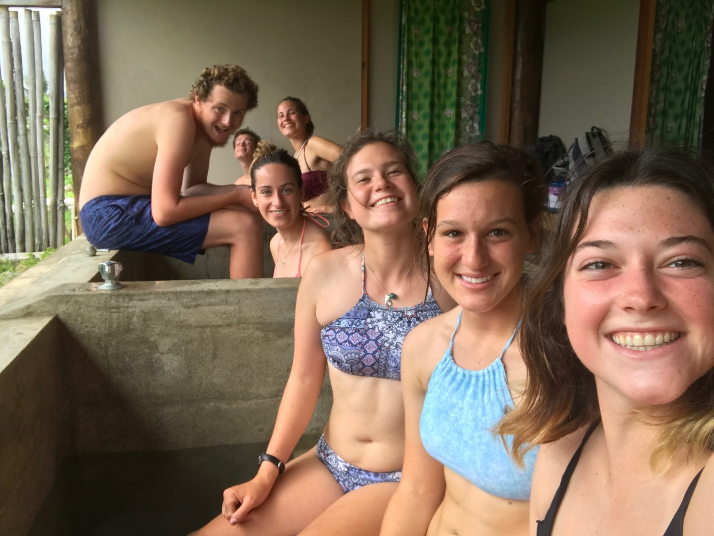 One of the highlights from today was getting to sit in the mineral baths (see the picture of Griffin). The water comes from the volcanic hot spots on the island, but it isn’t nearly as hot as the actual hot springs that run into the ocean. Griffin, Taylor, Meg, and I went on a spontaneous hike up a very large hill that we spotted from town. As we were halfway up in our flip-flops, we realized that it was a bit steeper and muddier than we had planned on, but the view was worth it. As we made our way back down the mountain, Taylor slipped a few times and eventually took Griffin down with her. Zoe and Evan also went on a mid-island hike to the top of an island, and we’re fortunate enough to hitch a ride in the back of a local man’s pick-up truck. After getting back and taking ocean showers, we ate risotto and baked potatoes for dinner made by our amazing chefs, Olivia, Steve, and Mike. Now we are ending the day with some night dives and hot chocolate (since the water is a little colder than in French Polynesia)!