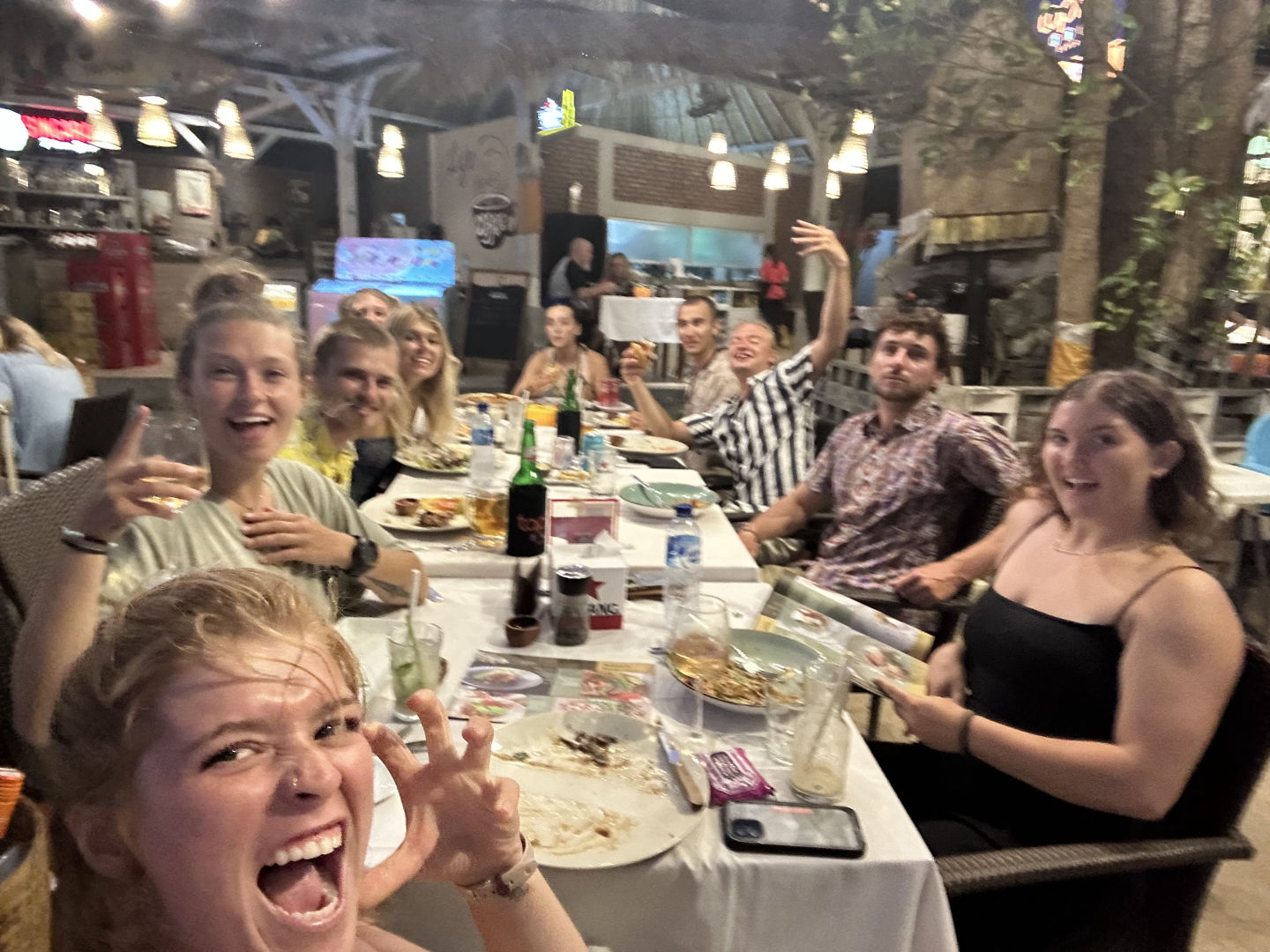 Let’s start with some easier stuff, like the facts of what we did todayup until around 2:00 PM, our day consisted of the last parts of our deep boat cleaning session. We finished up everything we did not get to do yesterday and prepped as much as we could for the travel day tomorrow. After all the necessary tasks were done, we were free to do what we wished. For some, that was running to shore to get a massage or last-minute travel supplies (me because my backpack literally molded over), and for others, it meant finishing up their goodbye cards to each other. Just in case you don’t know, this is a bittersweet Seamester goodbye tradition that takes place at the end of every voyage; we all write cards to each other and are given all the ones that were written to us as we leave the boat on the final morning. The next task in our day today was meeting in the cockpit around 4:30 for our final squeeze session. The question I chose for this afternoon was, “If you had to go back and do it all again, what is one thing you would do differently and one thing you would keep the same?” A range of thoughtful, silly, and lovely answers were given, leaving me teary-eyed throughout most of the process. We then grabbed our shoes and headed out to dinner – we would have one last signout night and a sit-down dinner at a restaurant on shore. We all ate fantastic food, took many pictures, and reminisced over all the memories this trip had given us. We then walked back to our home one final time and began winding down for the evening. The sight of our ship illuminated against the night sky was a sight to see. People stayed up talking and listening to music, not really wanting to face the inevitable goodbyes that tomorrow was going to bring. Rest assured, my dearest crewmates and I are not taking the present for granted at all tonight.