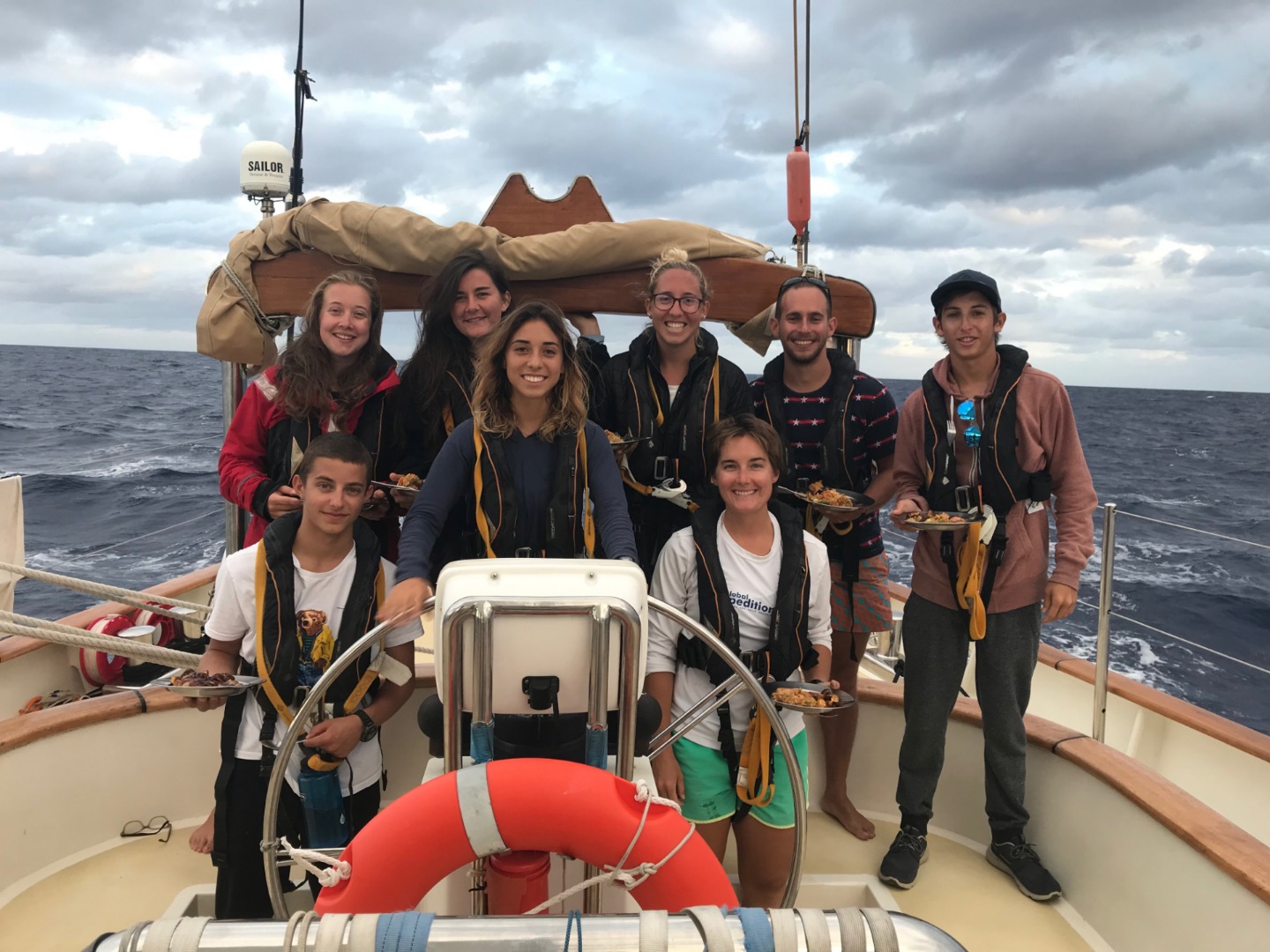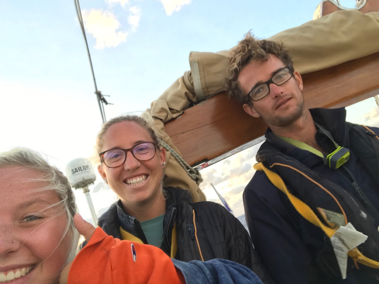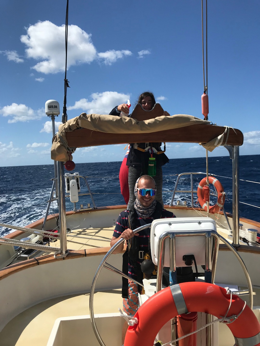 Pictured: Watch Team 3 before dinner on our final night underway; Kari, Shelby, and Tim in the cockpit; Emily sneakily spraying Raul with the “sleep prevention device” that Watch Team 1 invented for night watches.
