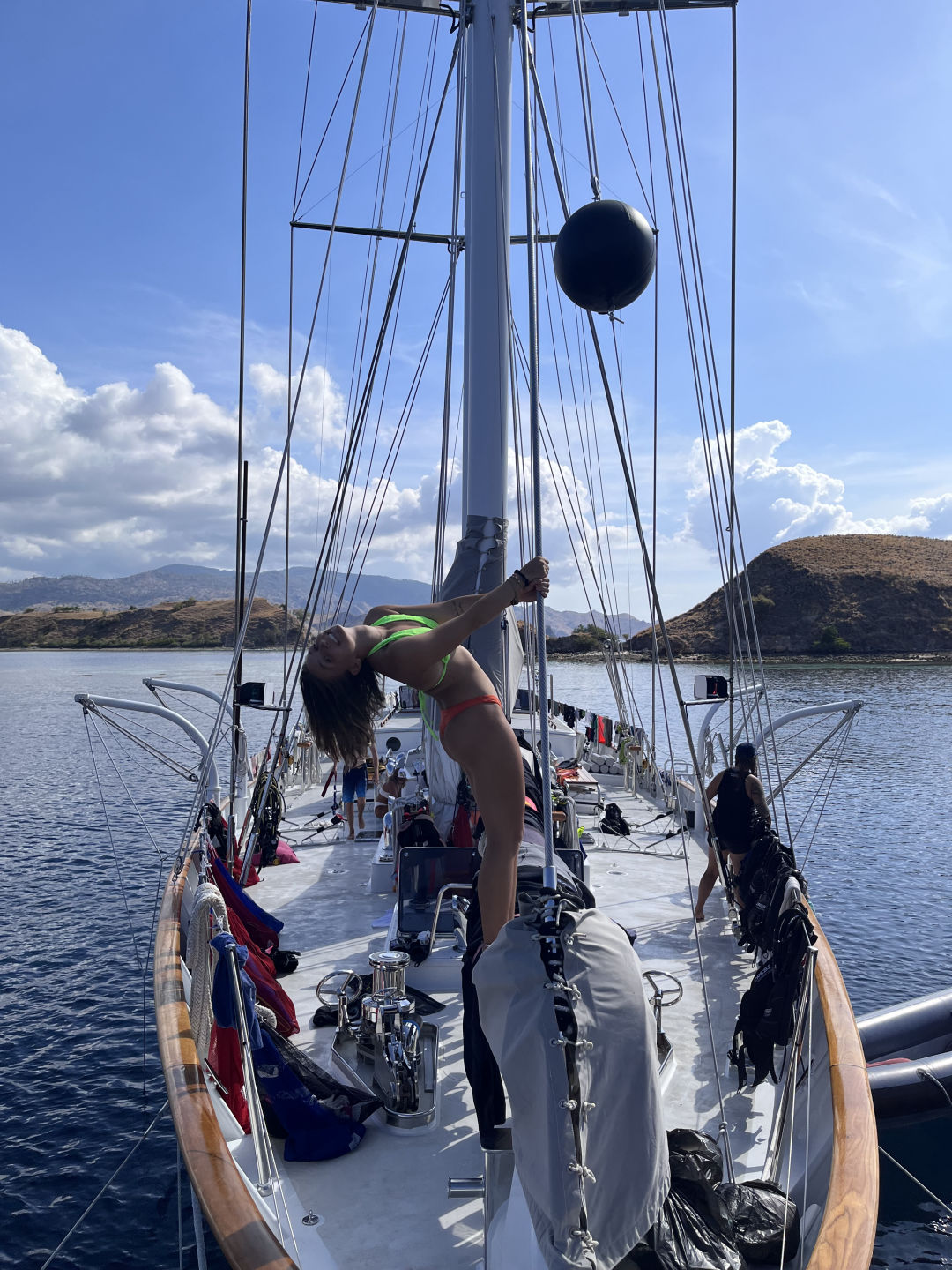 Today we woke up underway to our final stop in Komodo, and it’s absolutely gorgeous. There are tons of deer hopping around on the beach, and they’re so cute. We had an amazing breakfast of pancakes made by Romeo, Kara, and Margret before having our final marine bio quiz on the deep sea, polar climates, and conservation. Our first of three dives got all of us through our Advanced Diver Course!!! We did a short deep dive where there was nothing but beautiful teal water all around before hopping back in the dinghy and doing a reef dive. The coral was expansive, being continuous from 5 to 60 feet deep with lots of smaller fish. Our amazing chef team then made much-appreciated quesadillas and tomato soup for lunch. After that, we had two more dives where they saw a couple of sharks and a stingray. We did passage prep lead by our amazing new skipper, Dray, and it went off without a hitch. We had Margret’s famous pizza for dinner, and it was as impressive as always. I genuinely have no idea how she always gets it done on time. We had our final dive tank train after cleanup, and currently, everyone is doing a final push study for the nav master exam tomorrow.