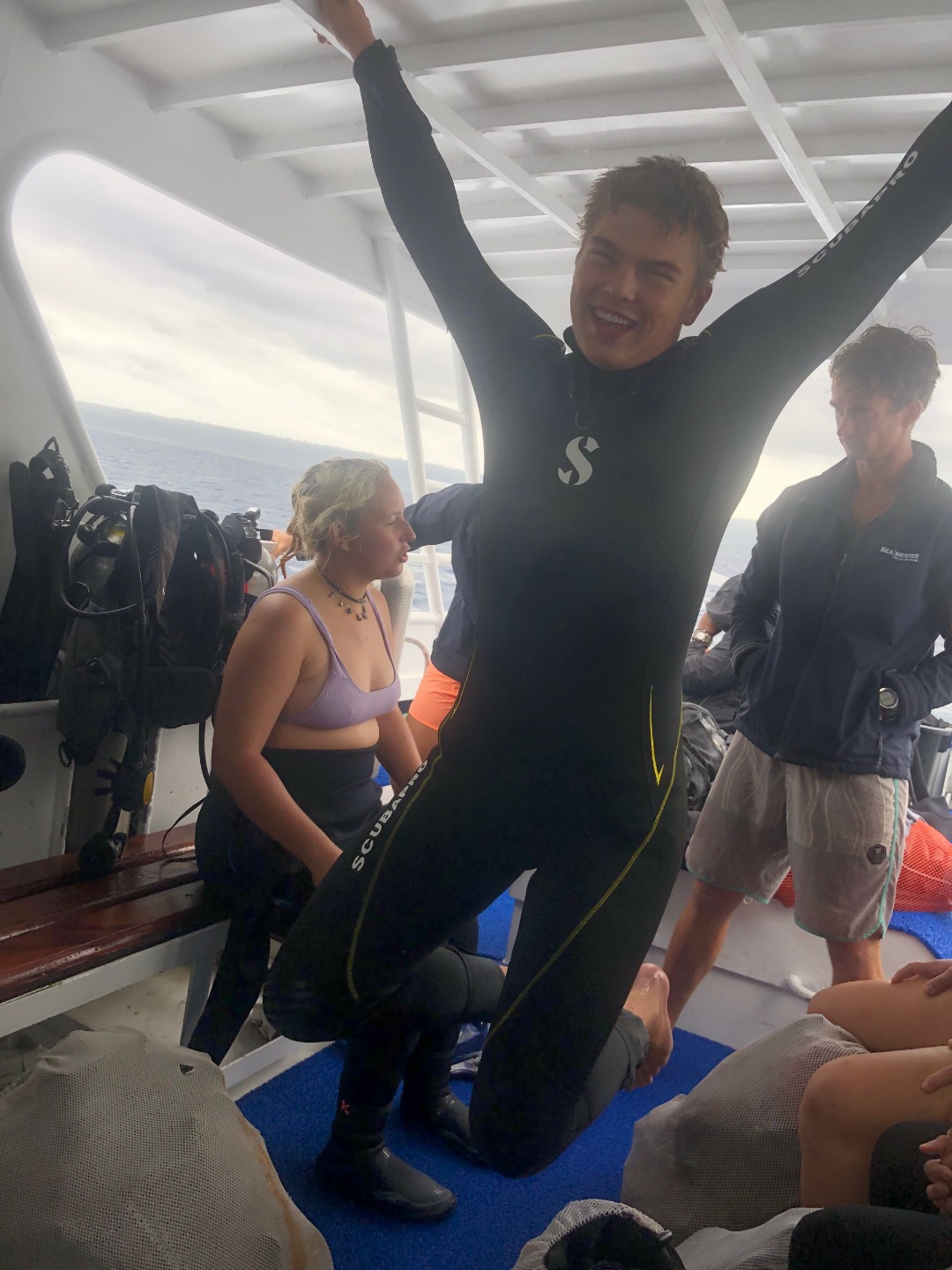 Today we woke up to a delicious breakfast of cinnamon rolls, courtesy of Coral. It was an early morning as we continued in our groups from yesterday, with the second group getting to go diving this time and the first getting shore time. Yours truly was part of the shore contingent, so I can’t speak firsthand about the dives. Judging by the reactions of my shipmates when we met up at 3:00, though, they had just as fantastic a time today as we did yesterday. This is some of the healthiest, most pristine coral that we’ve seen on our trip. In the words of Shelby, she who has logged 3,000+ dives, TOP FIVE! TOP FIVE DIVES EVER!