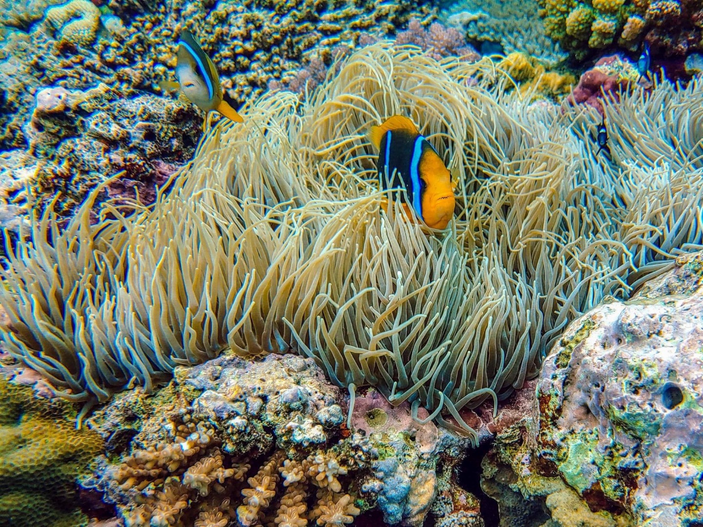Pictured: Garrison, Emily, Amanda, Tim, Rhea, Coral, Lucy, Kari, and Frank excited about the amazing diving; Garrison is just hanging out during the surface interval; beautiful fields of plate coral; an anemone with its anemone fish!