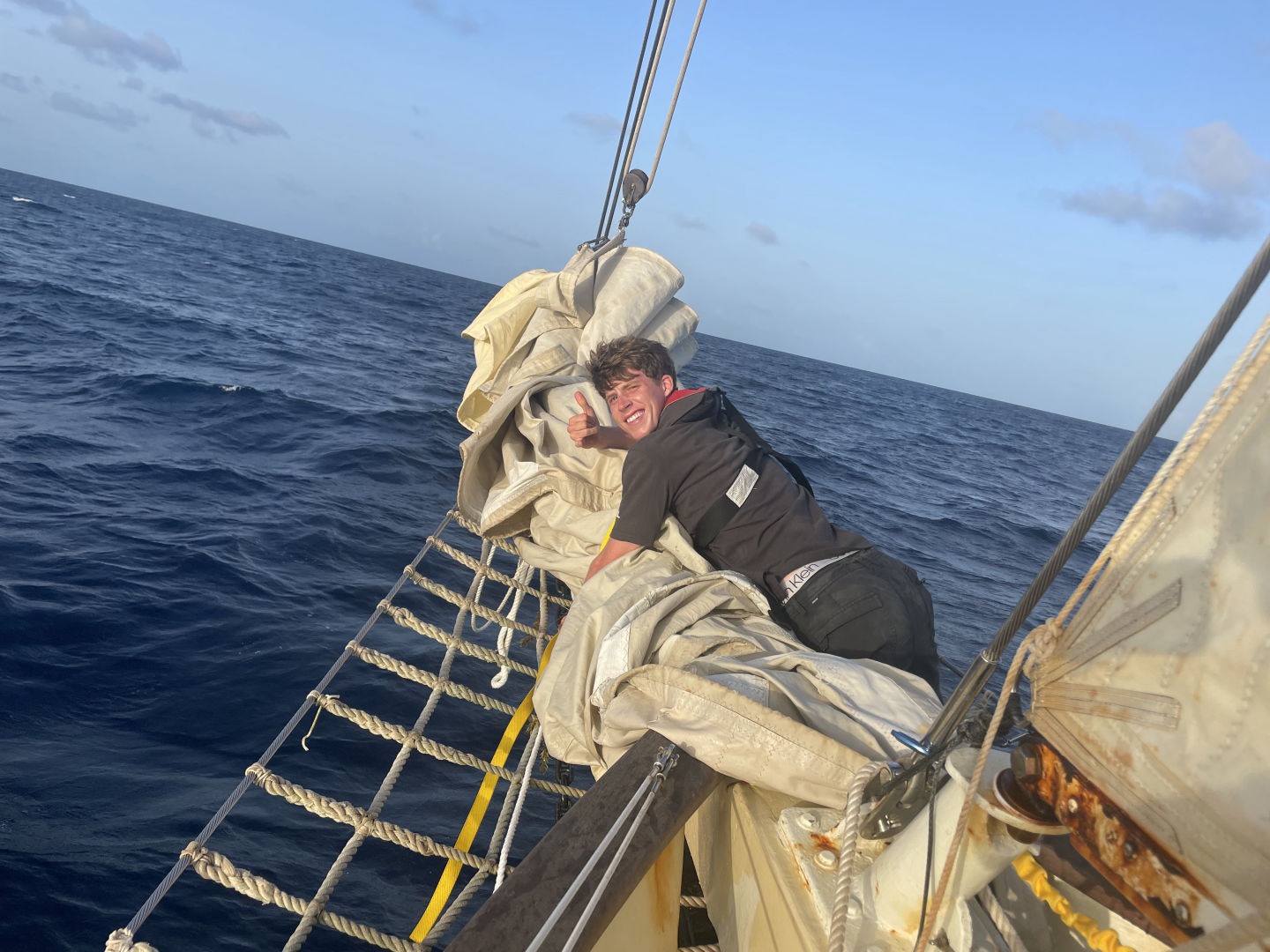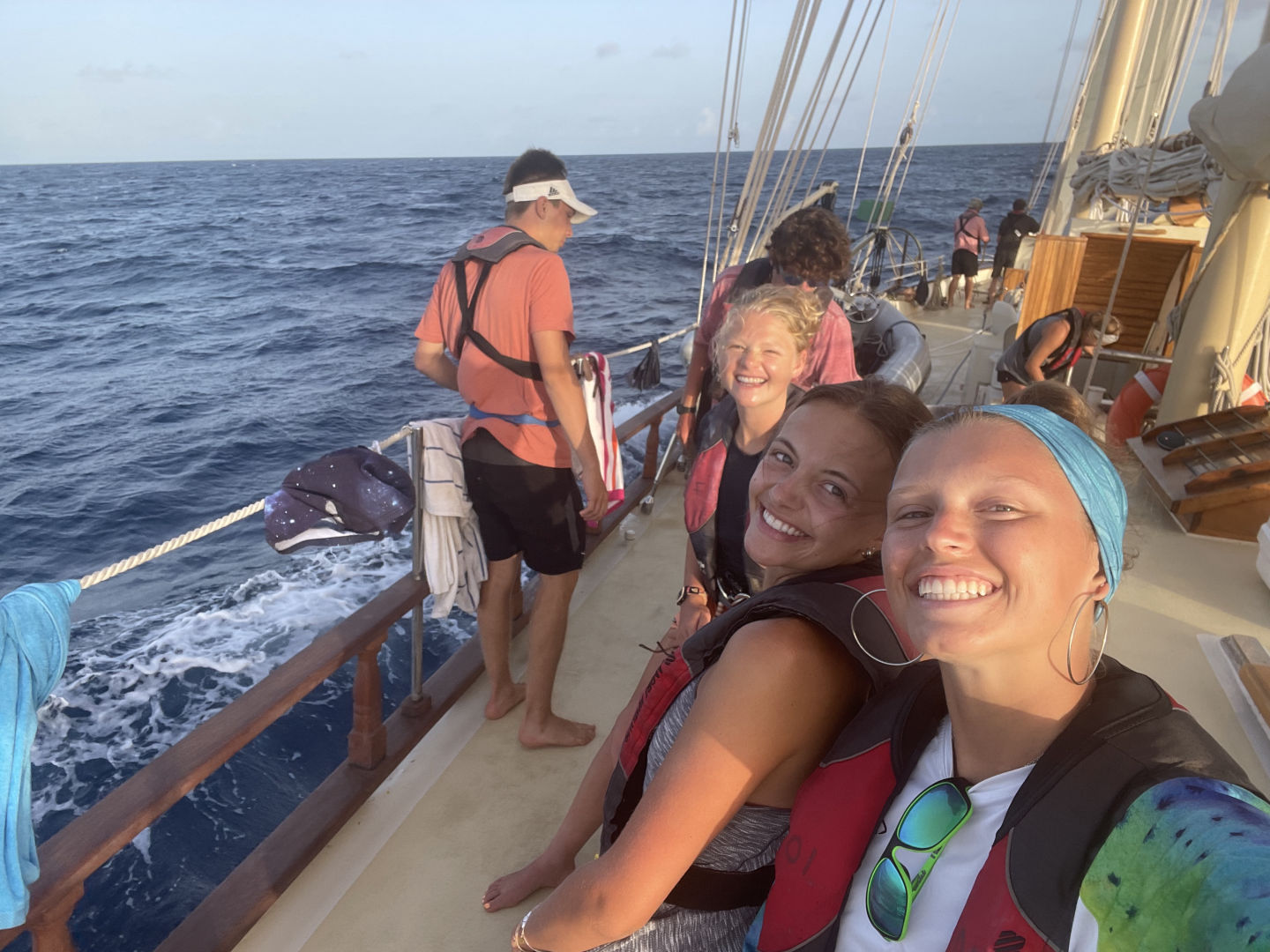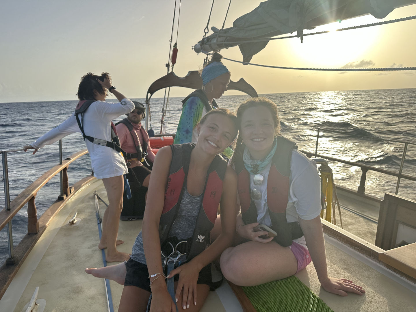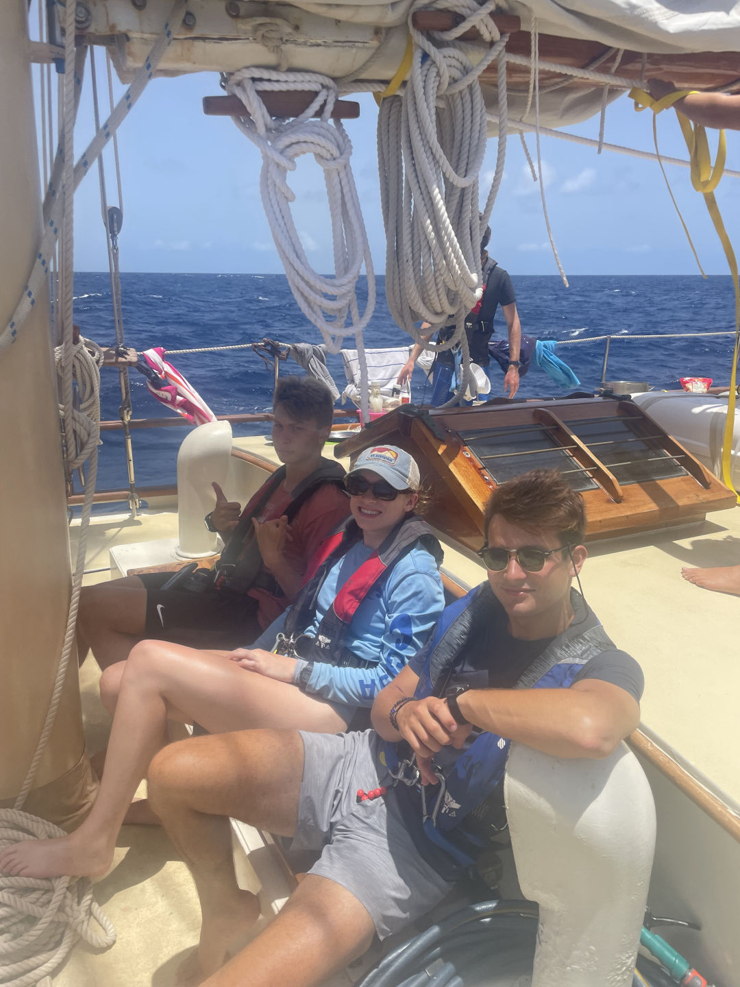 This morning we woke up a little scared (but excited!) in anticipation of our passage since our last passage was a little rough. We all took our Dramamine in hopes it saved everyone from getting seasick. I am very happy to say I have yet to get seasick this whole trip, but I feel for the people who got it bad last passage and hoped they did not have to experience that again. We ate a yummy breakfast and then did passage prep to prepare the boat for our passage. It took a lot less time than the last time because we are all learning what everything is called and how to do everything. We then lifted anchor and got on our way. After raising the sails (shout out to Beau and Sophie for leading), we all chilled on deck for a while listening to music and hanging out as we sailed. We had people at the bow watching carefully for moorings or anything else in the water because we did not want to end up with a fishing net in our prop again. We then ate a wonderful lunch and started watch teams. We also had a class on deck, but I think most of us were fighting sleep under sunglasses. Oops, sorry, Nick – love the class. We’re just so sleepy! It wasn’t on purpose! I was on the first watch team, and as soon as my shift was over, I went and took a nap, so not really sure what happened next… I woke up to a beautiful sunset, and we all ate dinner and enjoyed the view. I am very grateful to say the passage has gone extremely smoothly so far, and we are excited to be in Antigua in the morning. It is getting very sad thinking about leaving in a few days.