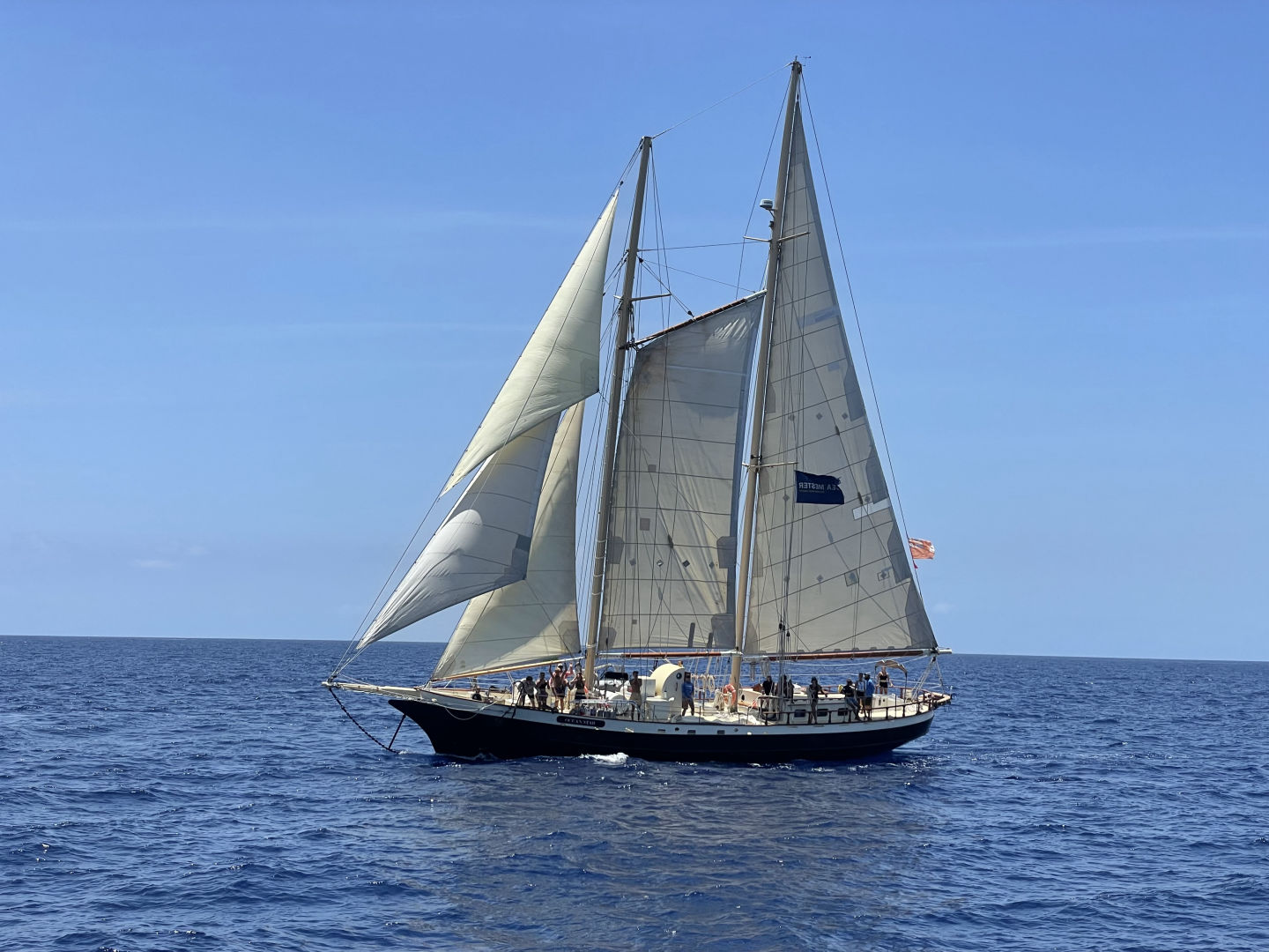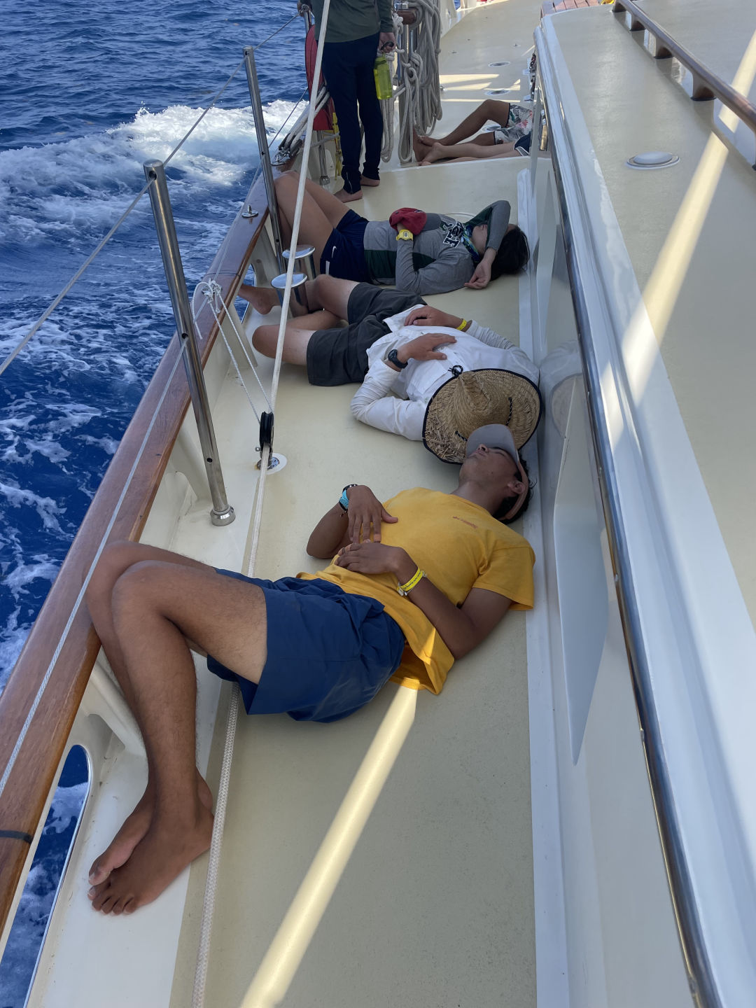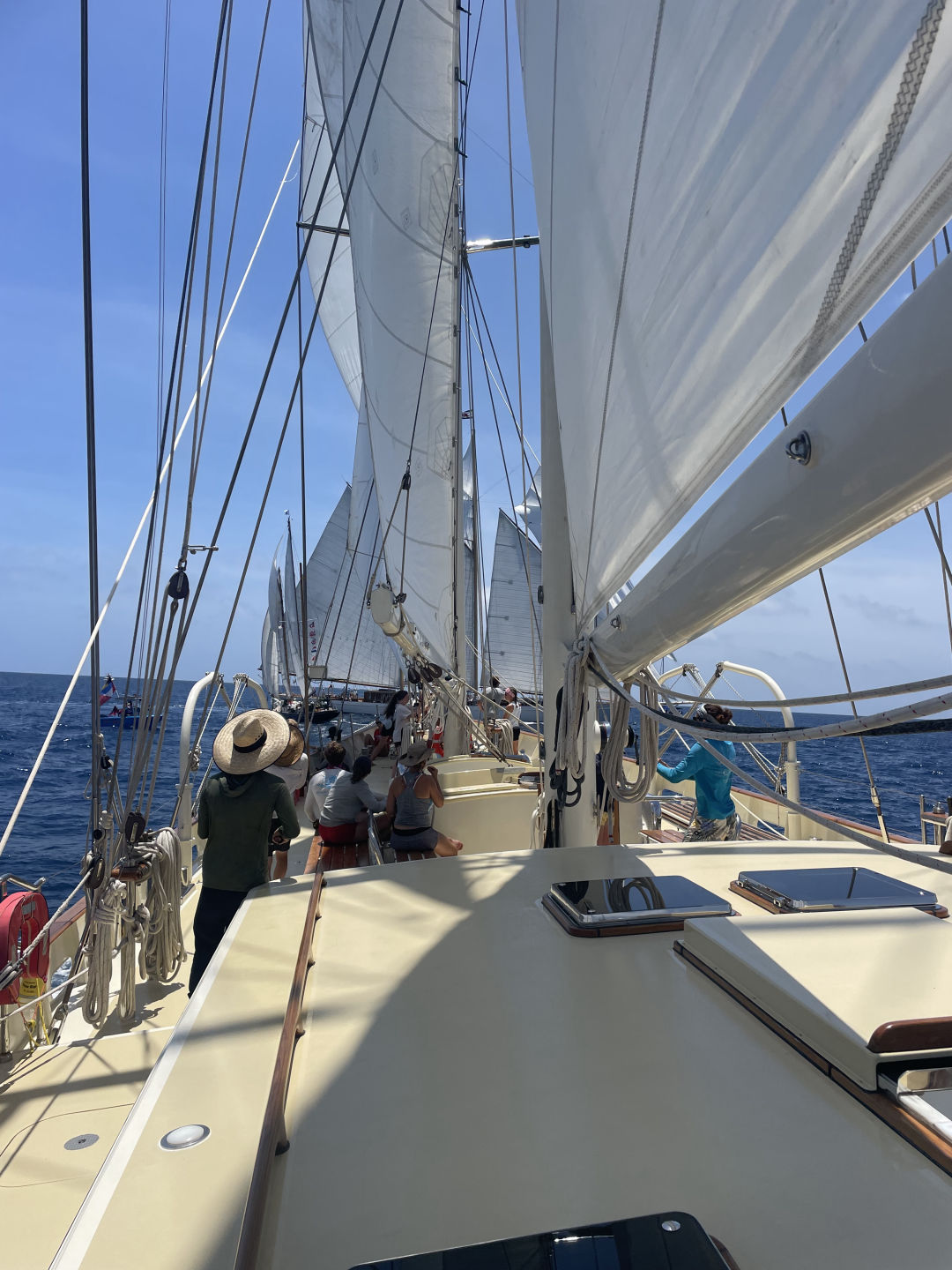 We are, of course, in the schooner category, and there are five other boats we are racing against. Thus far, we have not been the fastest boat in our category, but we have still been having so much fun tacking, jibing, snacking, dancing, and just generally having an enjoyable and relaxed time. Today, however, we still came in last, BUT we were actually ahead of Adix for the first few minutes, and we were square with the pack the entire time. Today’s course was a long (4 miles) beam reach course that required two full laps straight out and back. It was my personal favorite course because it meant that you got to pass lots of other boats as they were returning on their lap. It was awesome to see so many different boats up close, and everyone was very friendly, waving and cheering each other on. We had gorgeous sunny weather and good tunes, and by today our stations felt like second nature. The Jib team, main staysail team, flying jib team, and “main crew” have worked together so well these last few days, always hopping to when it’s time for a tack or jibe or any change in sail trim.