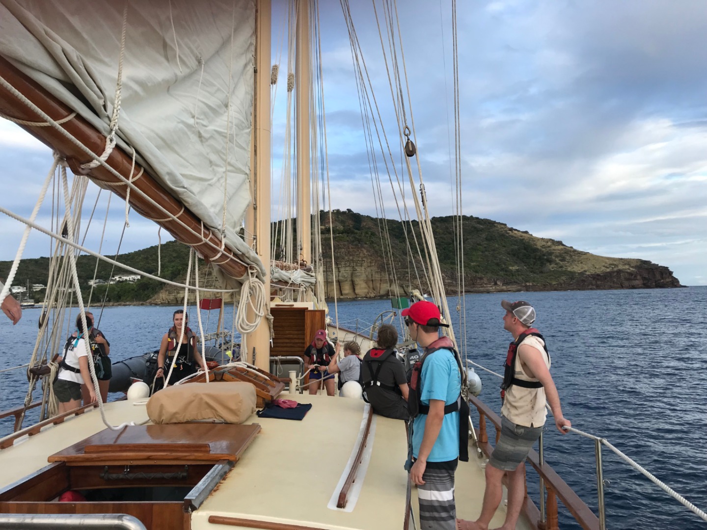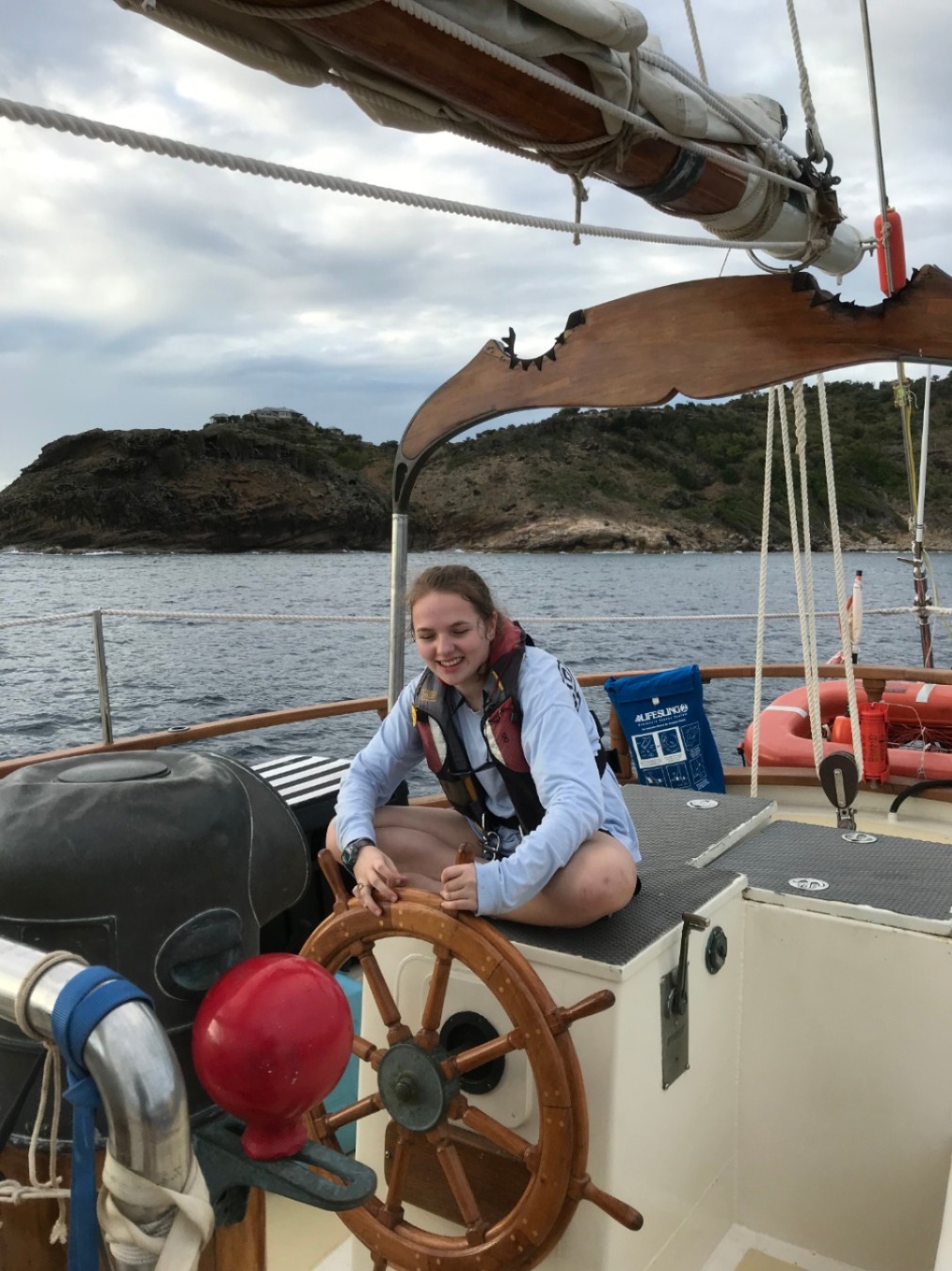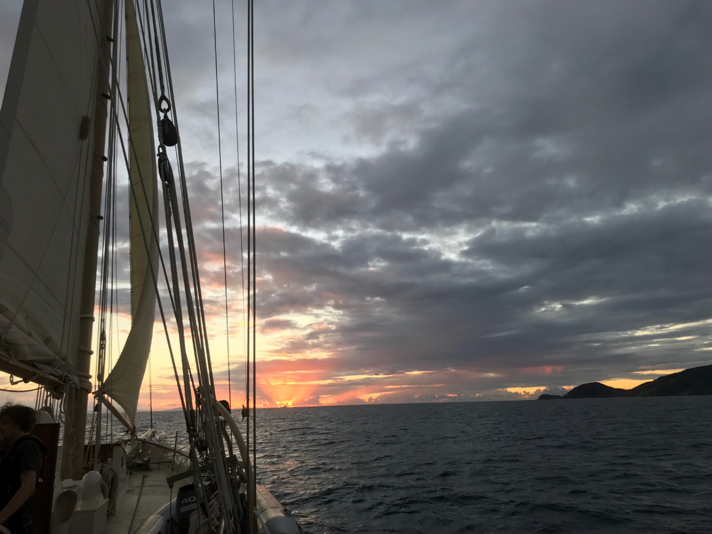 Our first day underway to the British Virgin Isles started with a hardy breakfast of croissants, muffins, and melon. After breakfast and cleanup, we dove right into preparing for our departure, going over line handling, passage prep, and the boat checklist to make sure everything was secure and functional before our voyage. We then ate chickpea salad prepared by the infamous Tina before heading to the fuel dock. Leaving the dock was a process, having to pick up multiple anchors and make sure everything on the boat was secure and ready to sail. After several hours of instructions, checklists, and waiting, we were finally ready to leave the marina… and put up our sails. I had the job of keeping the boat into the wind while the rest of the crew worked together to raise the sails by using a “2-6” counting method. While we finished putting up the sails, Tina was down in the galley preparing beef soup and biscuits to strengthen our stomachs before our first night in the open ocean. After eating, we were split into two watch teams taking 4-hour shifts through the night and the rest of our time underway to steer, watch for traffic, and perform hourly boat checks to make sure everything was running smoothly. We have yet to encounter any rain squalls or rough seas, so wish us luck on the rest of our one and a half day crossing to the British Virgin Isles.