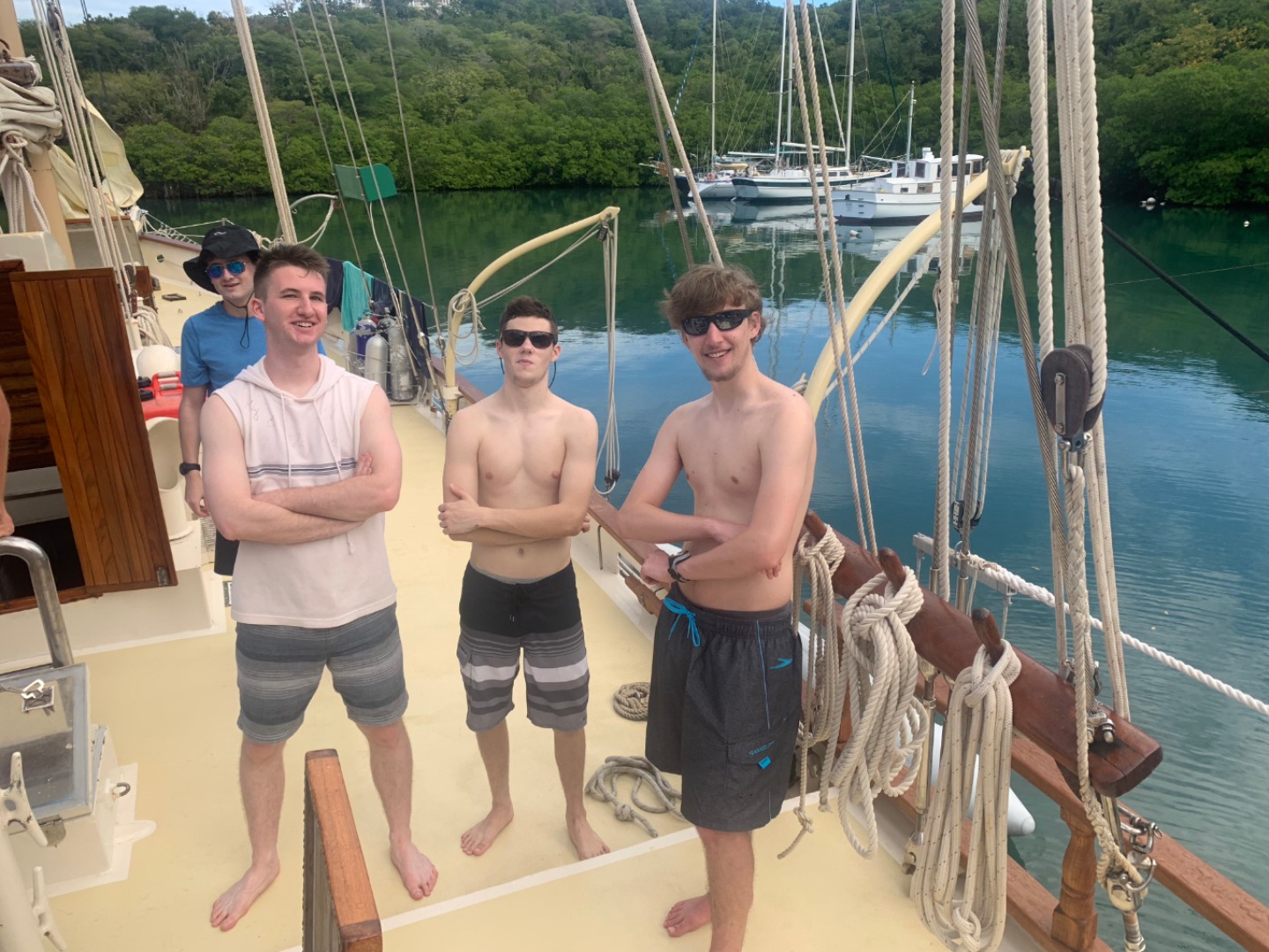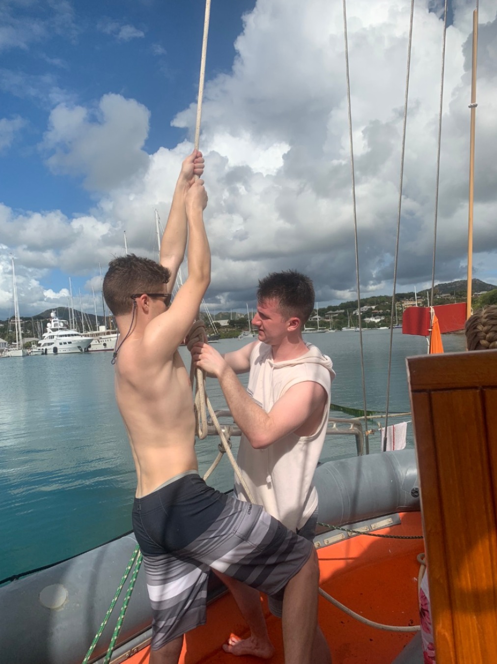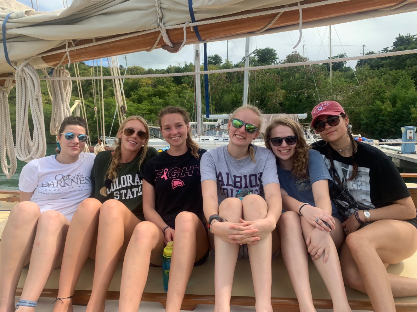 Our first day underway to the British Virgin Isles started with a hardy breakfast of croissants, muffins, and melon. After breakfast and cleanup, we dove right into preparing for our departure, going over line handling, passage prep, and the boat checklist to make sure everything was secure and functional before our voyage. We then ate chickpea salad prepared by the infamous Tina before heading to the fuel dock. Leaving the dock was a process, having to pick up multiple anchors and make sure everything on the boat was secure and ready to sail. After several hours of instructions, checklists, and waiting, we were finally ready to leave the marina… and put up our sails. I had the job of keeping the boat into the wind while the rest of the crew worked together to raise the sails by using a “2-6” counting method. While we finished putting up the sails, Tina was down in the galley preparing beef soup and biscuits to strengthen our stomachs before our first night in the open ocean. After eating, we were split into two watch teams taking 4-hour shifts through the night and the rest of our time underway to steer, watch for traffic, and perform hourly boat checks to make sure everything was running smoothly. We have yet to encounter any rain squalls or rough seas, so wish us luck on the rest of our one and a half day crossing to the British Virgin Isles.
