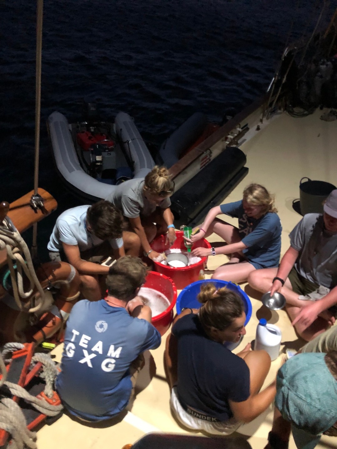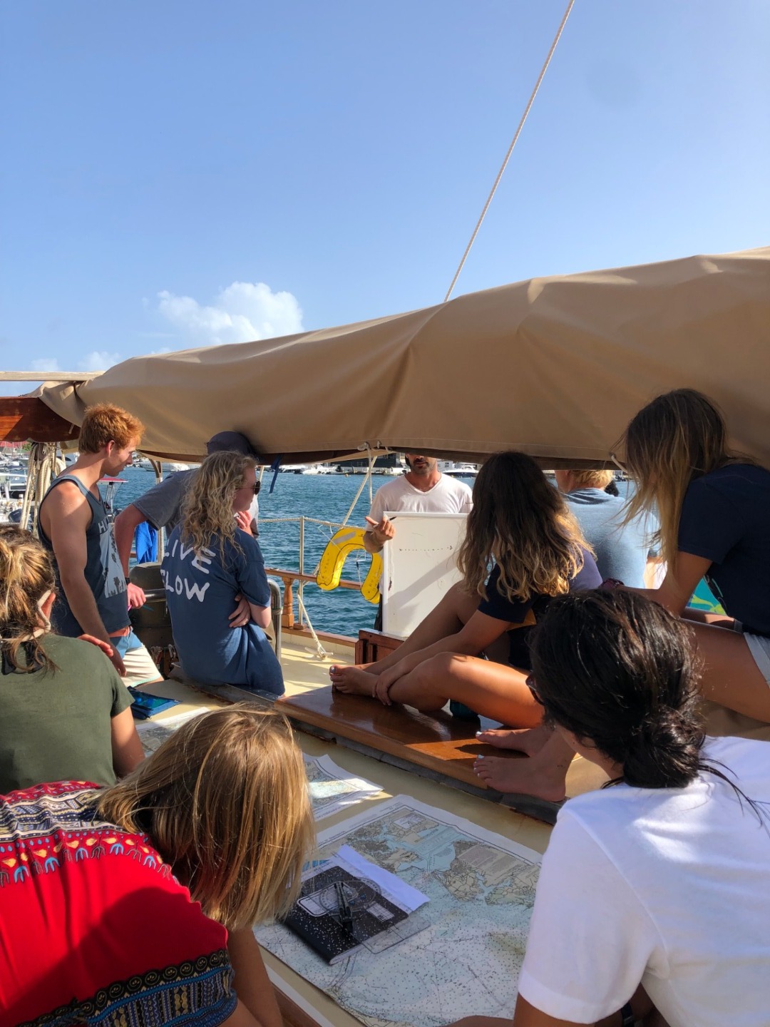 After a full morning of diving, things slowed down in the afternoon with our Oceanography class and Seamanship class, where we continued to work on our navigational skills with the maps. In navigation class, we are learning how to counter for the effects of currents on the boat’s position, known as the set and drift. This evening is providing our last chance to wander aimlessly around St Barths. There is even live music playing on the dock.