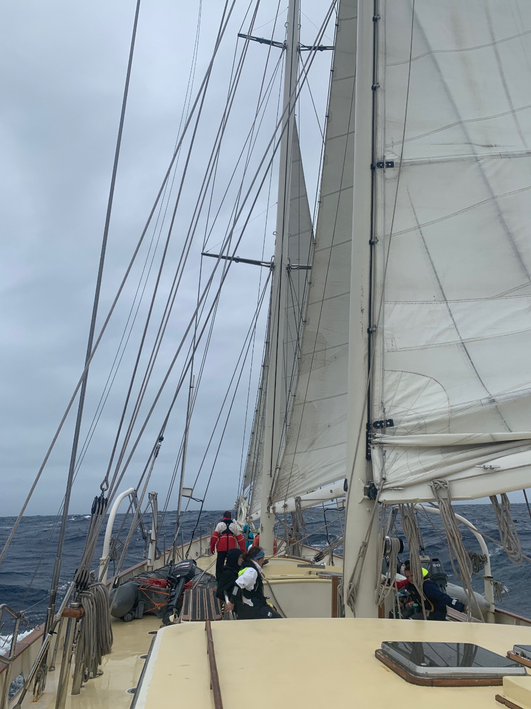 Today was also the first time we had class while making way. Everyone was either exhausted from watch or feeling a bit under the weather. It was challenging to focus while the boat was constantly moving. This was probably the first time any of us started to appreciate normal classroom lecture settings back at home. We were all able to stick it out for class as we have been doing since we left Cape Town. The first few days are rough, but everyone seems to be persevering. None of us would reach our goals if it was easy. We’re cultivating courage in ourselves and one another on this crossing so far.