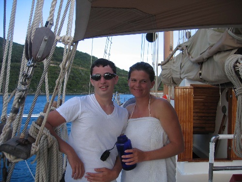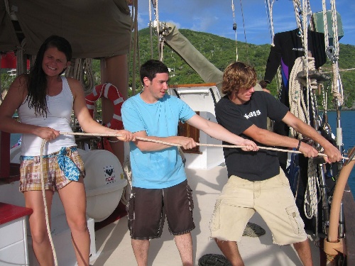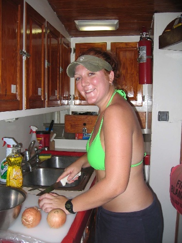 This morning, we were up and eating breakfast at 07:30 – Scotty made breakfast burritos. They were great. Then we had to do a clean-up and get ready for the day. The day consisted of a morning dive class for the nine beginner divers while the others trekked up a huge mountain. Then we had lunch, again prepared by the fabulous Scotty and master sous chef the Danimal. Grilled cheese and tomato soup – yum. After lunch, the beginner divers got to breathe underwater for the first time and had their first dive lesson underwater. The already certified divers got to go snorkeling and learned to drive the dinghy. After diving and snorkeling, we had some free time, a.k.a. shower time, before dinner, which was Sheppard’s pie and salad. We all then had dive class in the evening and then free time. Today was awesome.
