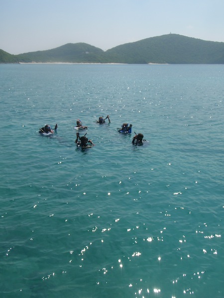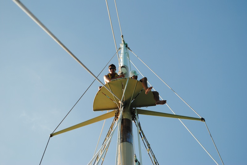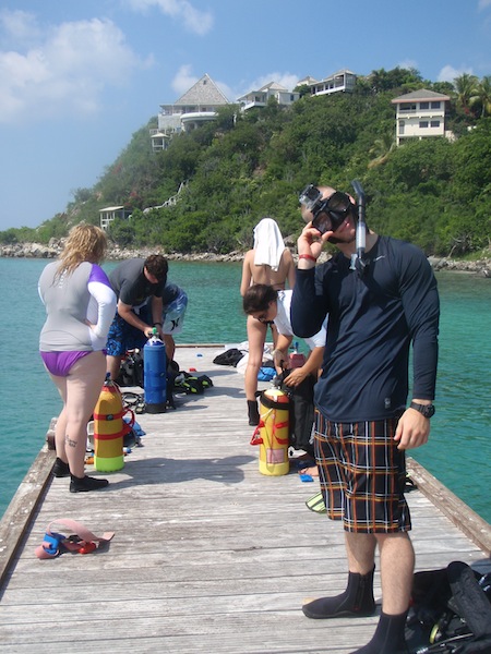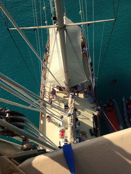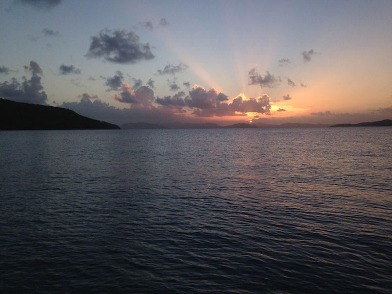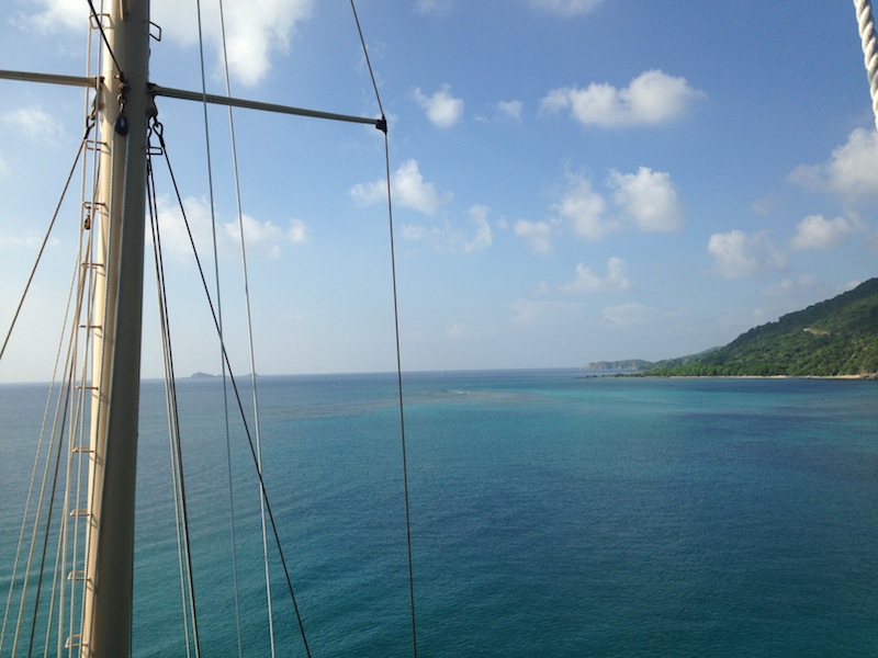 Today was a very exciting day aboard Ocean Star. After finishing up some of the PADI dive videos and knowledge reviews, it was time for the new divers to try out scuba for the first time. Everyone learned how to assemble and don their gear and took their first giant stride into the water for their confined water dives. Practicing mask and regulator skills was challenging but very rewarding. Those of us who are already certified got to jump into the turquoise water for a checkout dive. We warmed up with a soup lunch and then dove some more in the afternoon. After all the diving, we came back to the boat and hung out until dinner. A few brave shipmates climbed up to the crow’s nest for a birds-eye view of the islands. Everyone is starting to get used to showering in the ocean. After watching a beautiful sunset, we ate a delicious vegetable curry dinner. We then learned more about the boat and our responsibilities: cooking in the galley, plotting our position, checking the bilges, and using proper nautical terminology. Now, we are ready for a good night’s sleep and are looking forward to more diving and adventures tomorrow.