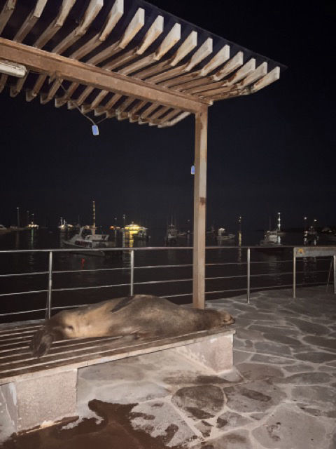 So we finally arrived in Galapagos, and let me tell you, it’s something really special. The first day we woke up at 06:00 and did an early breakfast, and made Vela look pretty cause costumes were coming onboard the boat to clear us into the country as well as make sure we didn’t bring any shells and other biological materials into Galapagos. While the costumes were clearing us in, we had a marine biology class on deck, followed by some free time. After lunch, we had some time to get ready. cause we were about to step foot on Galapagos for the first time (for most of us). When arriving in the harbor by water taxi, they told us to walk fast cause there were sea lions lying all over the dock. So with a decent speed, we walked onto the dock to get our first look at San Cristobal. Believe me, when I say there were hundreds of sea lions everywherelying on the beaches, in the water, and relaxing on the rocks accompanied by many big bright orange crabs. Within our first 10 minutes in Galapagos, we were exposed to such rich and amazing wildlife. We split into groups, as we almost always do, cause 24 people walking around together gets a little crowded. I walked off with Morana, Magdi, and Saskia to explore the beautiful new city we were in. We arrived at a beach filled with so many sea lions, and they were so smelly and loud. We stuck around a watched them for a while, just observing them enjoying themself, before we sat down at a cafe. We sat down on a balcony and got some cold drinks while being surrounded by sea lions. After a while, we decided to continue our exploring cause the sun where burning os at the cafe. We met up with more people outside of a souvenir shop, where we got milkshakes, before slowly walking towards the restaurant, where we all met up for a lovely but long dinner. Most people ordered sushi, which took ages before arriving, so some of us decided to return to the boat. Ula, Magdi, Elise, and I walked back to the dock to find that all the sea lions were sleeping on the dock benches. There were no water taxis in sight, but a private dingy came up on the dock, and Ula (with her kind smile) made the man sail us back to Vela, and he sailed fast, which was a lot of fun. We quickly took showers because we were leaving as soon as the rest of the group came back.