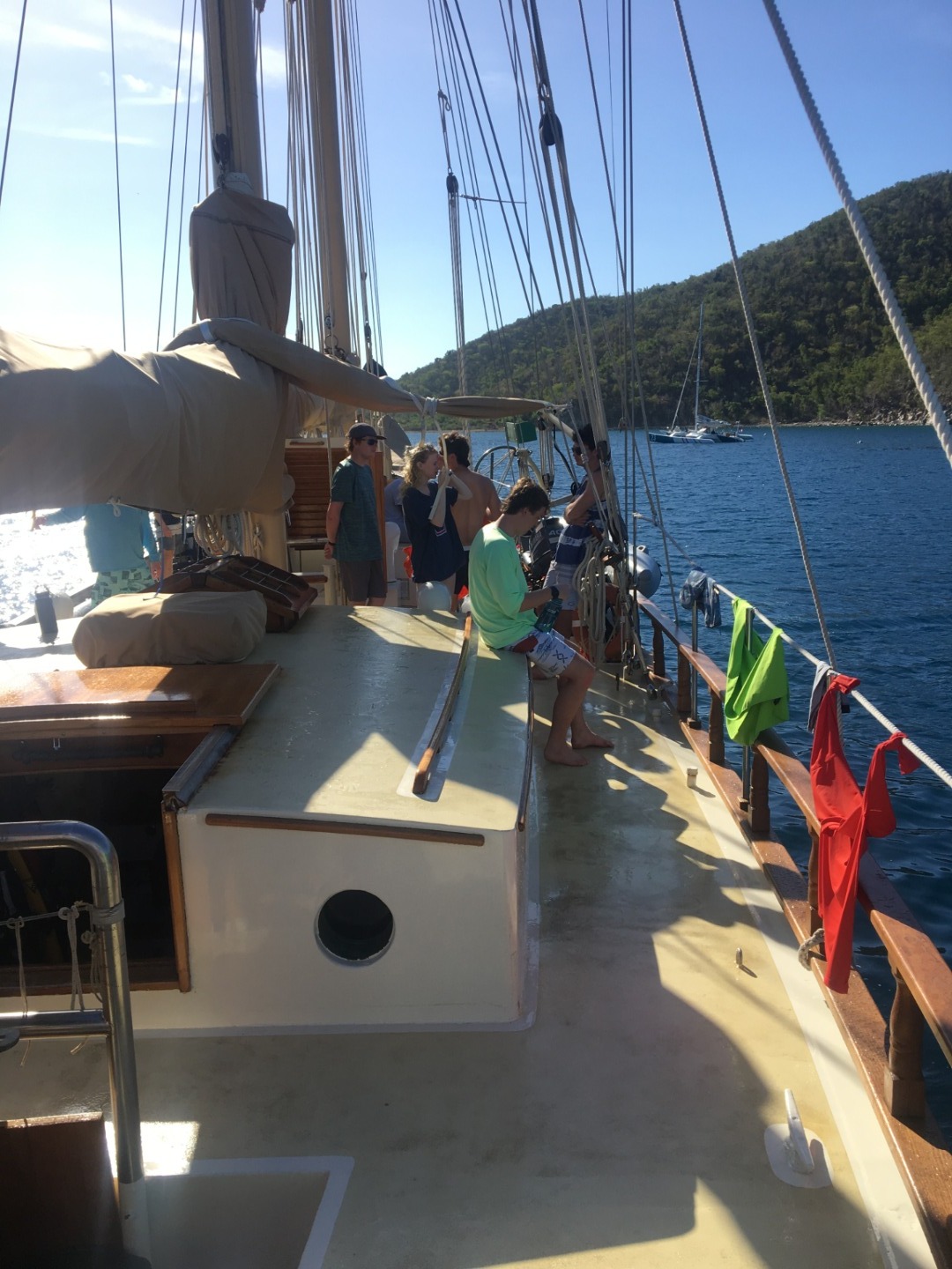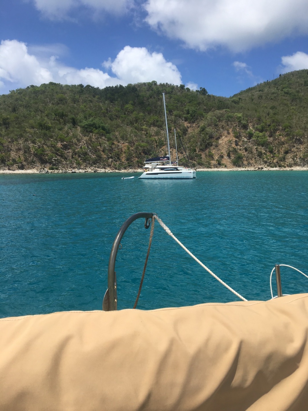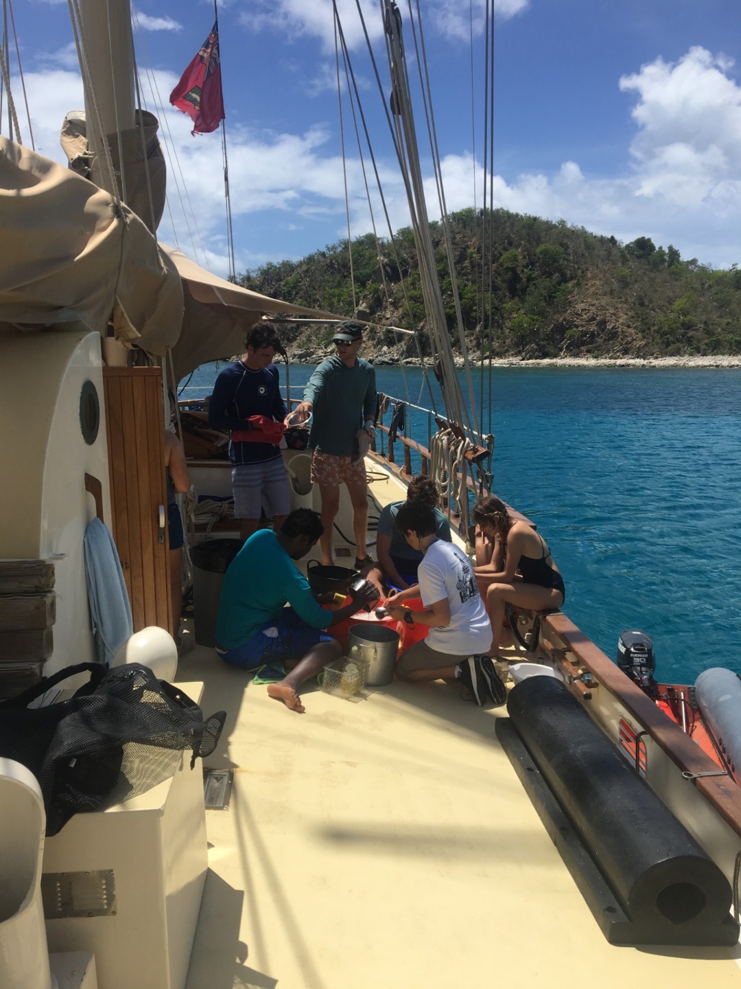 I started today off incredibly early. I was on night watch from 2:00 am-3:00 am. It was everyone’s first-night watch on Ocean Star, and we were all a bit skeptical about how the night was going to play out. Thankfully, we were on a mooring off the coast of Peter Island, and the winds were calm all night, so it was difficult for anything to go wrong. The night watch was a little stressful but feeling completely alone on the boat for the first time ever was so peaceful and calming. I went back to sleep at 3:10 and, as skipper, prepared to wake up the rest of the crew at 7 am. Breakfast was delicious, and as soon as chores were complete, we motored off towards Mountain Point. As soon as we got to Mountain Point, Steve spotted a good place to anchor. Unfortunately, some chartered catamarans had spotted our ideal anchor location as well. As we headed towards it, they increased their speed and cut us off. No one on board was too pleased with their behavior, and so I included some photos of the boats to shame them slightly publicly. After anchoring, it was more PADI videos for the folks getting open water certified and some water tests for the rest of the certified crew. Finally, the open water crew completed our 3rd video chapter, learned about our gear, and we were able to get on some dinghies and head towards a small beach area off Mountain Point. Taking my first breath underwater was the most magical feeling I have ever experienced. Some of the tests were a little scary, and lots of saltwater got into my nose and eyes, but minor inconveniences aside, the experience was incredible. As soon as we started going through the required skills, a huge school of baby bar jack swam up to us and teased us, darting from one diver to the next. The open water crew finished more than was expected for the first time in the water and headed back to the boat, where a heated game of UNO was taking place. More games and intense chess matches ensued. Dinner was veggie curry, and as I write this, the certified divers are taking a night dive right outside the boat.